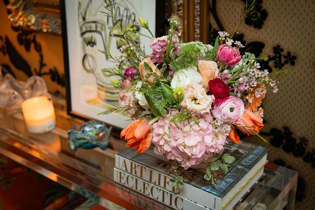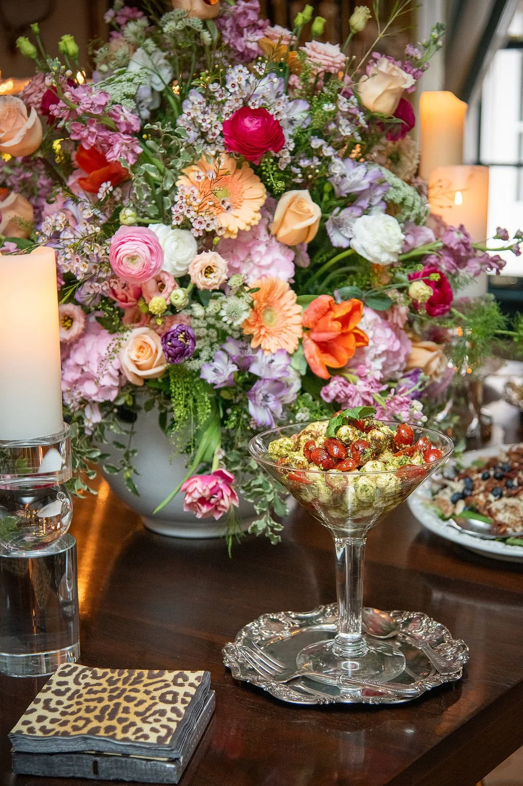 I always go overboard with the flowers and they were extraordinary...a gorgeous arrangement with a mix of peach, pink, fuchsia, orange and cream. Ranunculus, roses, gerber daisies, tulips and lisianthus...it was the kind of arrangement that makes you stop and just look. Pillar candles in crystal holders flanked the arrangement and cast the most beautiful light across the dining room all evening. When you get the flowers right, everything else falls into place.