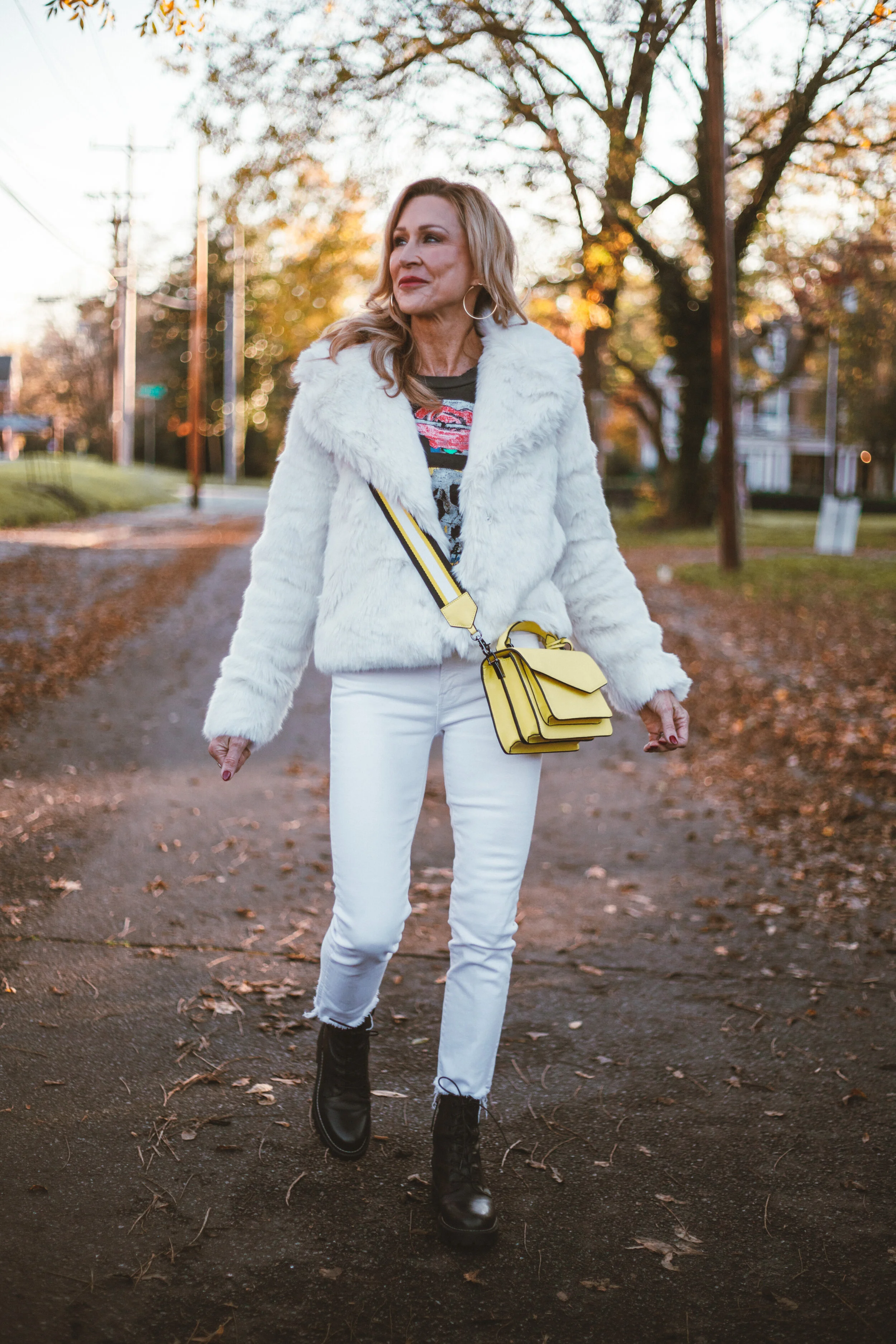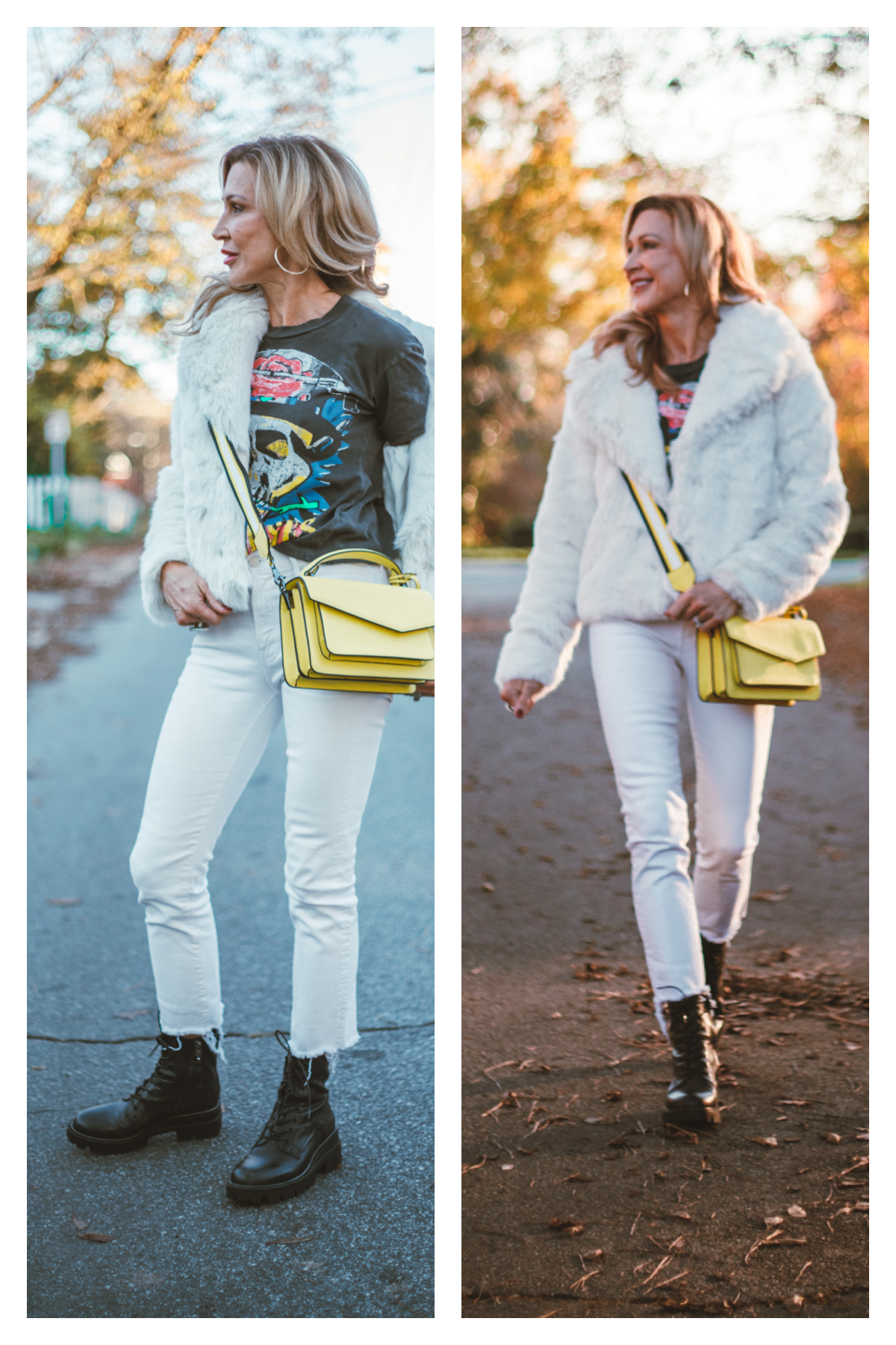 This cute faux fur coat might be one of the most versatile pieces I own. It’s perfect with a graphic tee, white jeans and combat boots, but would be fabulous over a dress for a holiday party!