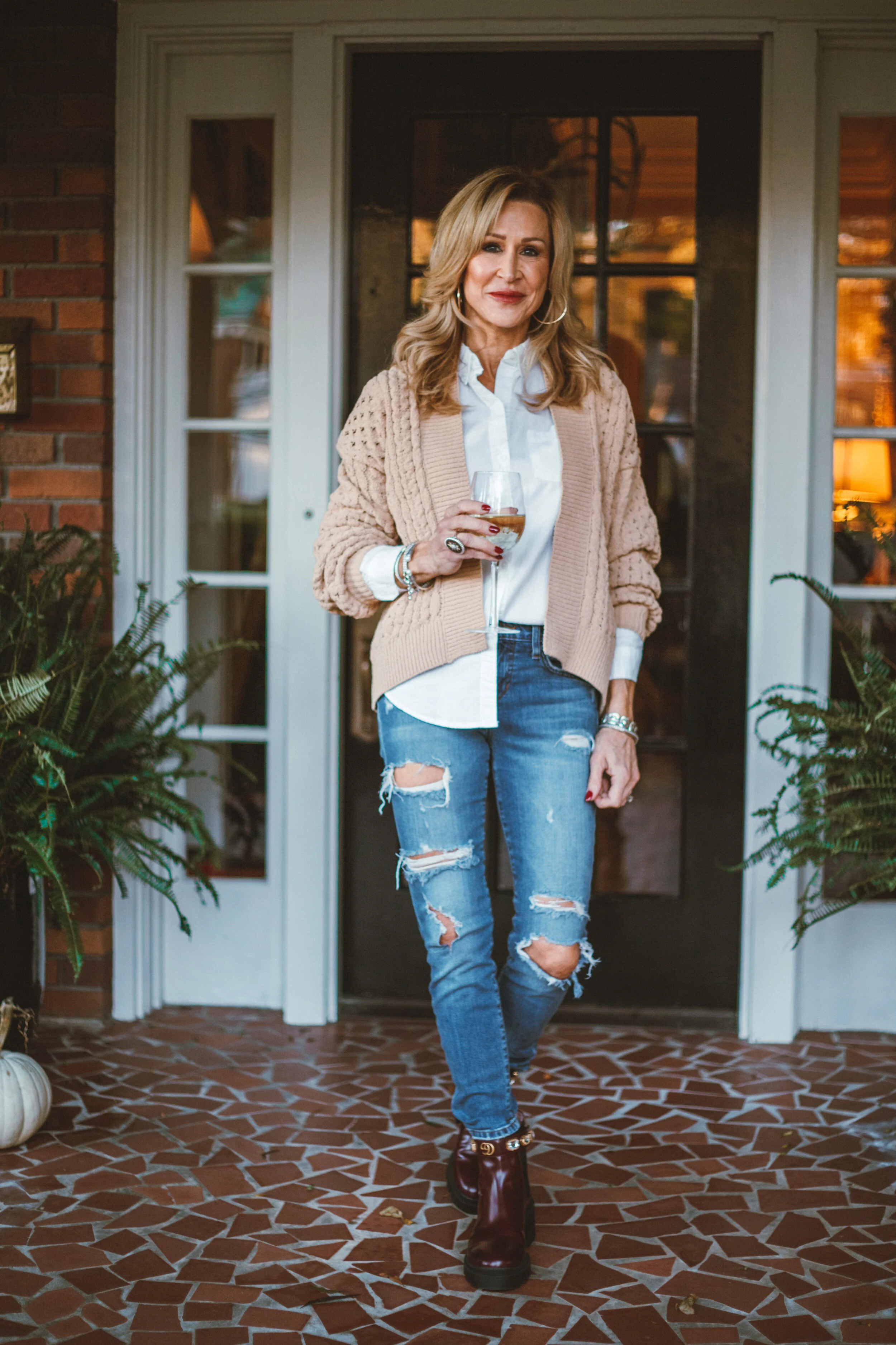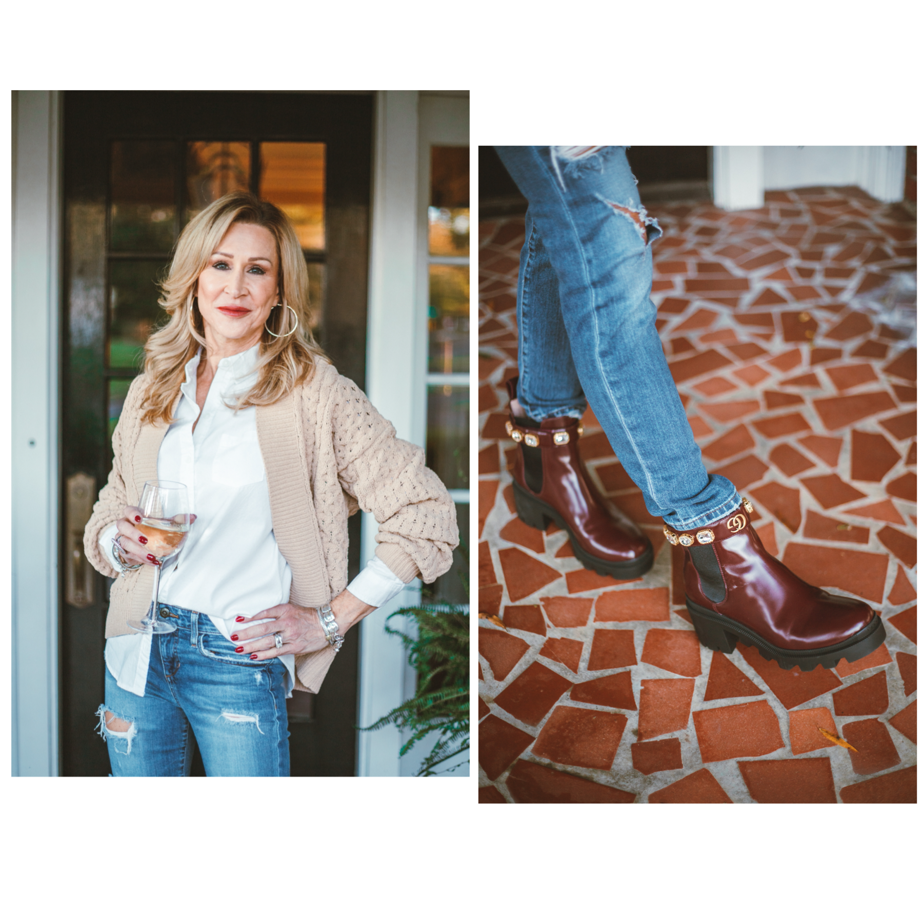 My last casual look combines jeans that i’ve had forever with a new white button down blouse from Target, a cardigan sweater from Abercrombie and my splurge…new Gucci boots.