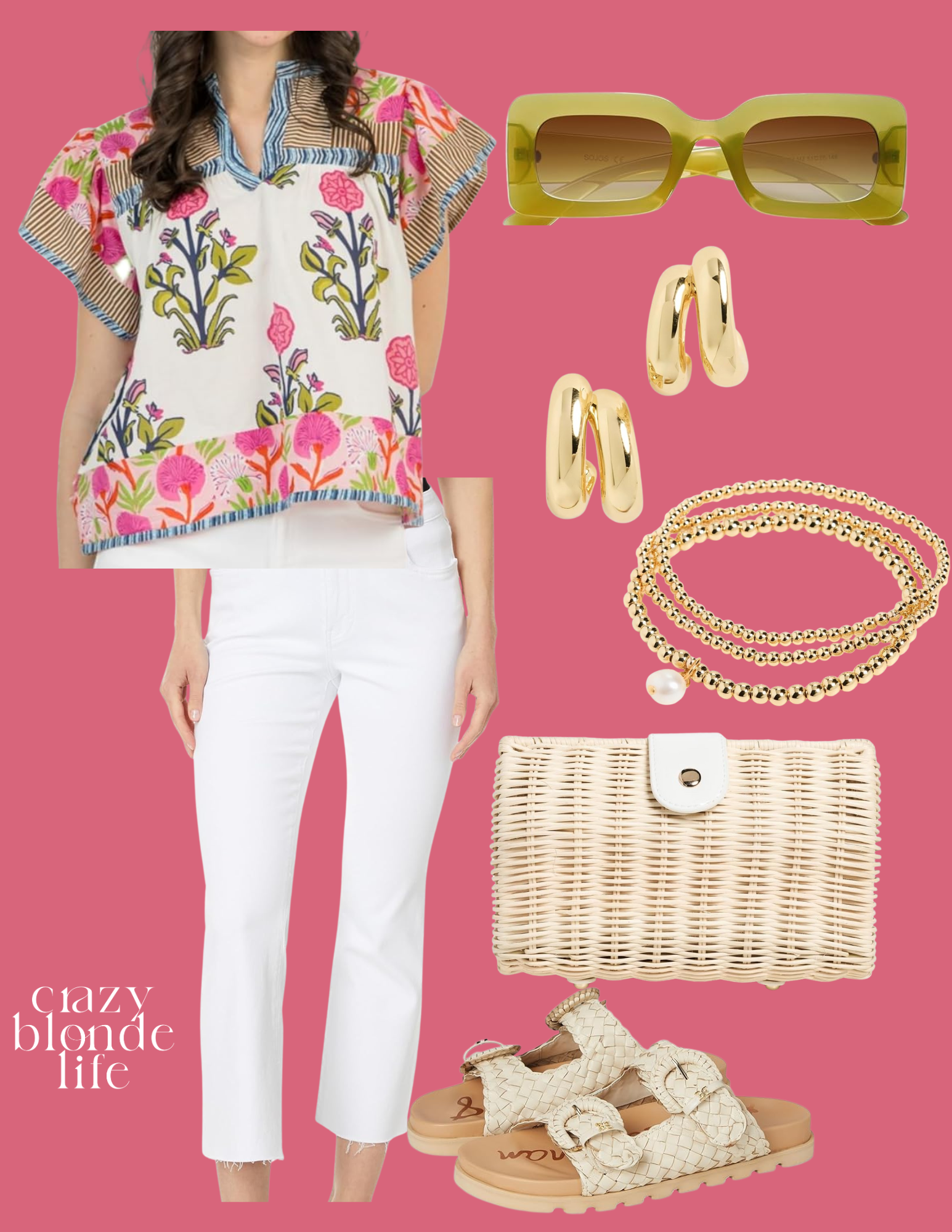 //Floral Top//Green Sunglasses//Gold Earrings//Gold Beaded Bracelet//Rattan Bag//Woven Sandals these also come in gold and are fabulous!)//White Jeans//