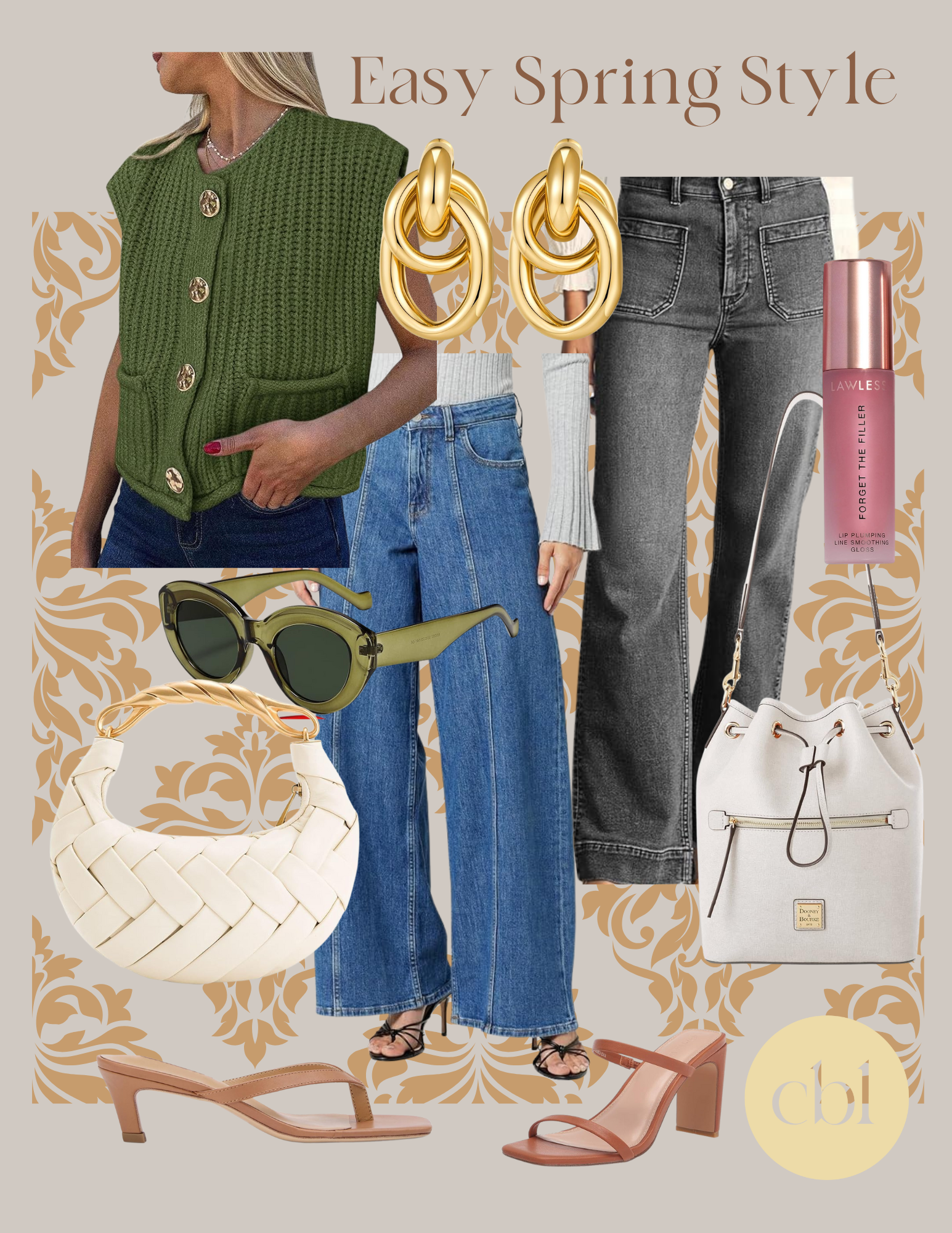 //Green Sweater Vest//Gold Earrings//Grey Wide Leg Jeans//Wide Leg Jeans(I would size down in these)//Green Sunglasses//Cream Bag with Gold Handle//Tan Kitten Heel Sandals//Tan Block Heel Sandals//Dooney & Bourke White Drawstring Bag//