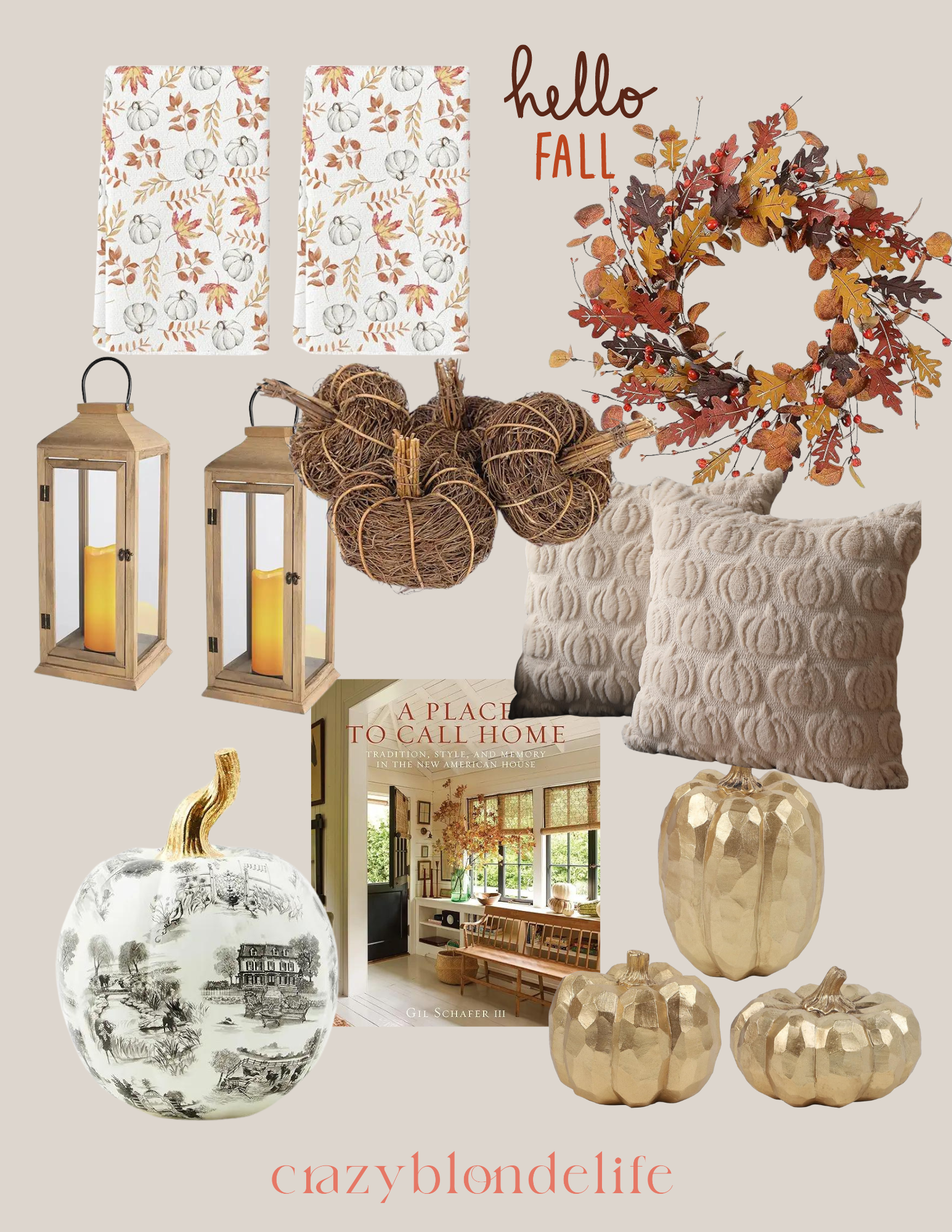//fall dish towels//fall wreath//pumpkin pillows//raffia pumpkins//lanterns//Mackenzie Childs pumpkin//decor book//gold pumpkins//