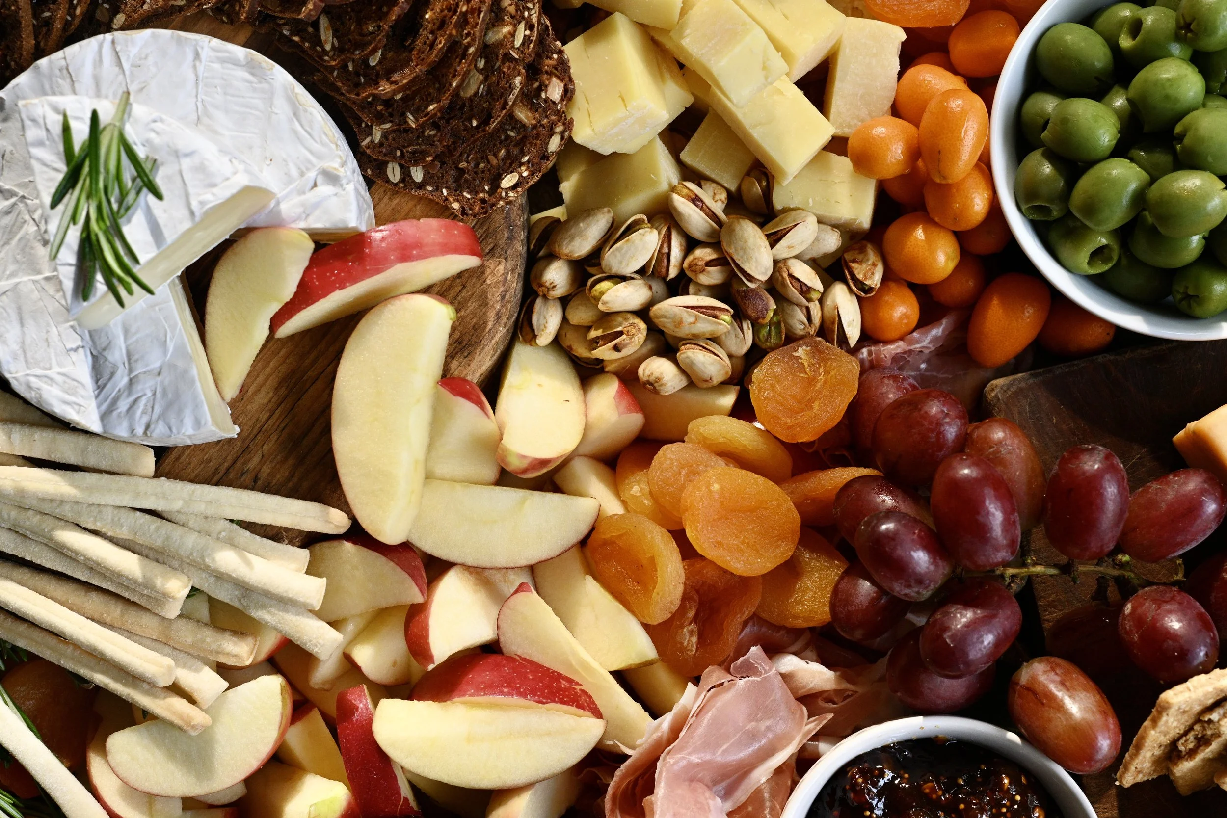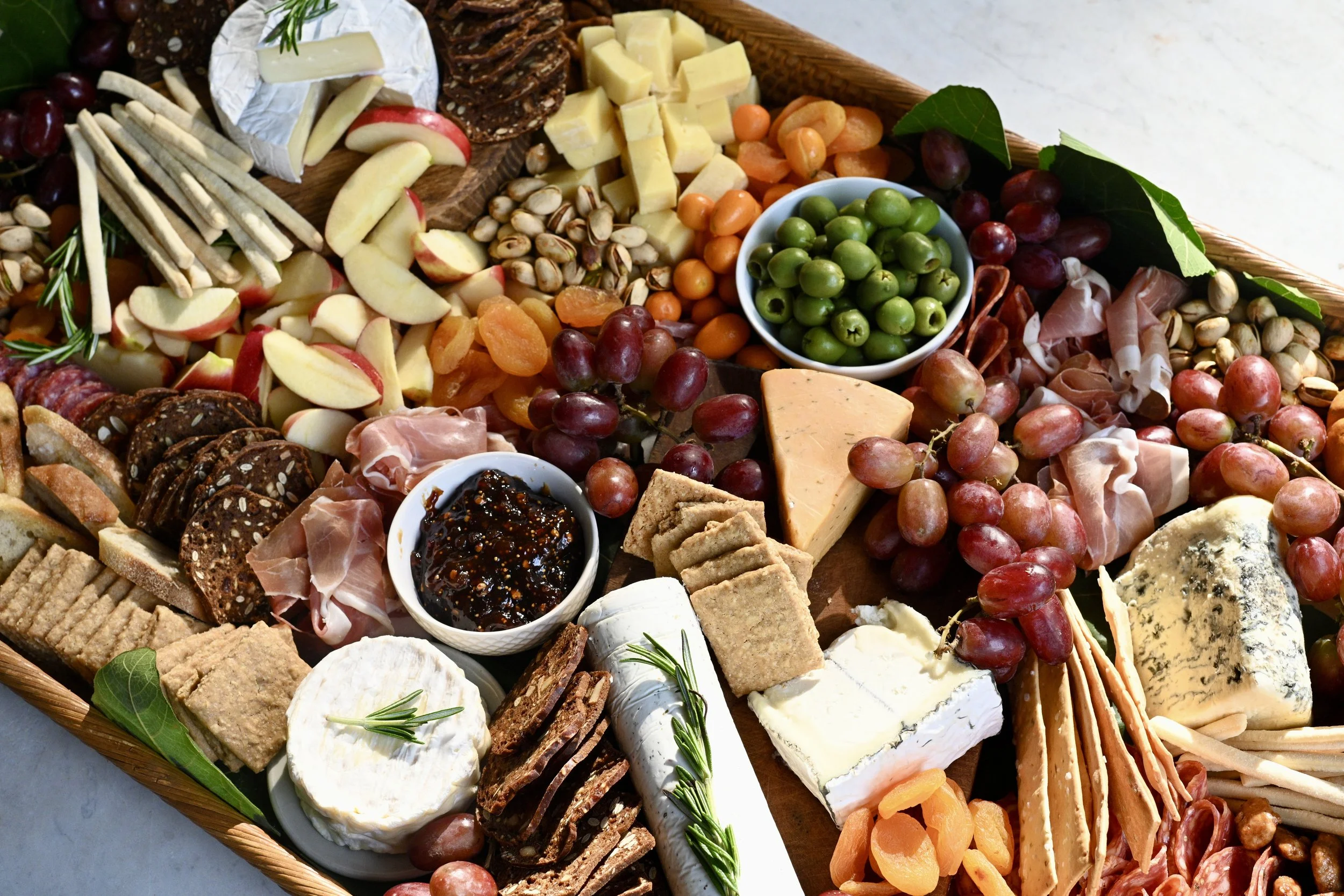 Once I’ve lined the basket or layered in fresh herbs or leaves, I begin by placing the cheeses and the bowls. The cheeses are the stars of the show, so I like to use a mix of shapes and sizes - some whole, others cut into slices or cubes to create the most interesting presentation.