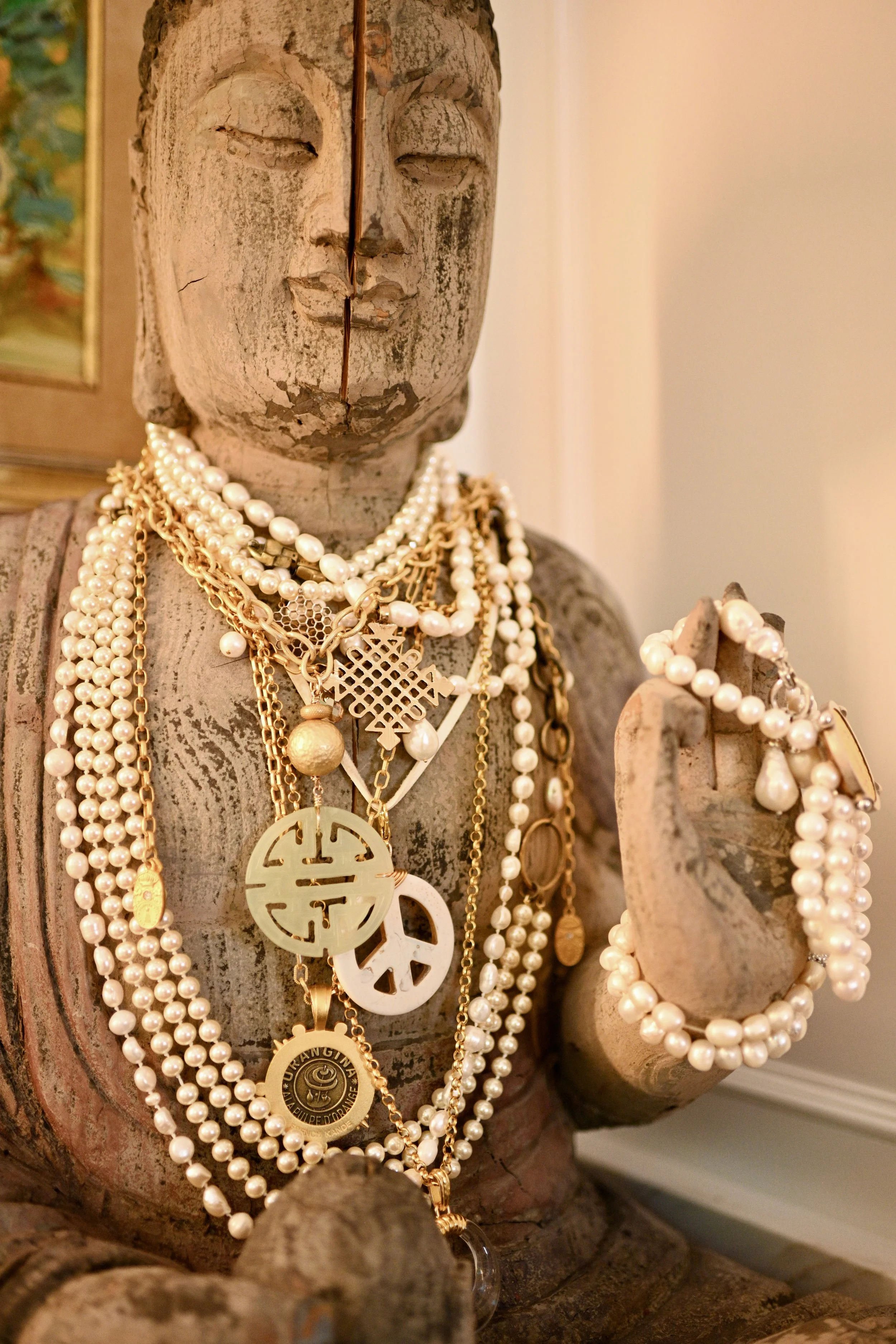 Itβs fun to think of unusual ways to store and display your belongings. I draped my Buddha in long necklacesβ¦itβs beautiful and functional!