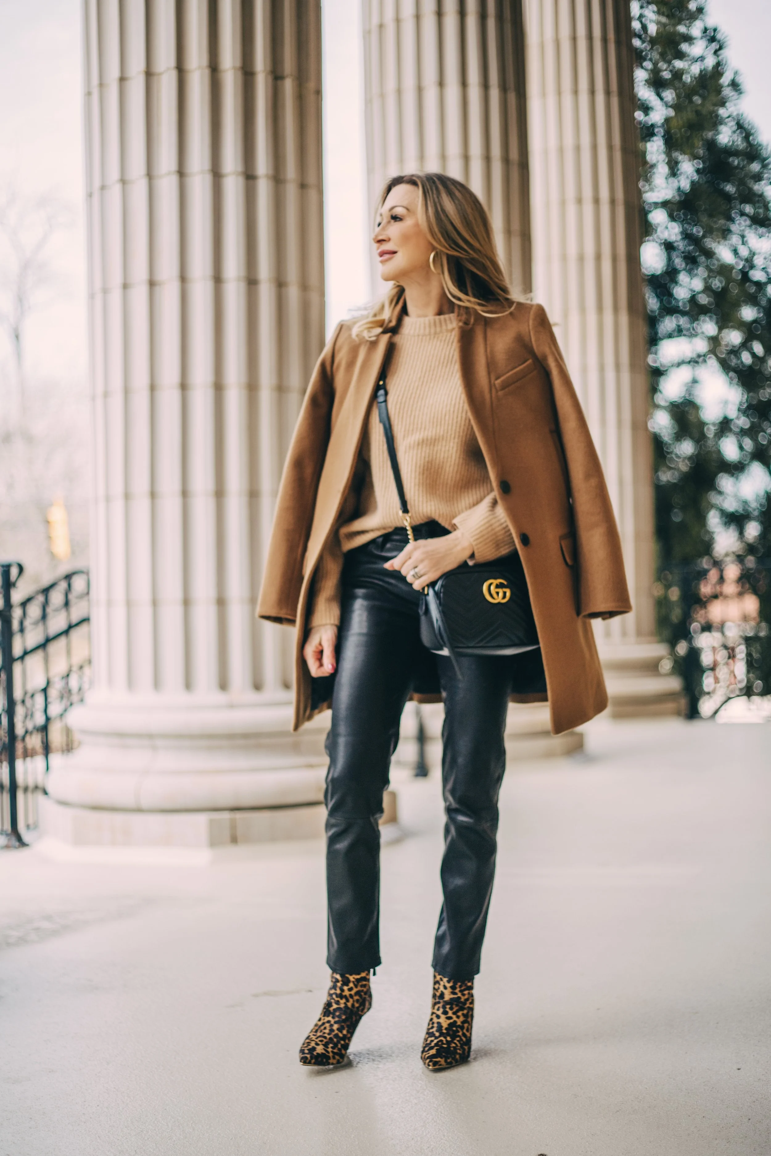 Camel goes with so many different colors and is considered a neutral and I always love it with leopard and black, of course. However, camel also looks great with dark green, shades of red and navy just to name a few. I would also substitute a striped sweater and jeans instead of the black leather pants and camel sweater for a whole different look.! I love leopard with stripes! Play with your clothes…search Pinterest for outfit ideas and have fun!