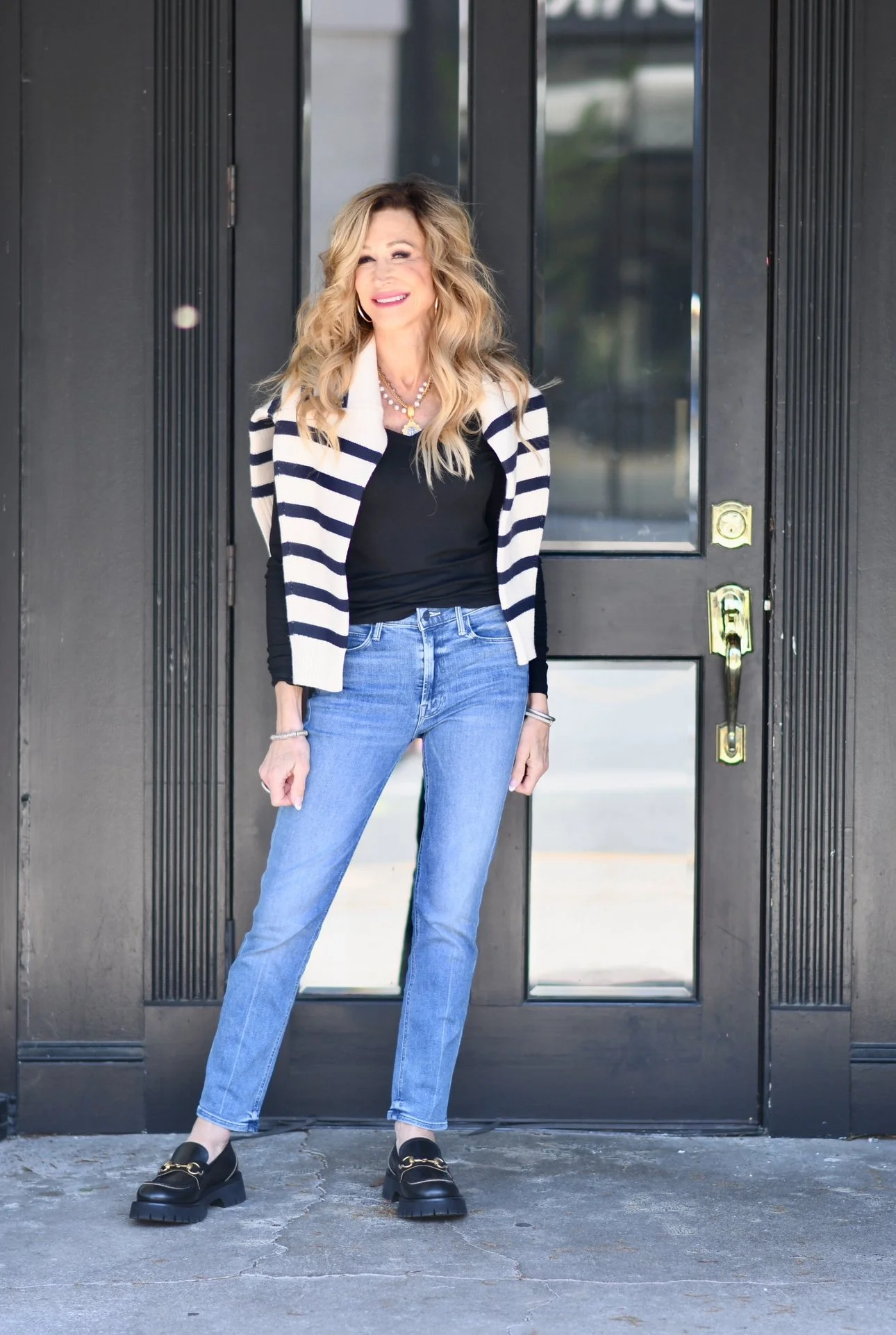 I will never get tired of my skinnier jeans and these from Mother are one of my favorite styles! I just ordered another pair because mine are almost worn out! The narrower leg is perfect with so many different shoes and they are a lower rise which, honestly is more comfortable for my body type. This look is made up of closet essentials and comes together easily. Use any sweater to throw over your shoulders to change up the look!