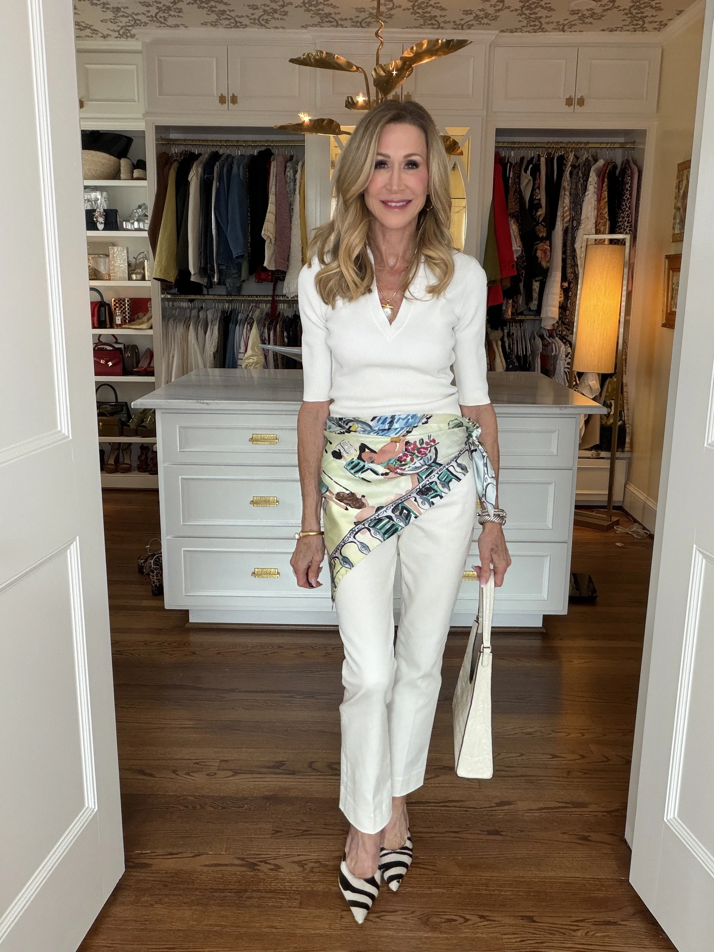 //Ecru Pants//Zebra shoes (similar)//Scarf (similar)//Top (similar)//Bag (similar)//