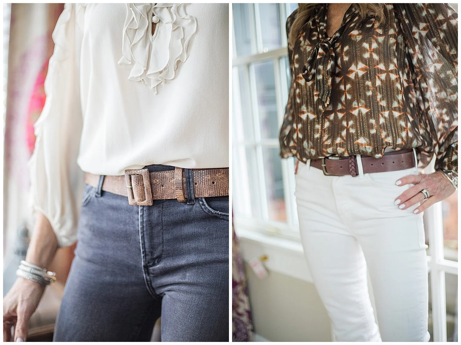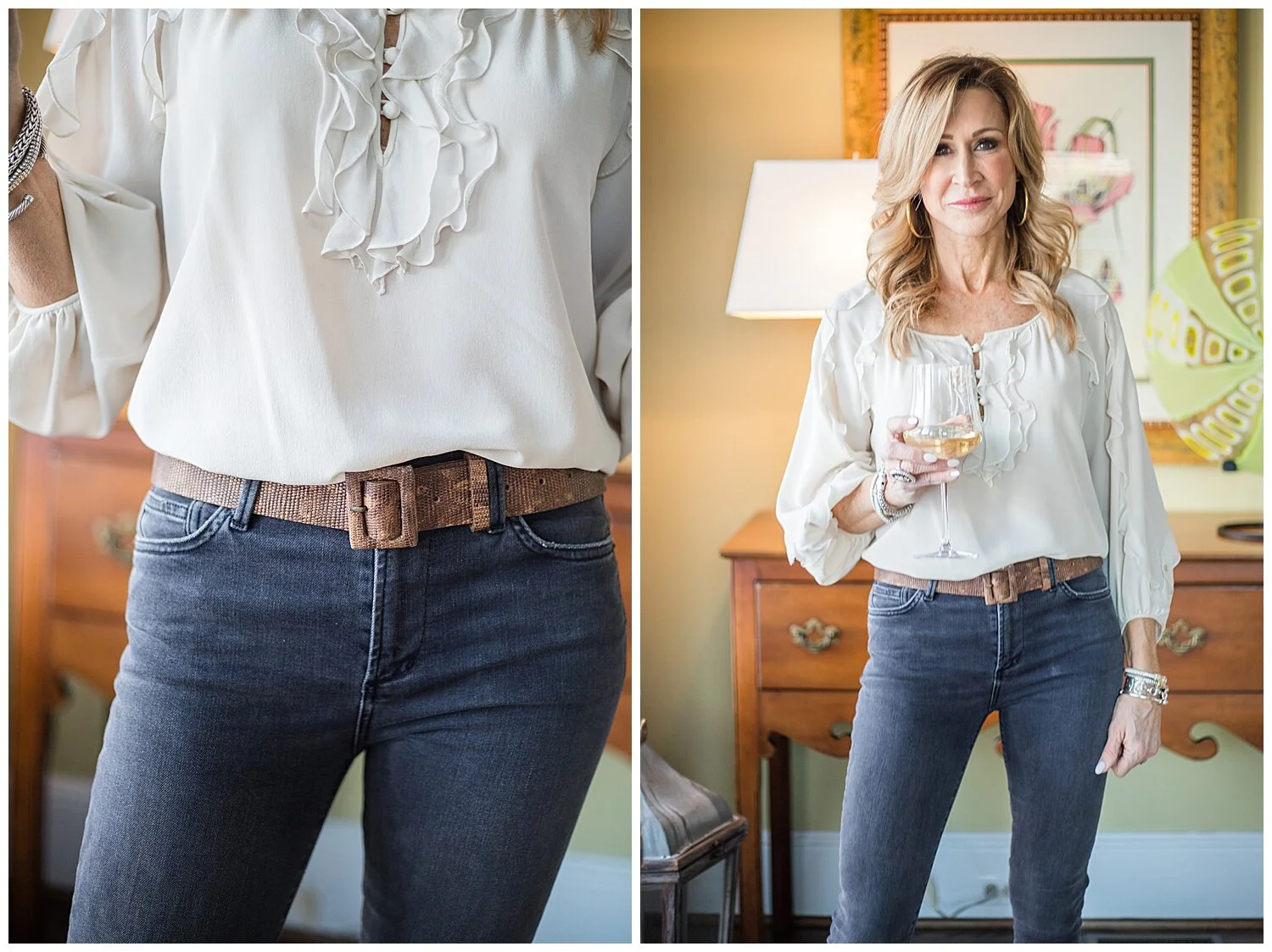Speaking of classic style, the outfit I’m wearing on the right includes a Rebecca Taylor blouse that I bought 10 years ago (yes you read that right). It’s from a fall collection, but because of the color and style, it’s seasonless. I’ve worn it every year since I purchased it. I paired it with grey skinny jeans from Mother Denim, Marc Fisher suede booties (now on sale) and a fabulous belt from Ada Collection. You may know Ada belts from their famous wrap belt. This belt is amazing with dresses and paired with blazers. Since I’m more of a jeans and blouse kind of girl, I like a more traditional belt, and the two I’m wearing here are right up my alley. Keep scrolling for more detail and be sure to check out the website to receive 20% off your purchase with code SUZANE20!