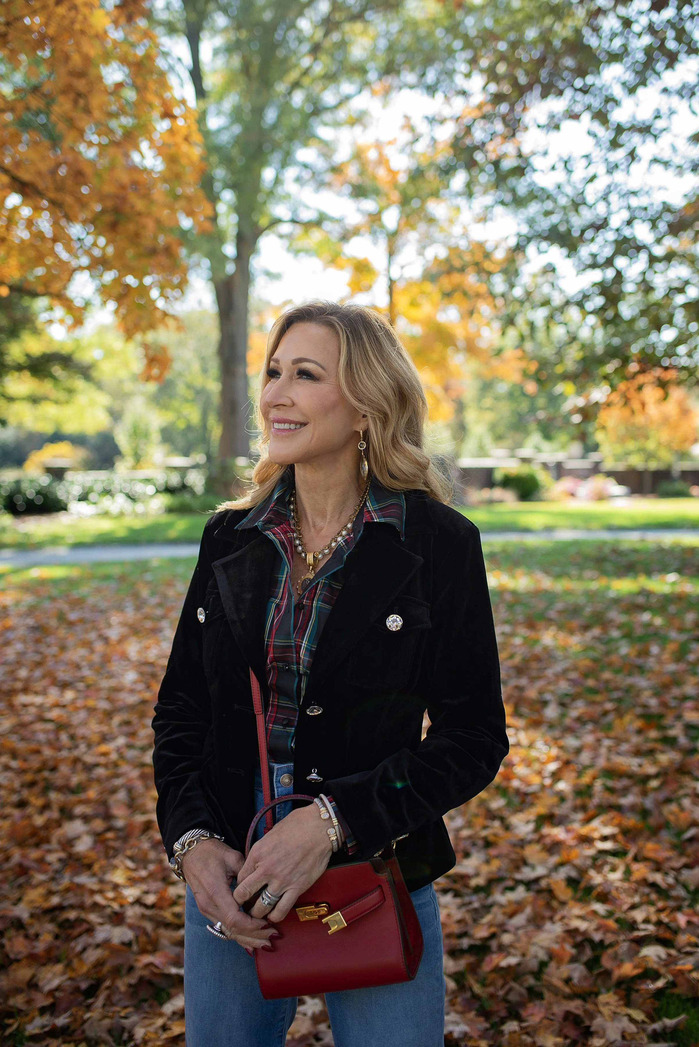 A luxe velvet jacket adorned with sparkling rhinestones and a festive plaid blouse worn with flare jeans and booties is relaxed and fabulous! Elevate this jacket with satin pants or a cute leather skirt. The blouse can also be worn separately with wide leg black pants or slim pants. You could also switch out the booties for black or gold sandals and add a bag more suited for evening! The options are endless…make this look your own!