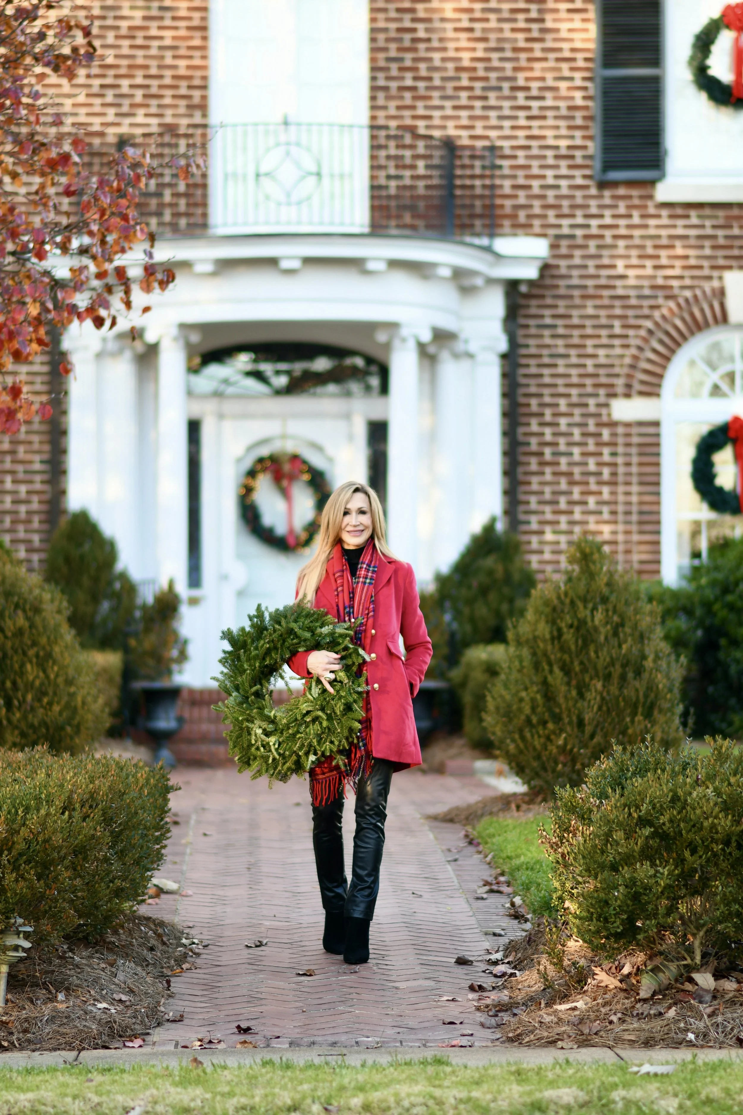 This first look is my favorite! The red coat is perfect for holiday dressing and is perfect with faux leather pants, but I’ve also worn it with off-white jeans and blue jeans. It would also go over a dress or a skirt! The plaid scarf makes this look even more festive!