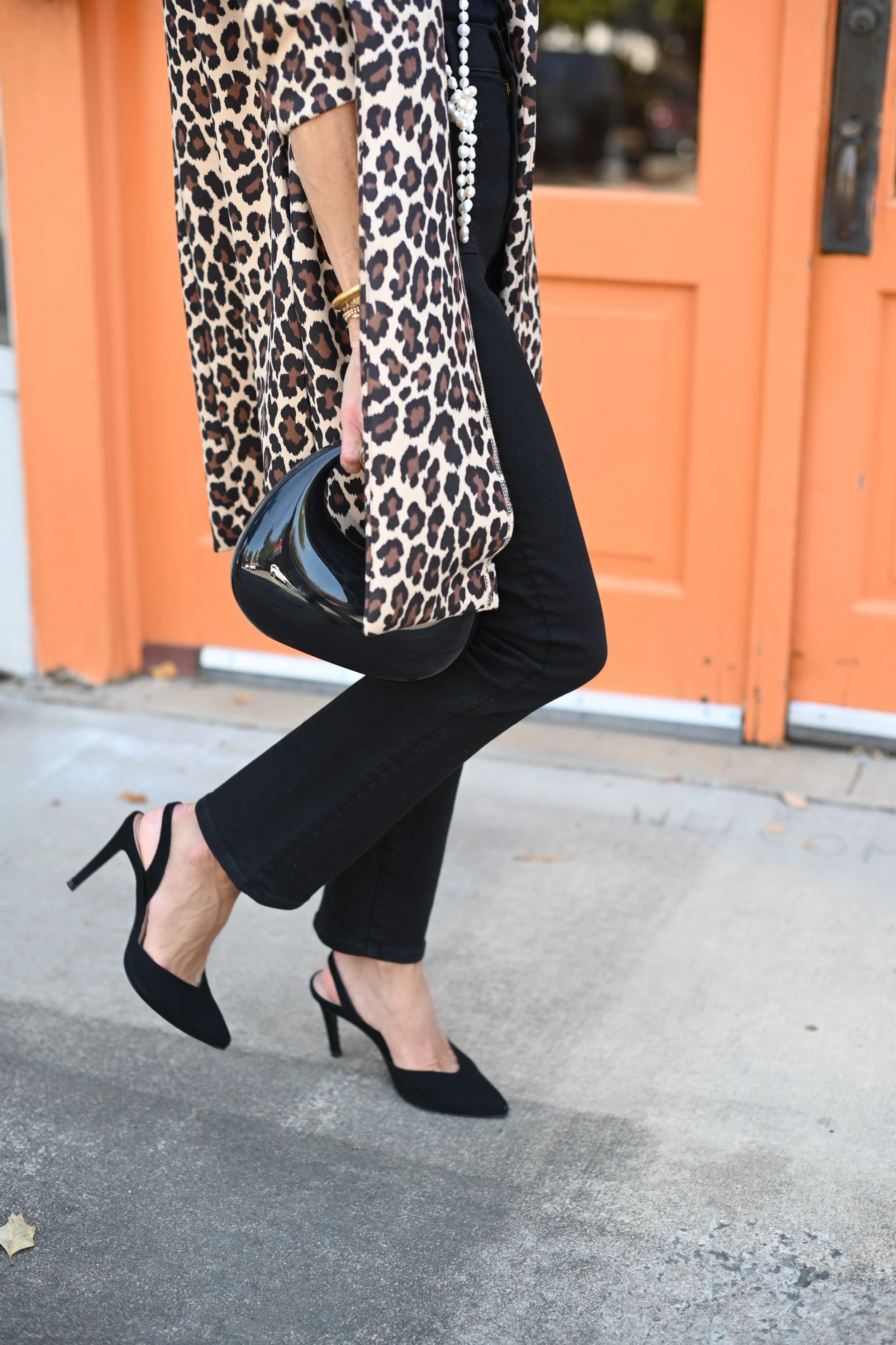 The longer leopard coat is a timeless pieces that never goes out of style. It looks effortlessly chic over a column of black… high-waisted straight-leg cropped jeans and a short sleeve crewneck sweater for a sleek and slimming look. Any black pant would work, but I love dressing this jacket up a bit with black kitten-heel sling backs from Inez. A long strand of pearls from Julie Miles and gorgeous earrings from Julie Vos add a classic touch. Believe it or not, the bag is from Amazon and it’s too fabulous!