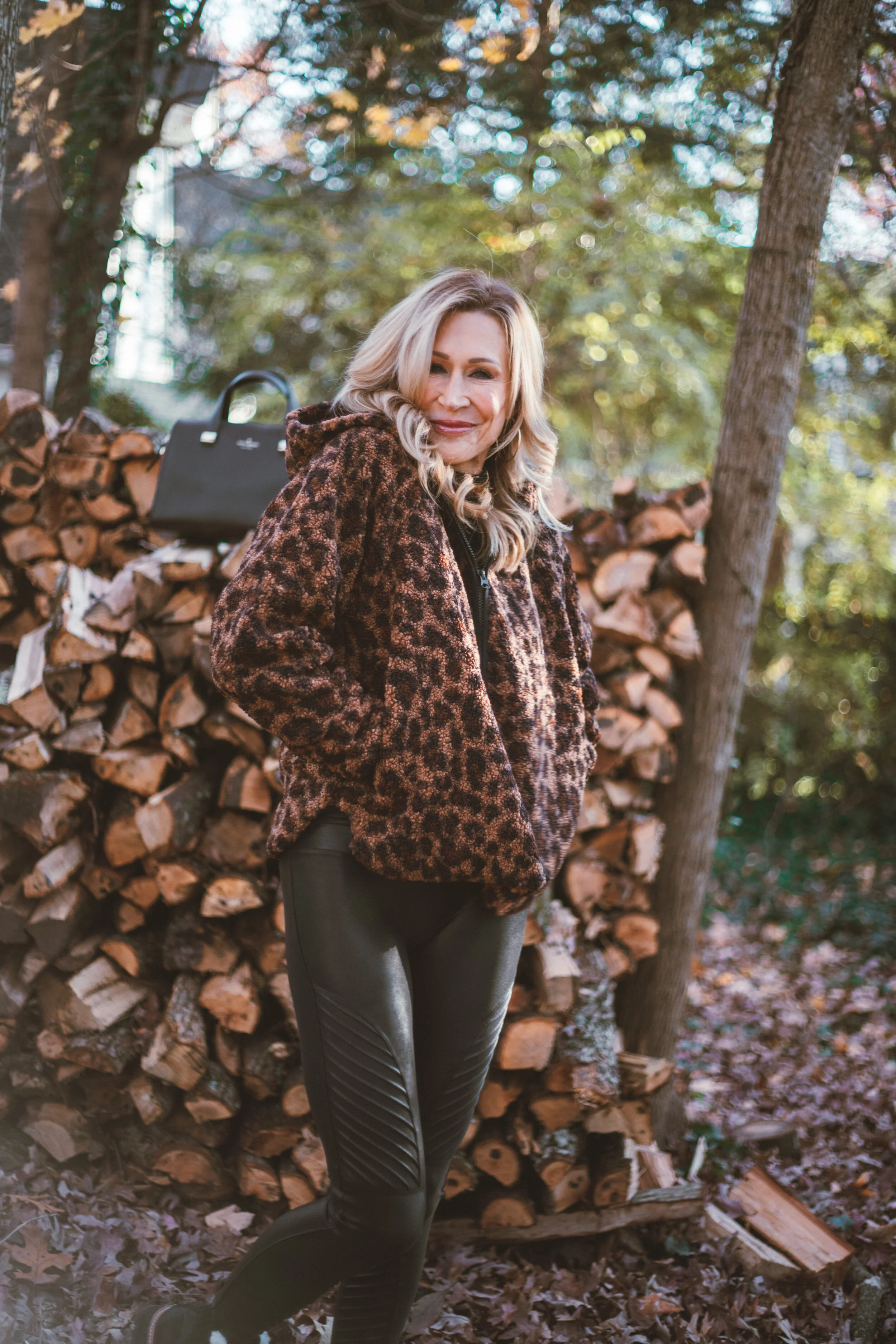 I’ve seriously been living in outfits like this and I know I’m not alone! Leggings are so practical and warm and Spanx are my hands down favorites. I think they fit better than most others and don’t stretch out while you’re wearing them! I paired them with my Marc Fisher shearling boots, a leopard jacket (so warm) by Lou & Greu from Loft (currently around $55 with code MERRY), and a black turtleneck. My bag is very old from Kate Spade, but I’m linking a similar one below!