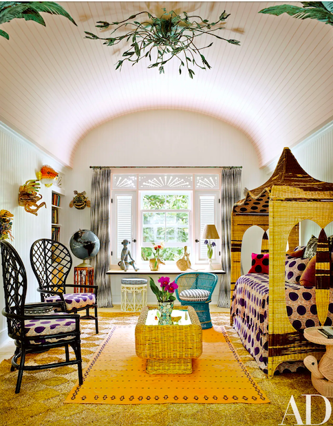 As you can see from the pictures, the decor at Casa Guava is very whimsical and not at all fancy or formal. The rooms are livable and beach friendly with unusual and repurposed items and colorful upholstery! Much of the fabric (such as the chairs above) comes from Celerie Kemble's line for Henredon.