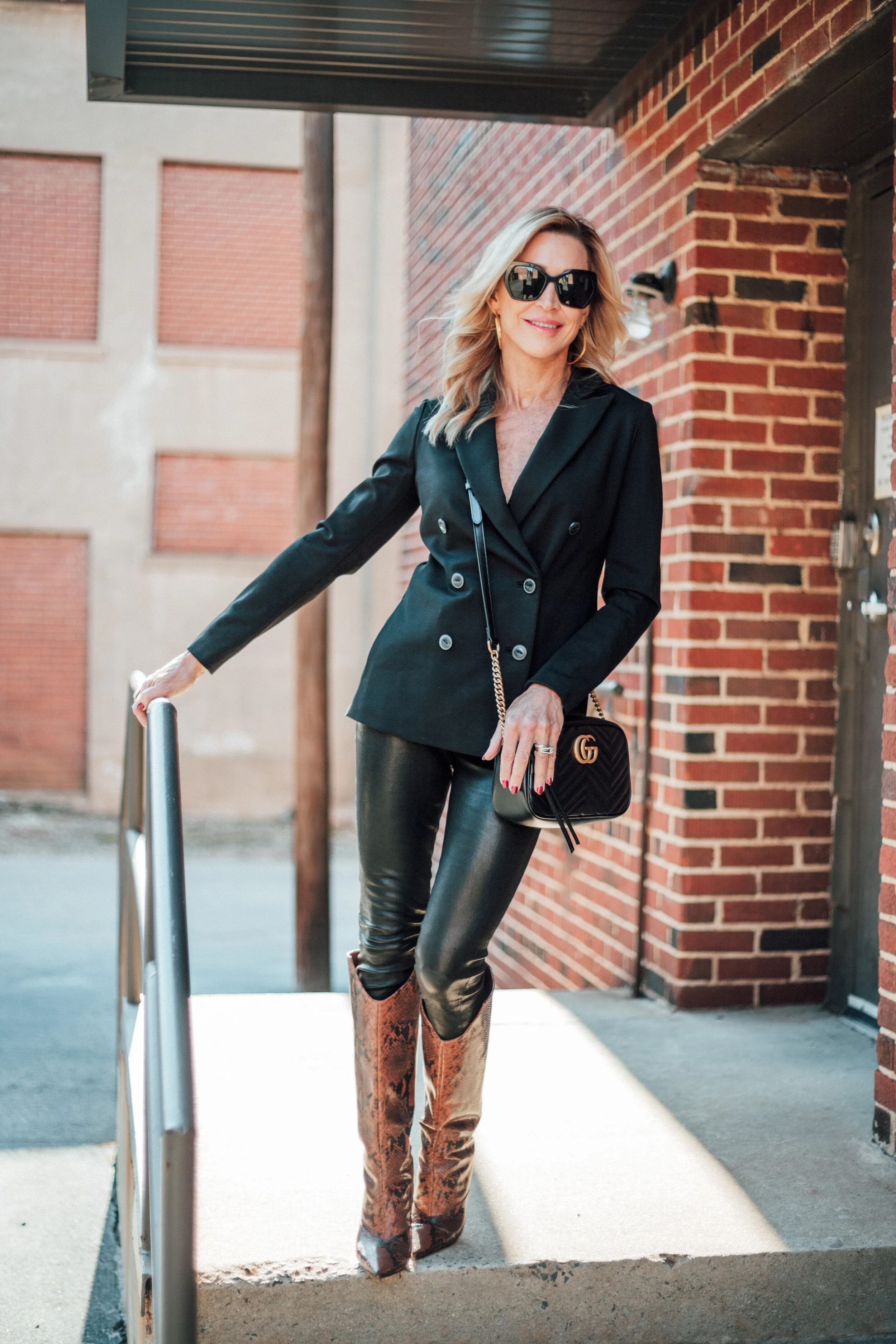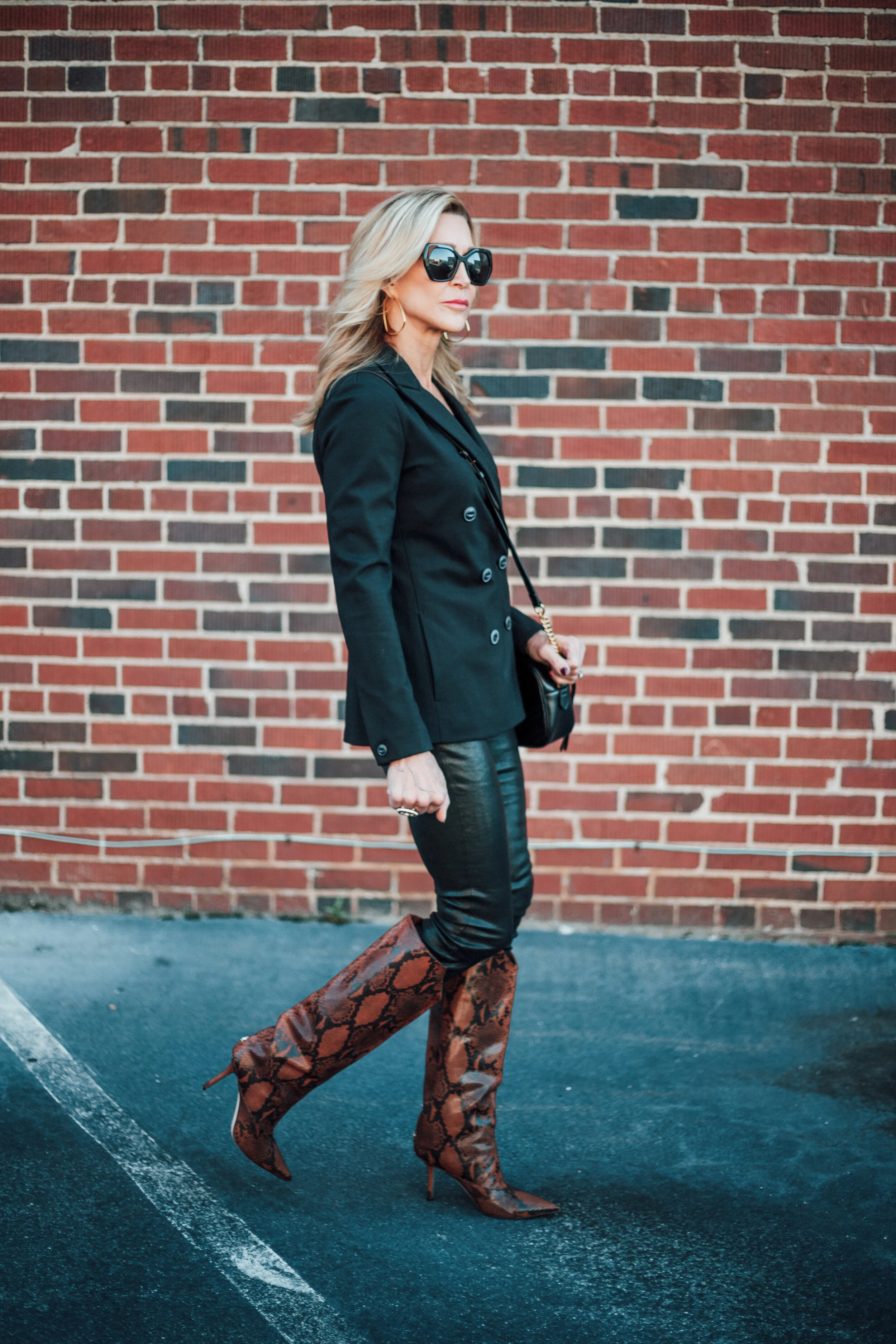 About the fashionβ¦Iβm wearing what I would consider to be classic pieces that will last forever. Leather pants, beautiful snakeskin boots, a double breasted black blazer, black bag, black sunglasses and gold hoop earrings. I chose to wear the blazer as my top, but a tee shirt or blouse would be great under as well. Each one of these pieces provides endless options for styling.