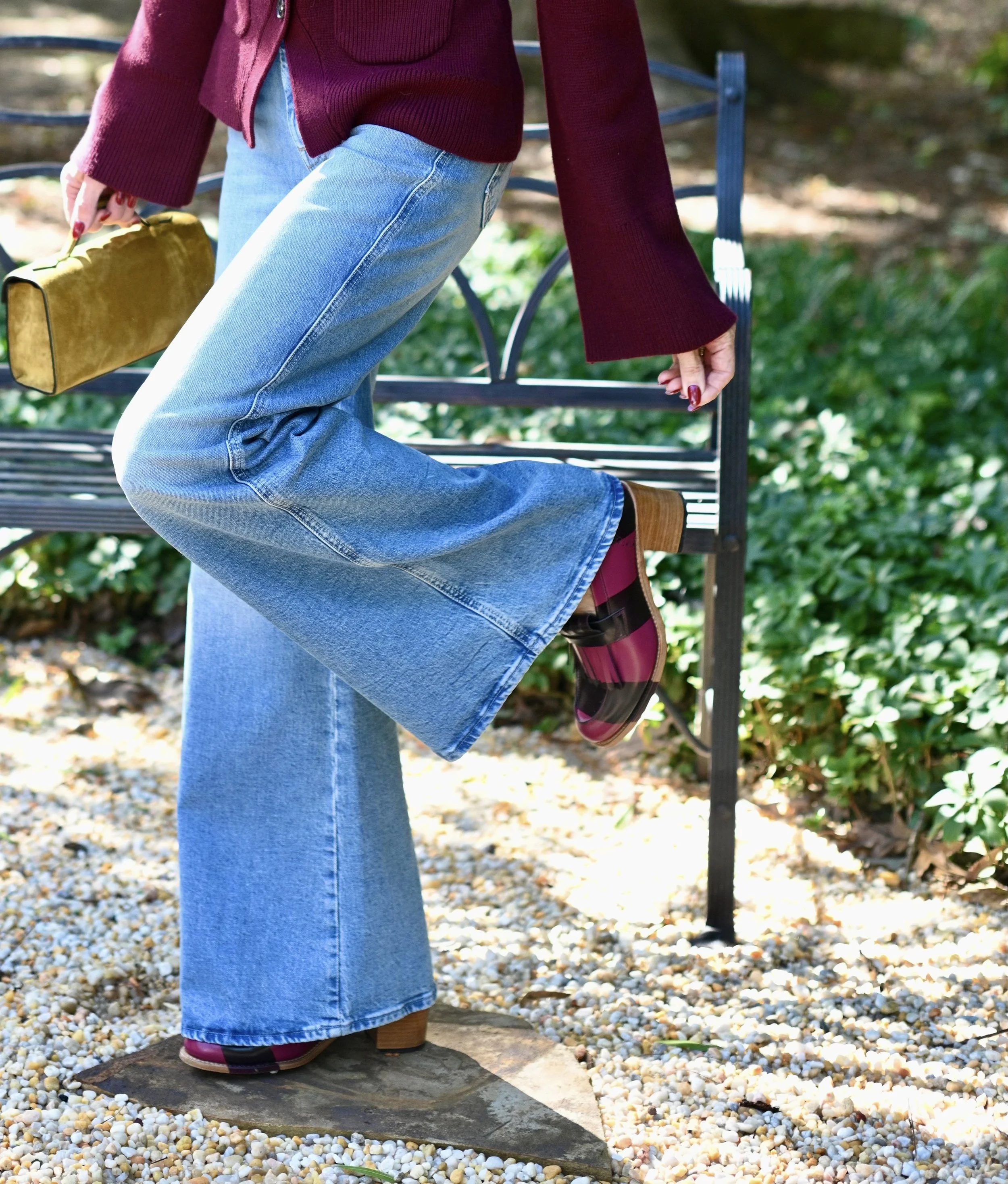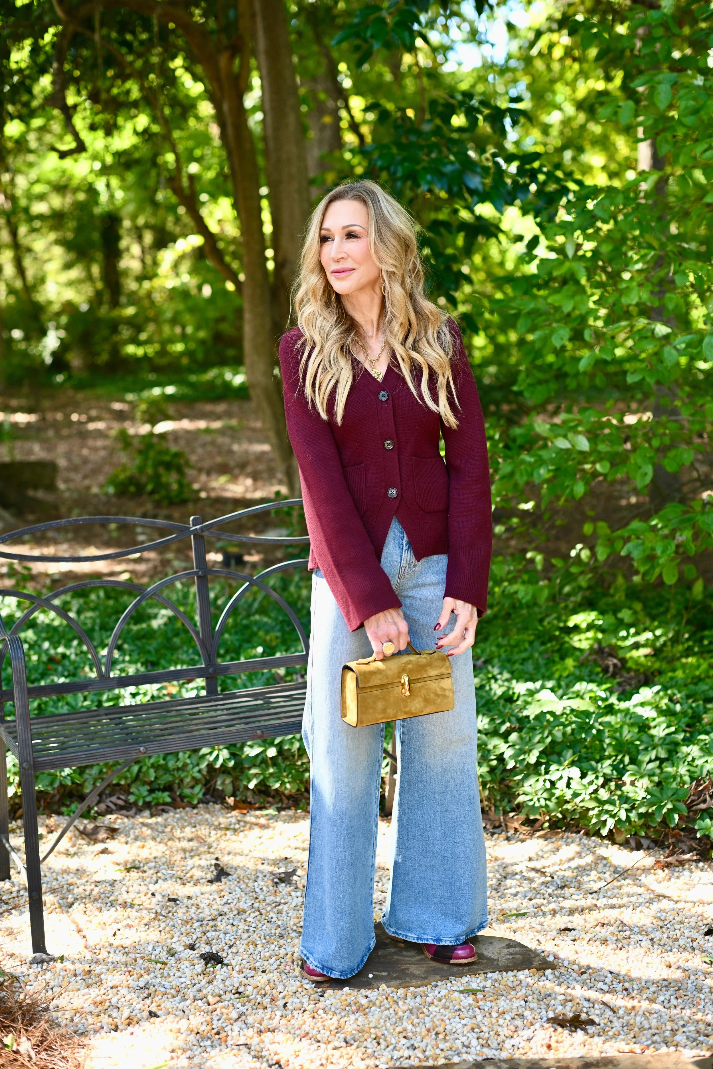 For the second, I went with a berry sweater from Pistola, wide-leg jeans from Mother and a fabulous top handle bag from Savette. The deeper color of the sweater picks up the tones of the shoes and make the outfit feel pulled together.