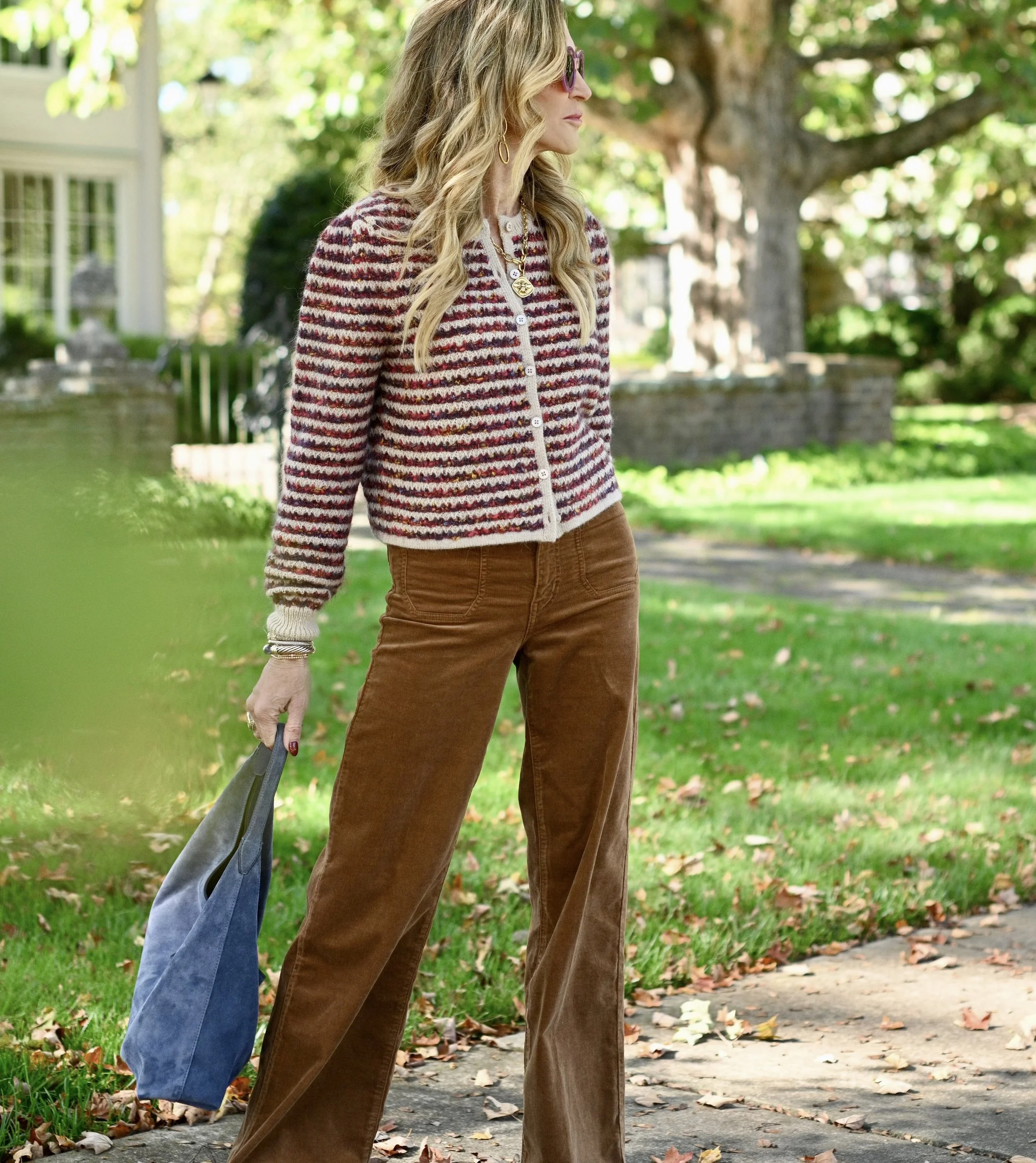 In the first outfit, I styled them with brown corduroy jeans from Frame and a cardigan from Le Jean. It’s a relaxed, neutral look with an easy, classic feel.
