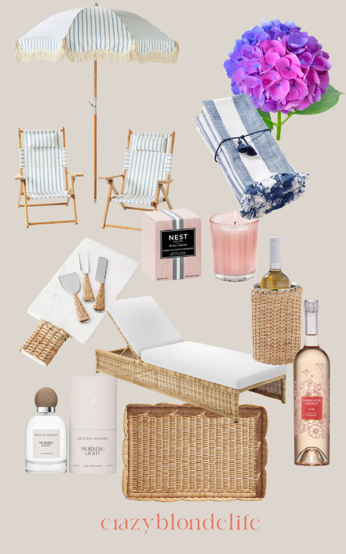 Aside from clothing, the coastal grandmother trend (classic style) can be brought into your home and lifestyle! Serena & Lily has the best wicker items, including (pictured above) the lounge chair, serving tray, wine holder, striped napkin, cheese board and beach chairs. Home fragrance along with cologne can bring that coastal feel into your home and Nest Candles are my favorites along with the Morning Light cologne from Brochu Walker! If you haven’t tried Forever Young Rosé, you must…it’s a great light and crisp rosé that’s reasonably priced!