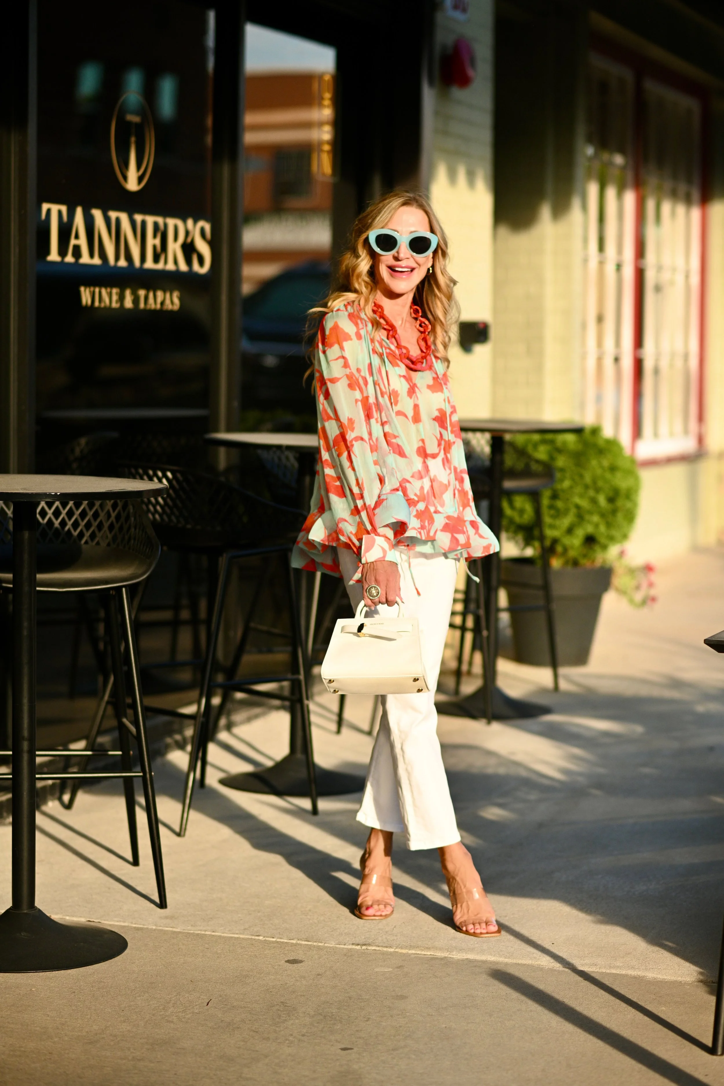 So summery, a bit unexpected and too fabulous! The light blue and coral hues of this gauzy, flowy long-sleeve summer top have a breezy sophistication that’s whimsical yet sophisticated. It’s perfectly paired with crisp white jeans and the prettiest sandals with a gold heel and transparent strap. The coral statement necklace adds another playful pop of color without overwhelming. The sleek white Veronica Beard bag brings a refined energy that grounds the look! It’s ideal for sunny days filled with stylish adventures. Perfect for turning heads at the beach or drinks downtown!