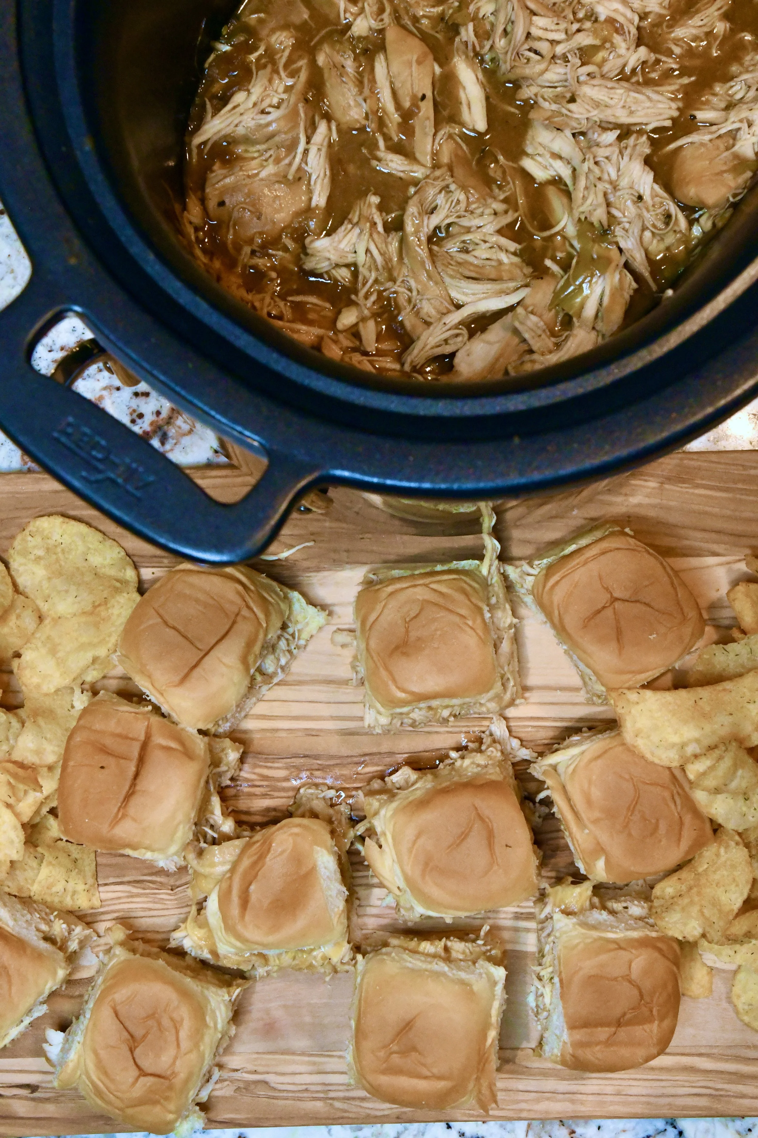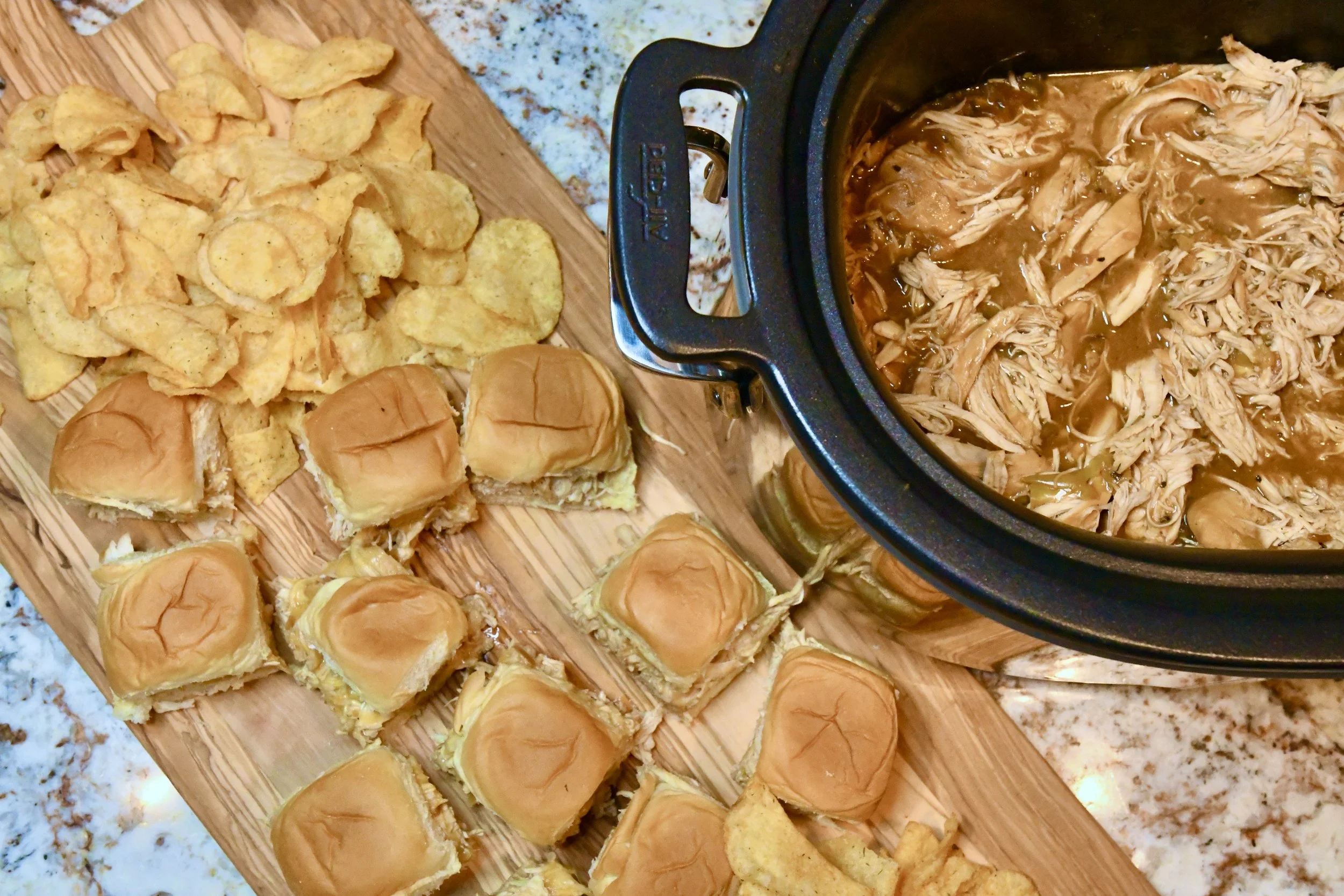 Today, I’m sharing a fun and easy recipe that you’ll want to make all year long! My Crazy Blonde Mississippi Chicken is made in the Slow Cooker and you simply want believe how delicious it is! With only 4 ingredients, it’s a snap to put together. You can serve it as is when it’s done, or you can serve it on Hawaiian Rolls with melted cheddar cheese for a really fabulous hors d’oeuvre. When I posted this recipe on Instagram, I had someone comment that they would be making this for their first tailgate party and I think that’s such a great idea. Just serve the chicken in the slow cooker along side Hawaiian Rolls with slices of cheese since you can’t melt the cheese (to make it easier to eat)! Either way you choose to serve my Mississippi Chicken, I promise you’ll love it!