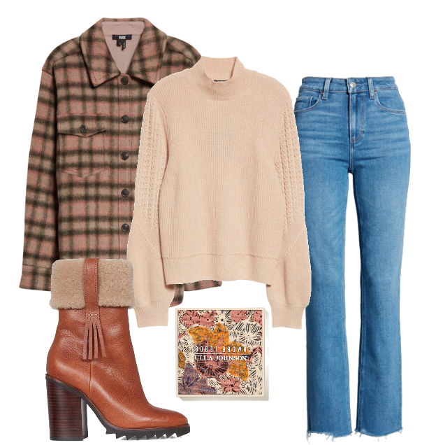 A shacket, shearling boot and flare jeans all in one outfit…so chic!