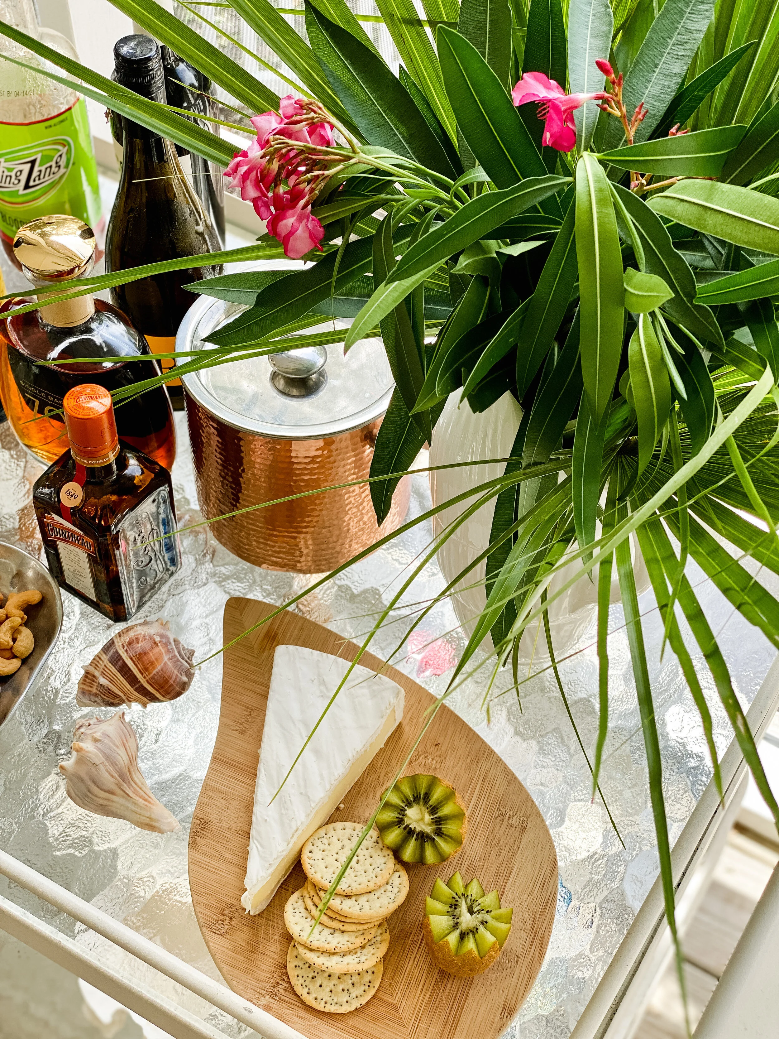 Add tasty nuts, cheeses, veggies and hummus…whatever you love. A beautifully decorated bar cart filled with everything to make great drinks and delicious snacks is one of the easiest ways to entertain.