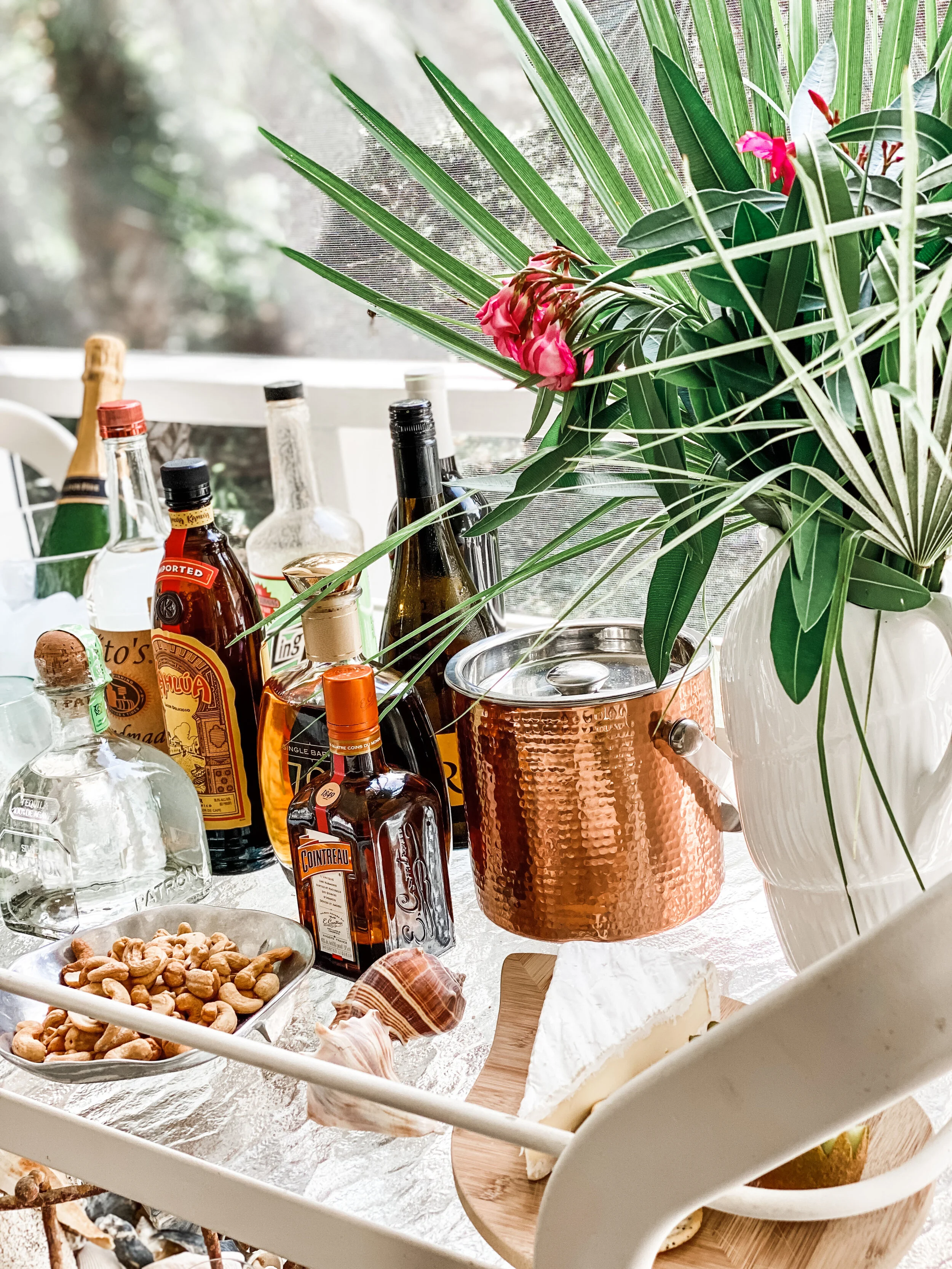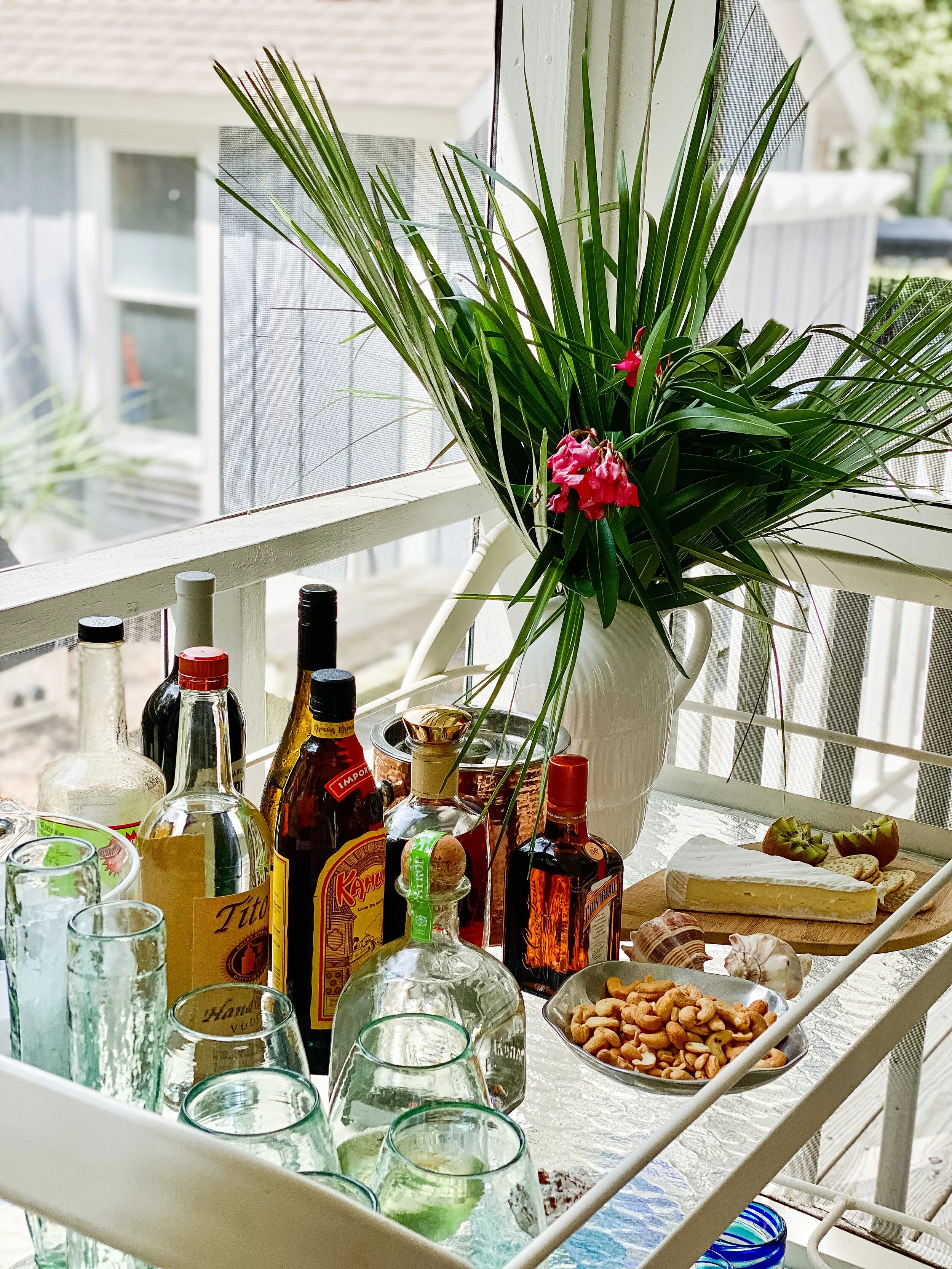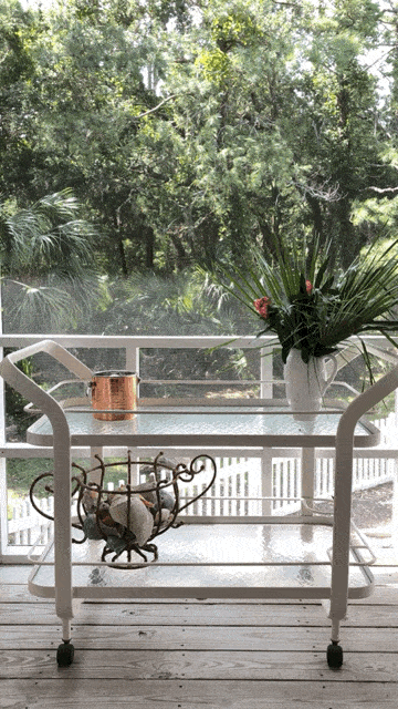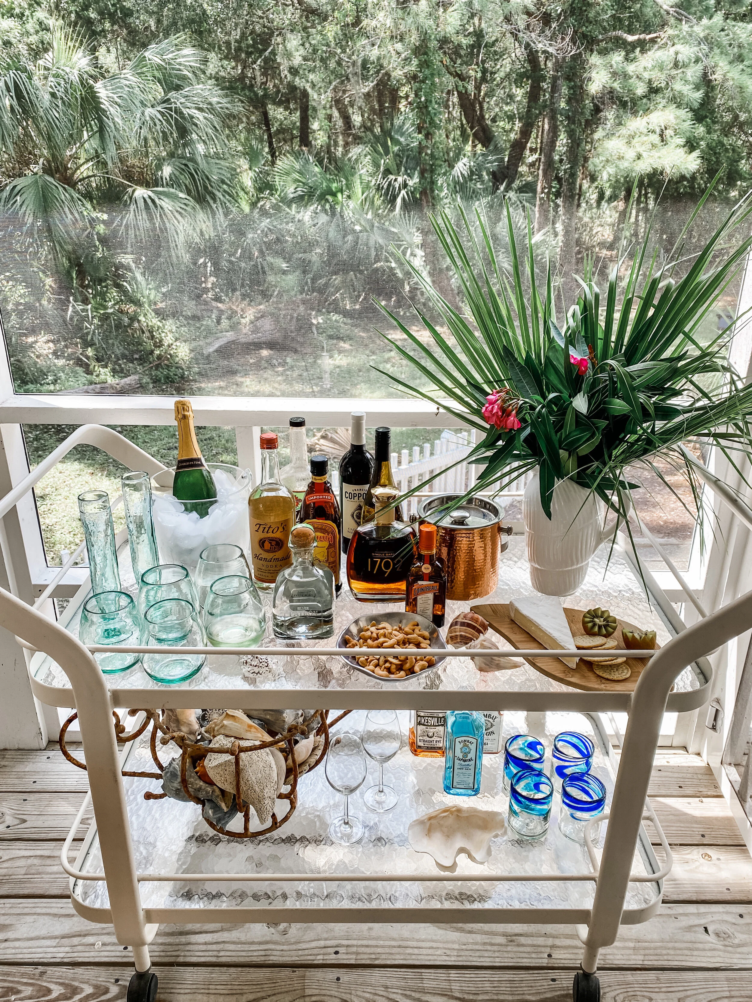 Every summer when we arrive at Bald Head Island, I love to create a bar cart to keep on the porch signaling that summer is in full swing. The items included on the bar rotate as people come and go and as we find new snacks and drink recipes. There really are no rules…use what you have, be creative and have fun. The goal is to keep everything in one place so that you can easily have cocktail hour without having to recreate the whole thing every day! Keep scrolling for a fun video of how I set everything up and also a video showing how I make one of my favorite easy drinks!