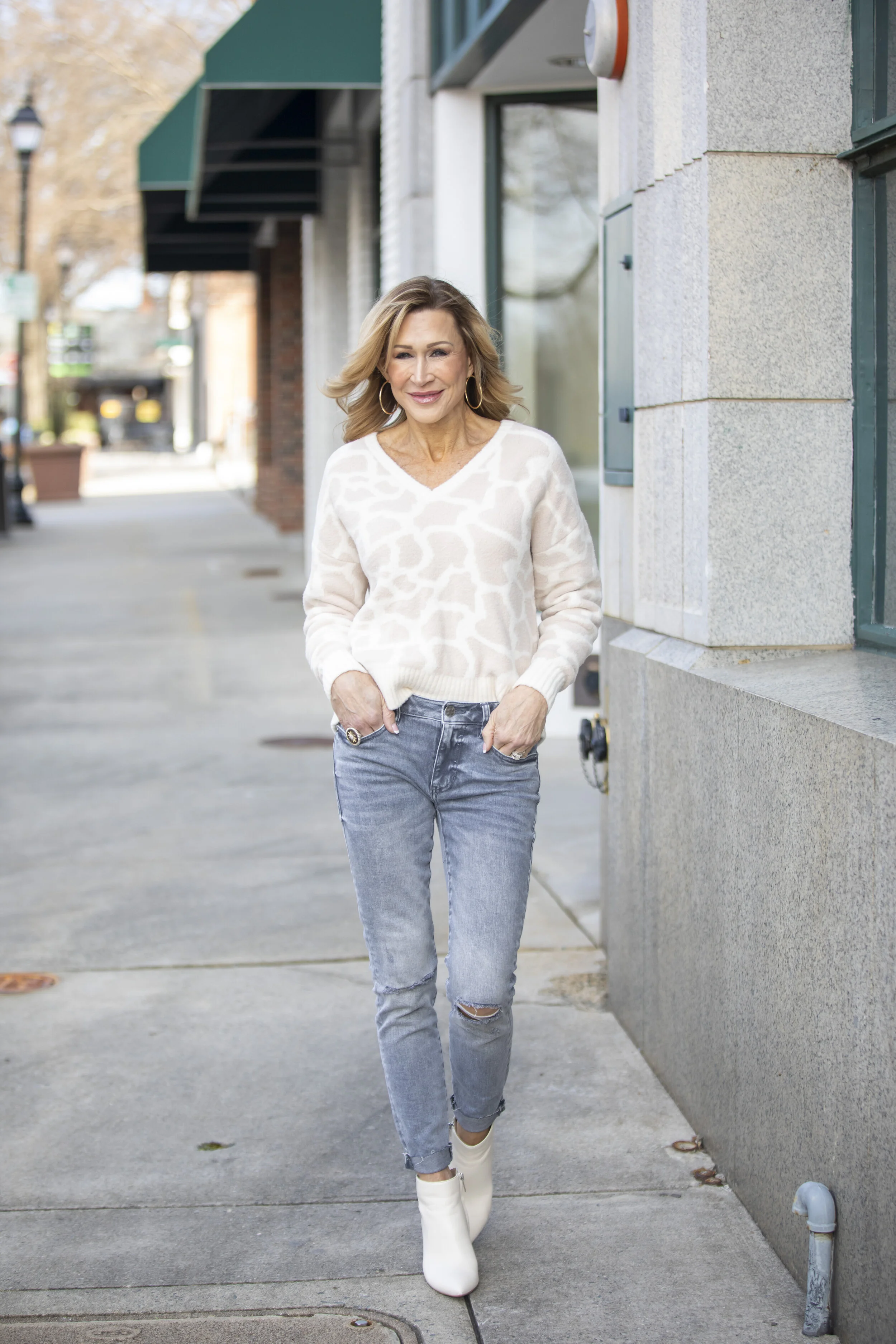 The jeans I’m wearing are by Cabi and I’ve really loved wearing them. They were too long for me so I simply cut them off and voila…I had a customized pair of jeans. These jeans are not high waisted, which, going against the high-waisted trend, I actually really prefer. I love the faded grey color and the distressing on the leg. I paired them with a sweater from Loft and Marc Fisher off-white booties. (similar here - mine are almost sold out), I was literally freezing my butt off for these pictures, but I think this outfit will be ideal on a day when it’s just a little warmer. Don’t you agree that the taupe in the sweater is a little unexpected with grey jeans, but like I said, grey is so neutral and why not be unexpected!?