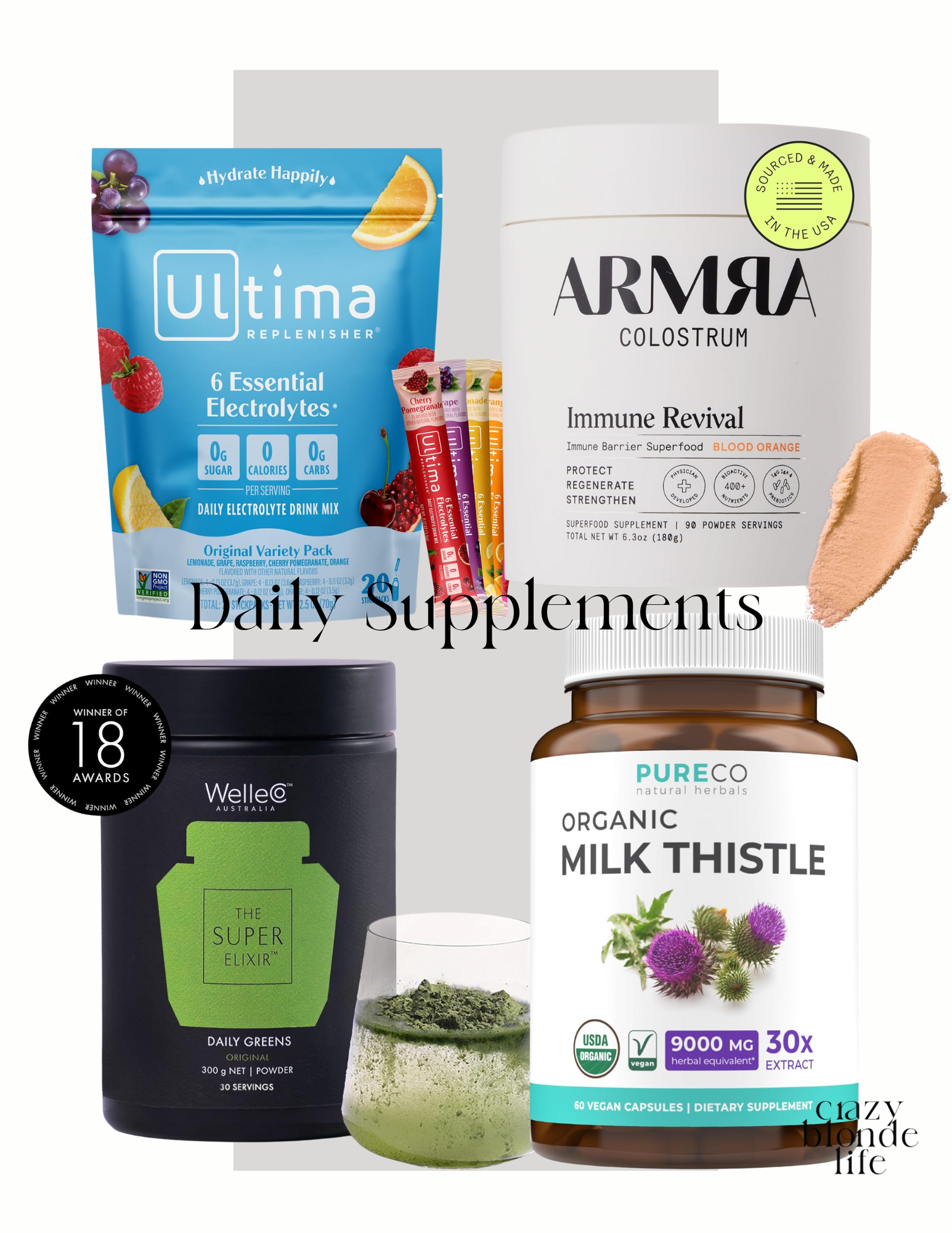 I’m a good sleeper and I think it’s partly my night time supplements that include Oliveda ORAC & Camu Camu Olive Leaf Concentrate, the Beauty Molecule and the Beauty Fountain, another Ultima Hydration stick because I sleep better when I’m hydrated, two scoops of Armra and 500 mg of magnesium.