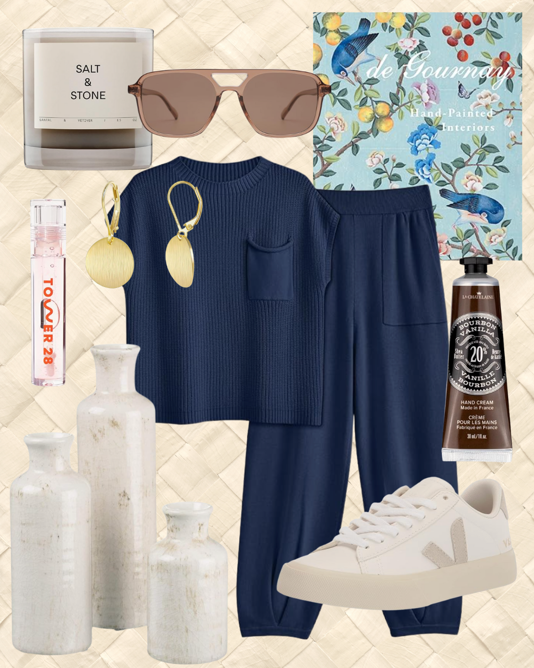 When I’m working, I want to be chic and comfortable and I really do depend on sets from Amazon for my everyday looks. I like to have a candle burning and create an ambience that’s conducive to being creative. I have a drawer by the bed and by the sofa in my den with hand lotion and lip balm and I often have a beautiful book near by so that I can flip through when I’m feeling uninspired! It really does help so much to take a break and look at something beautiful! I’m convinced that a big part of having a great day is planning ahead and having what you need at your fingertips!