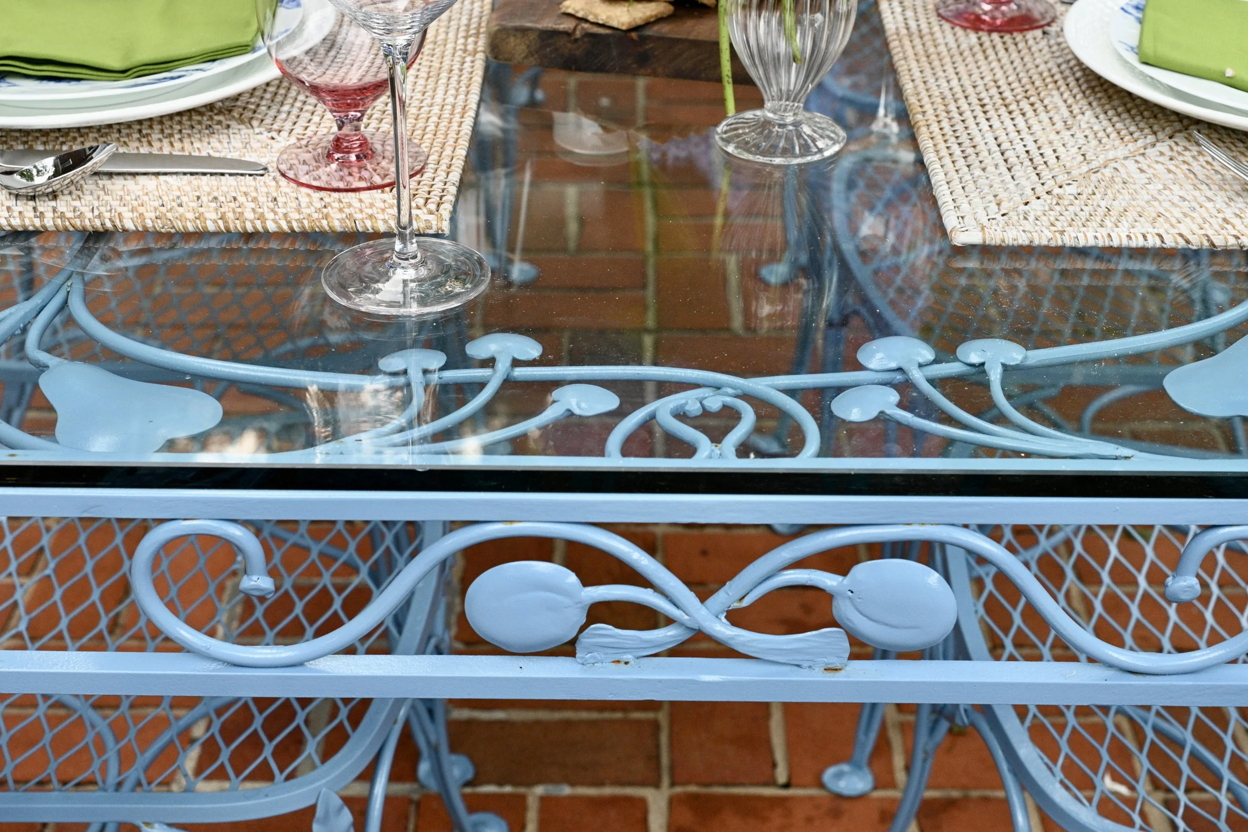 When we bought the table, it was painted white and looked like a very traditional “Palm Beach” table. It had a little rust and needed to be repainted (powder coated), but I didn’t push that right away, knowing it wouldn’t be inexpensive to have that done. It sat outside for a while and I kept talking about how fabulous it would be if it were painted a different color. Now, I’m no dummy and knowing Baldy’s affinity for the color light blue (he’s a fanatic University of North Carolina fan), I told him I thought we should paint the table light blue and finally he agreed with me that we should have the table painted. The piece of glass on top of the table is very thick and very heavy and it took two big guys to move the glass into storage so that the table could be moved.