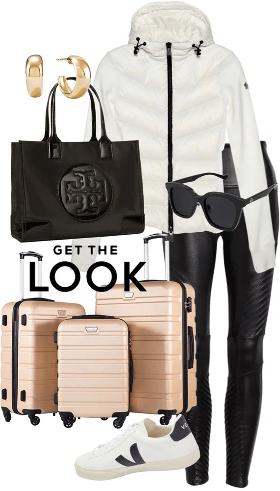 Spanx leggings are the most comfortable for travel along with a large tote bag and sneakers. The luggage is from Amazon and Iβve already purchased it for the trip. It seems very sturdy and hopefully the color will stand out in baggage claim. A simple white long sleeve tee underneath the jacket will keep me comfortable for the long flight. Iβm planning to share more of what and how Iβll be packing for the trip next week!