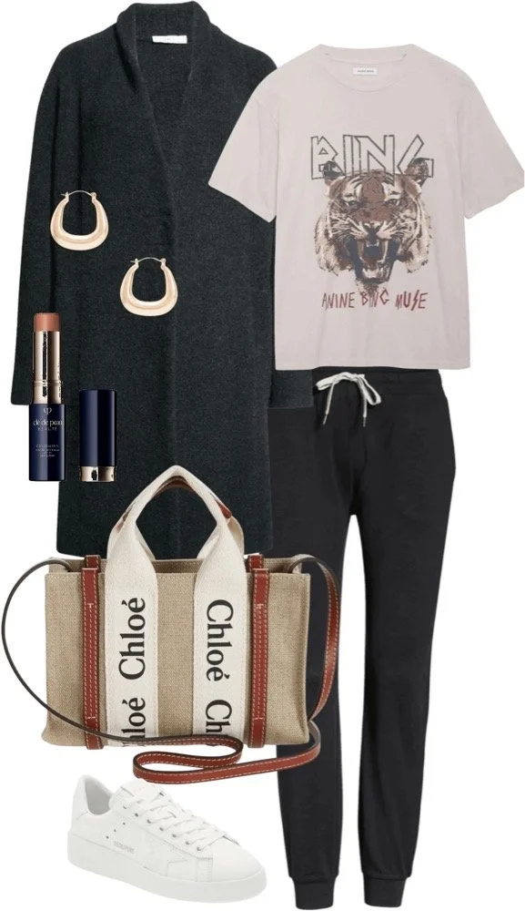 I originally created the above outfit as a travel look which I still think would be great, but I would also switch out the joggers for black jeans or leather pants for a chic daytime outfit. Right now, the temperatures in Paris are in the low 60βs during the day, so Iβll definitely need a sweater. I love the Chloe tote bag for carrying my necessities including my camera and sneakers are a must for comfort.