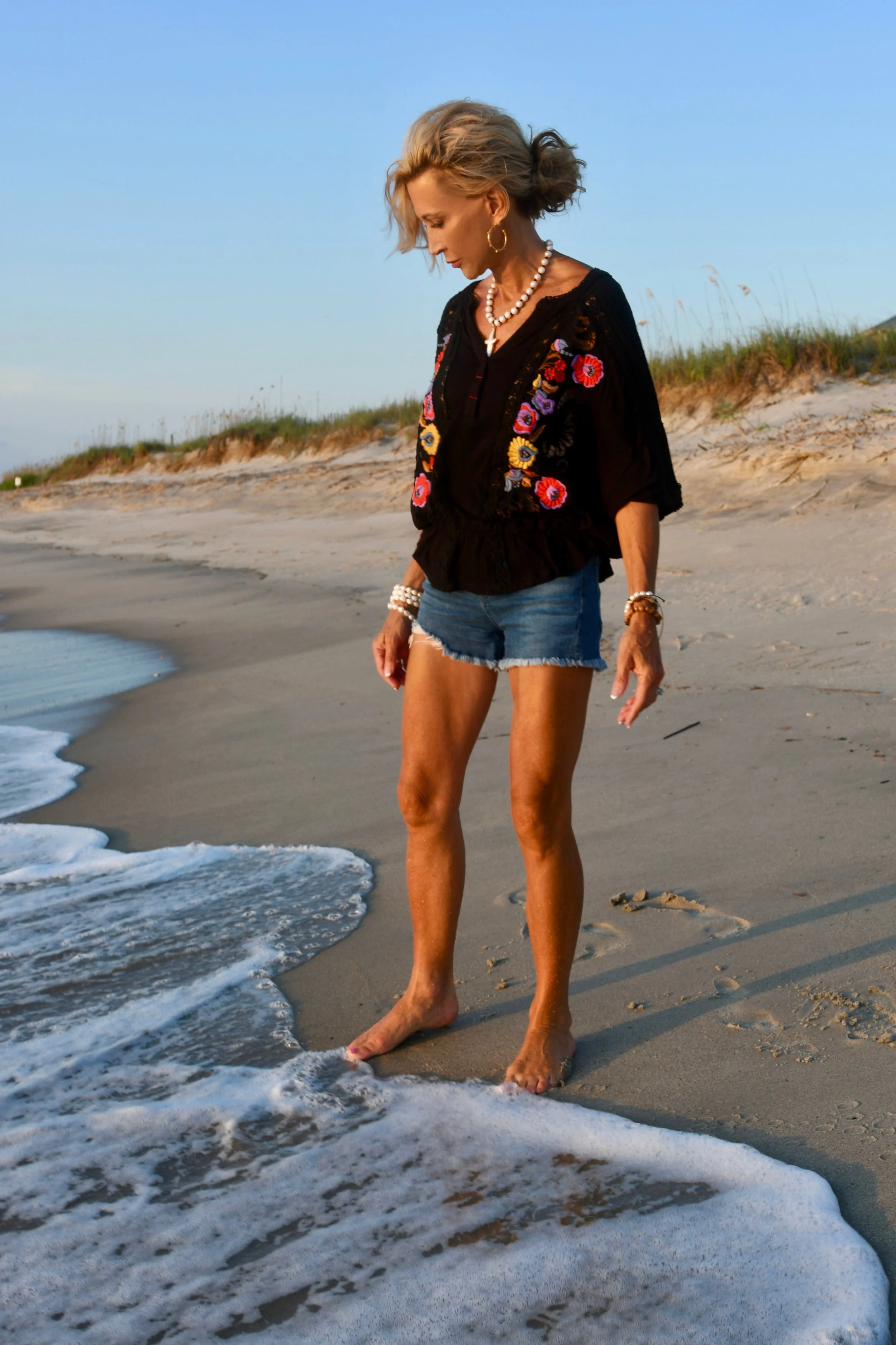 One of my favorite looks! I love to wear a boho top with denim shorts and of course an armful of jewelry. The bracelet on my right arm is by Pamela Mason and you can see her things here.