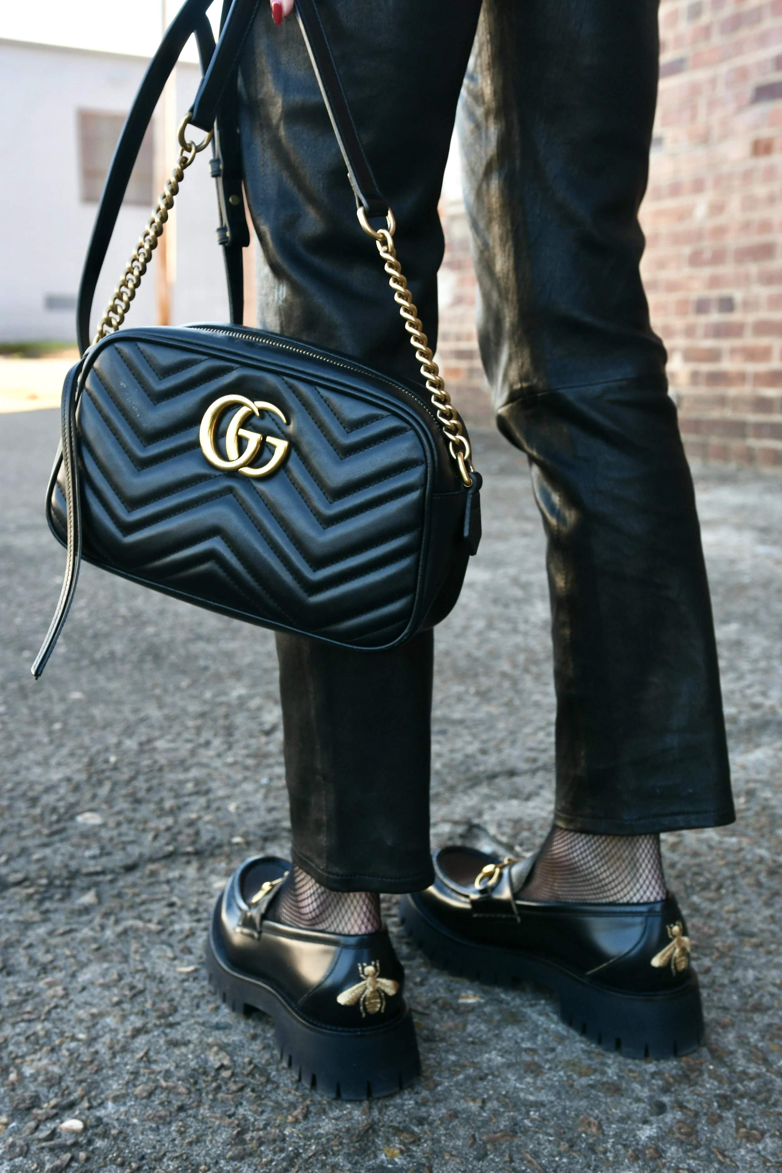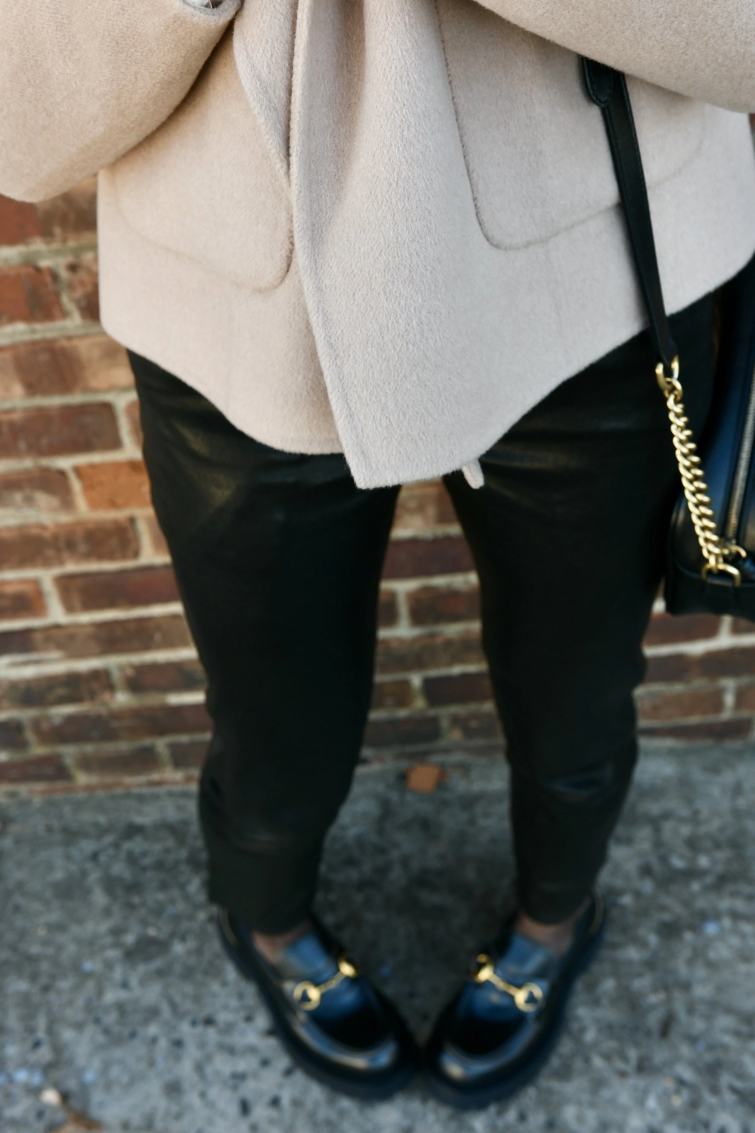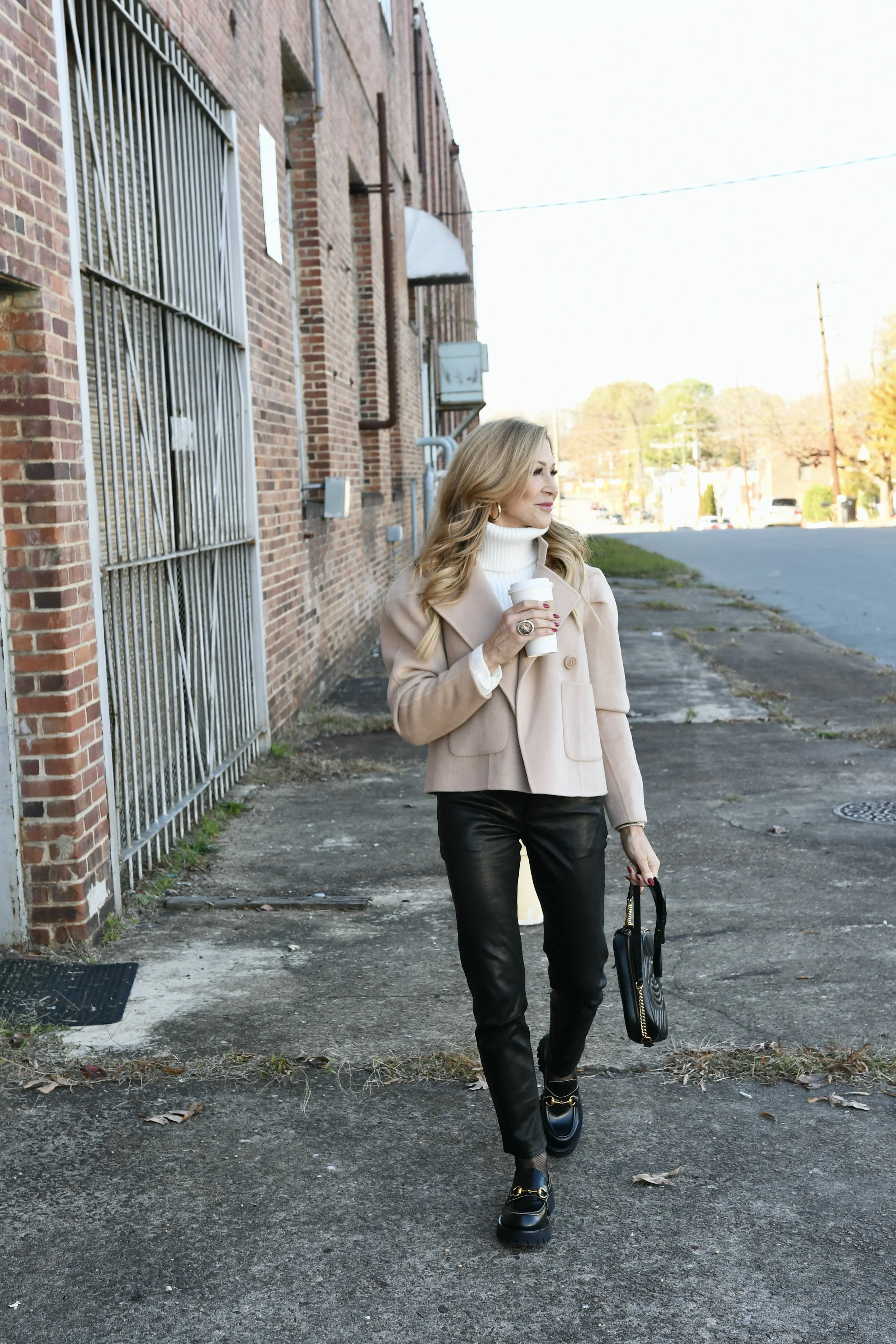 And nowβ¦about this look! This look is so me! I do love the balance of a masculine look softened by puff shoulders, pearls, and the fishnet knee highs make me happy! I pulled together closet essentials - a camel coat, off white turtleneck sweater, black leather pants, a black crossbody and loafers! The coat could be any length, and the pants could be faux leather, but these pieces are workhorses that will carry you through seasons of outfits andβ¦they can be mixed and matched endlessly! I threw in the fishnet knee highs for fun and for warmth!