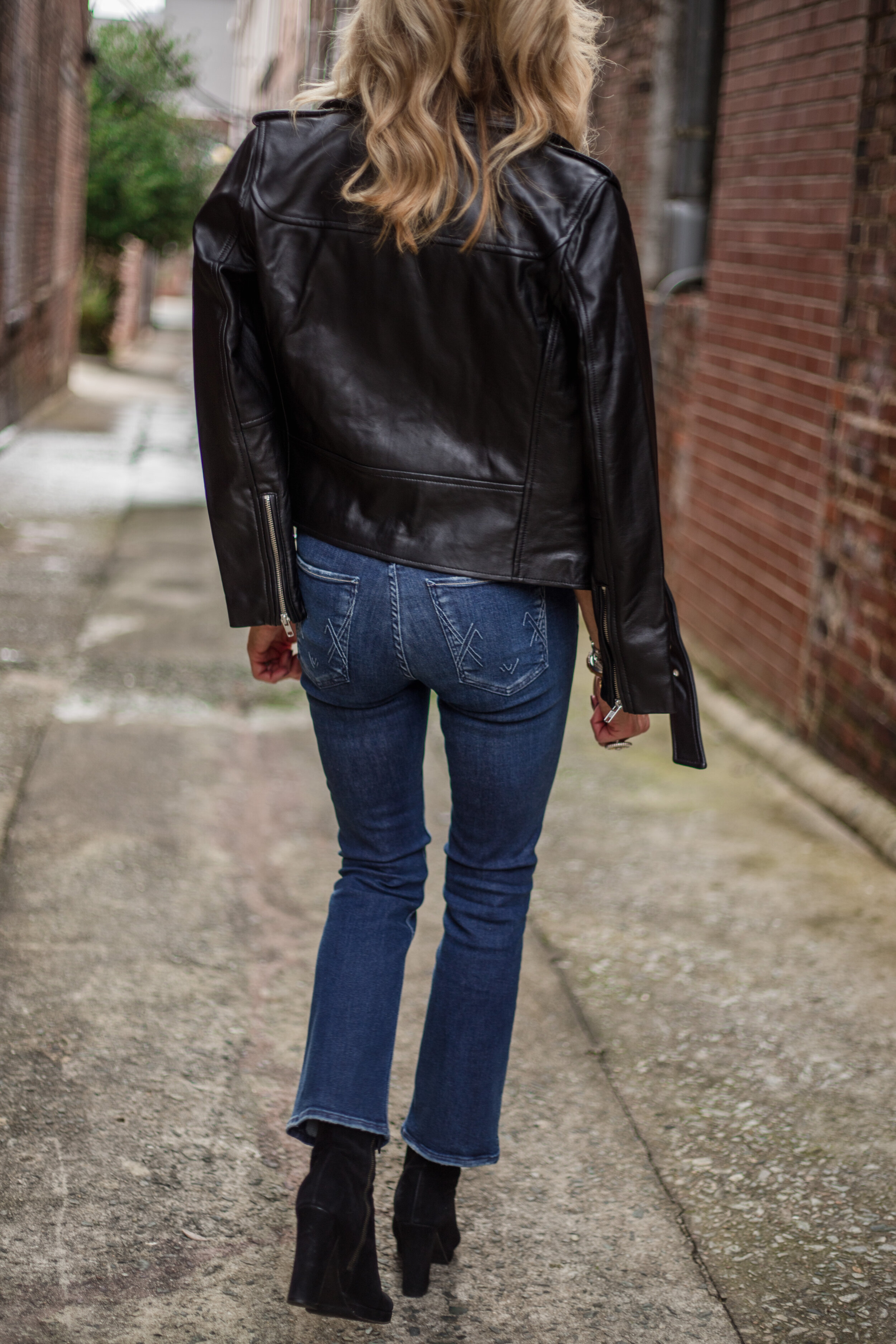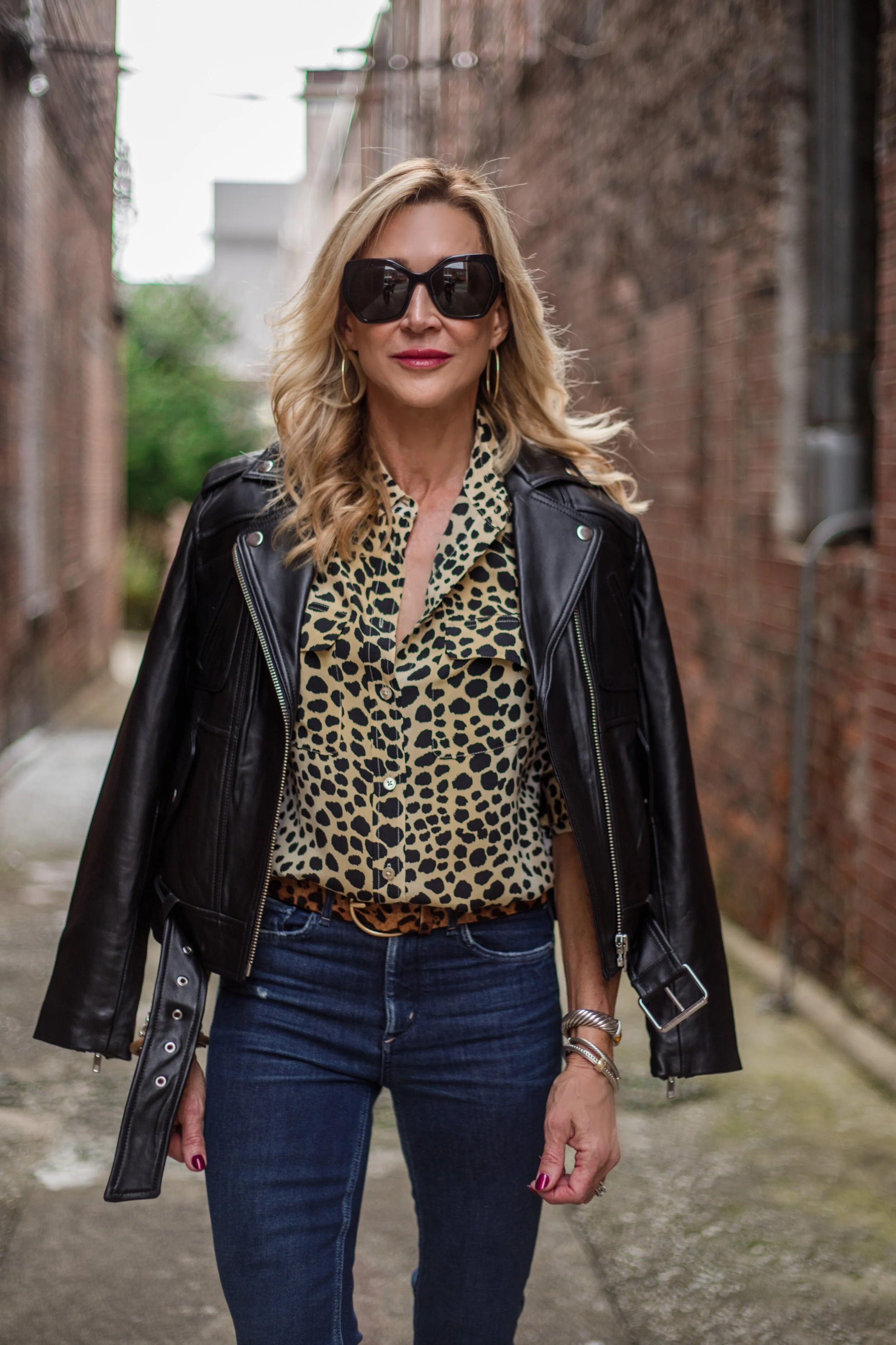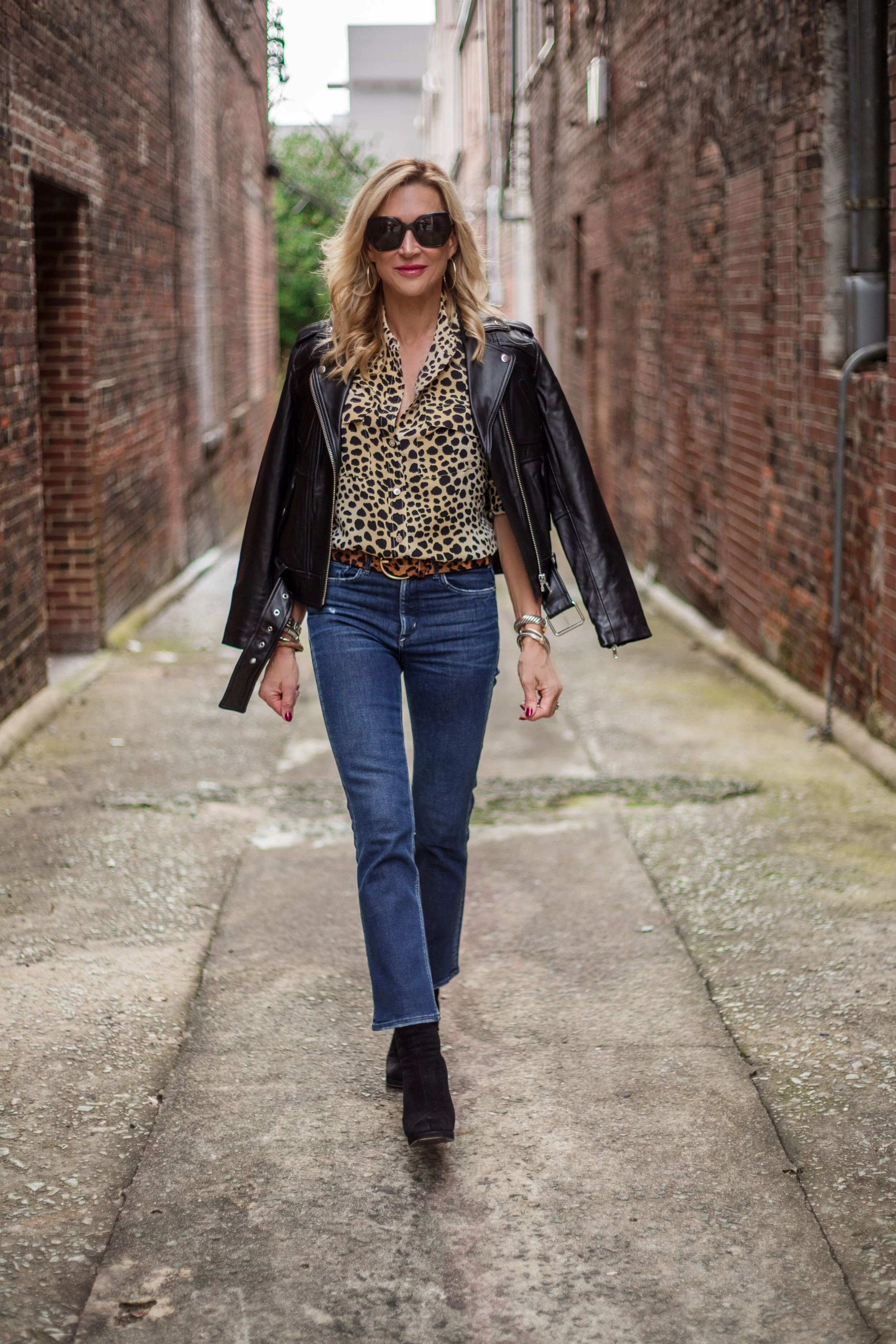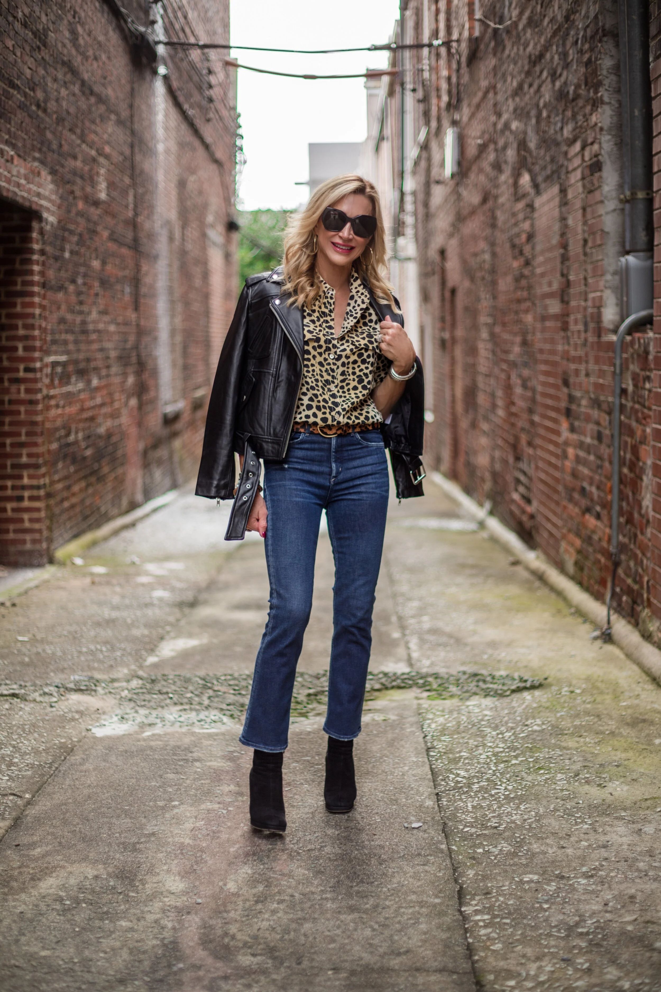 I’m wearing one of my favorite pieces from Cabi in these pictures…their fabulous new leather jacket (almost identical here). I’ve paired it with a blouse from Equipment, a Cabi leopard print belt from last season, McGuire jeans and ancient Miu Miu booties that I’ve had and will wear forever. As is the case with these booties…good quality basics last forever!