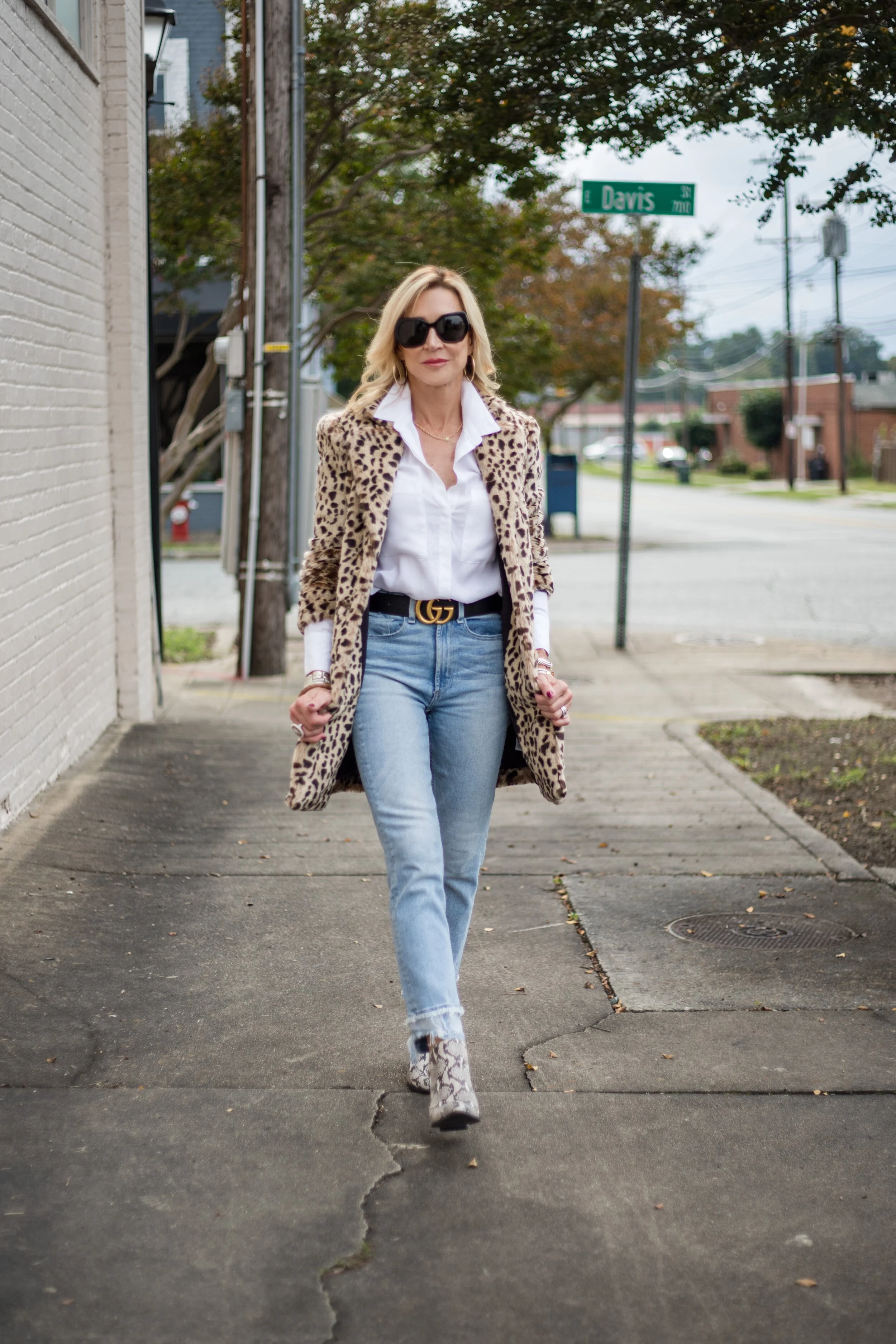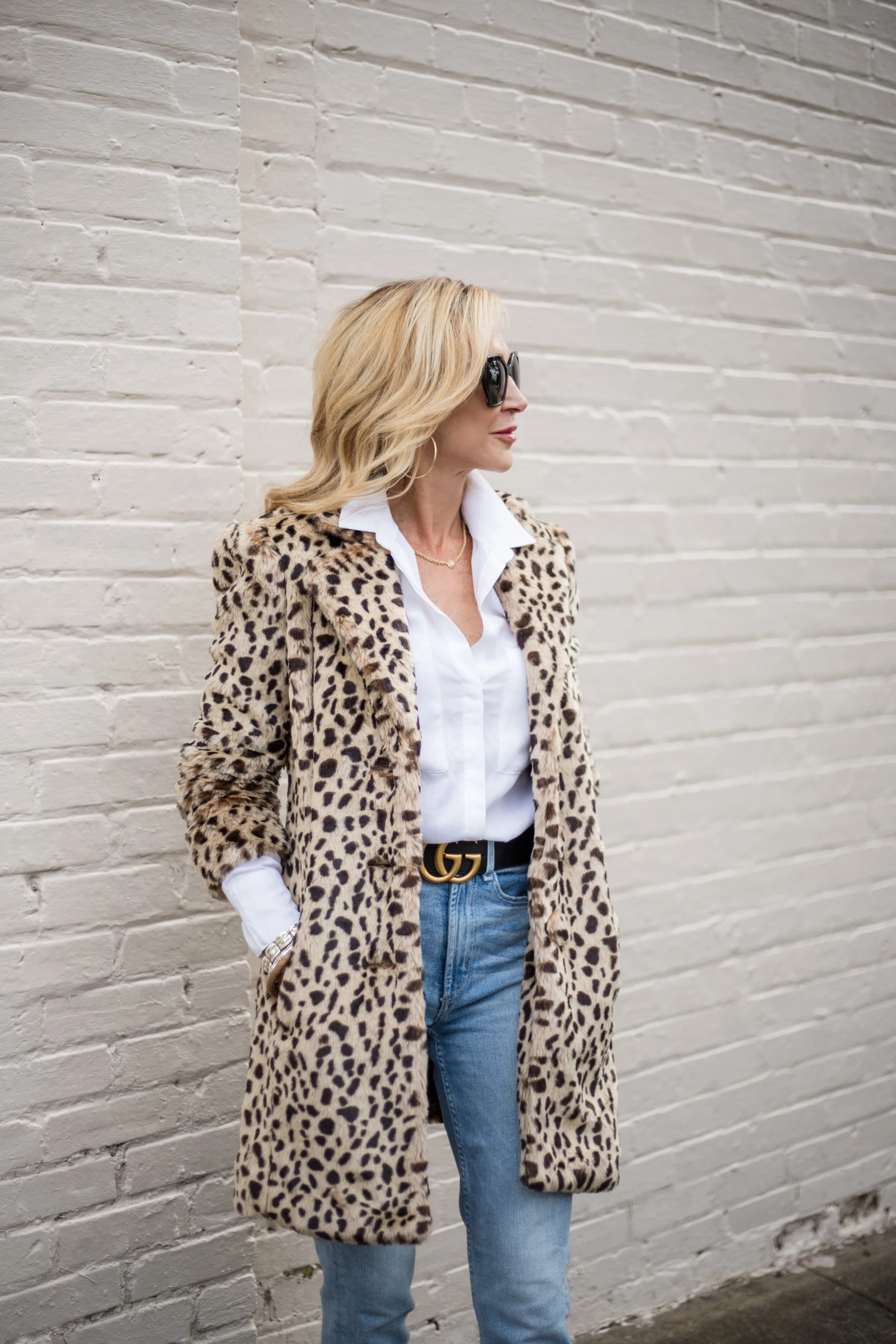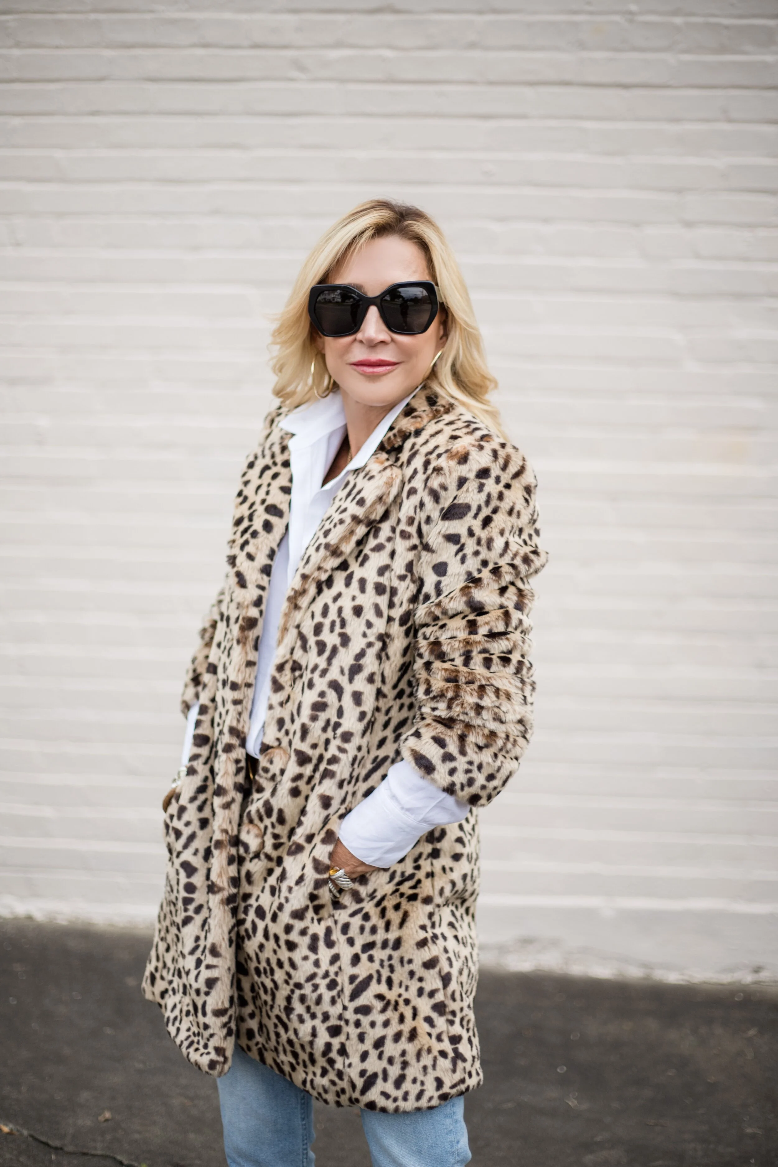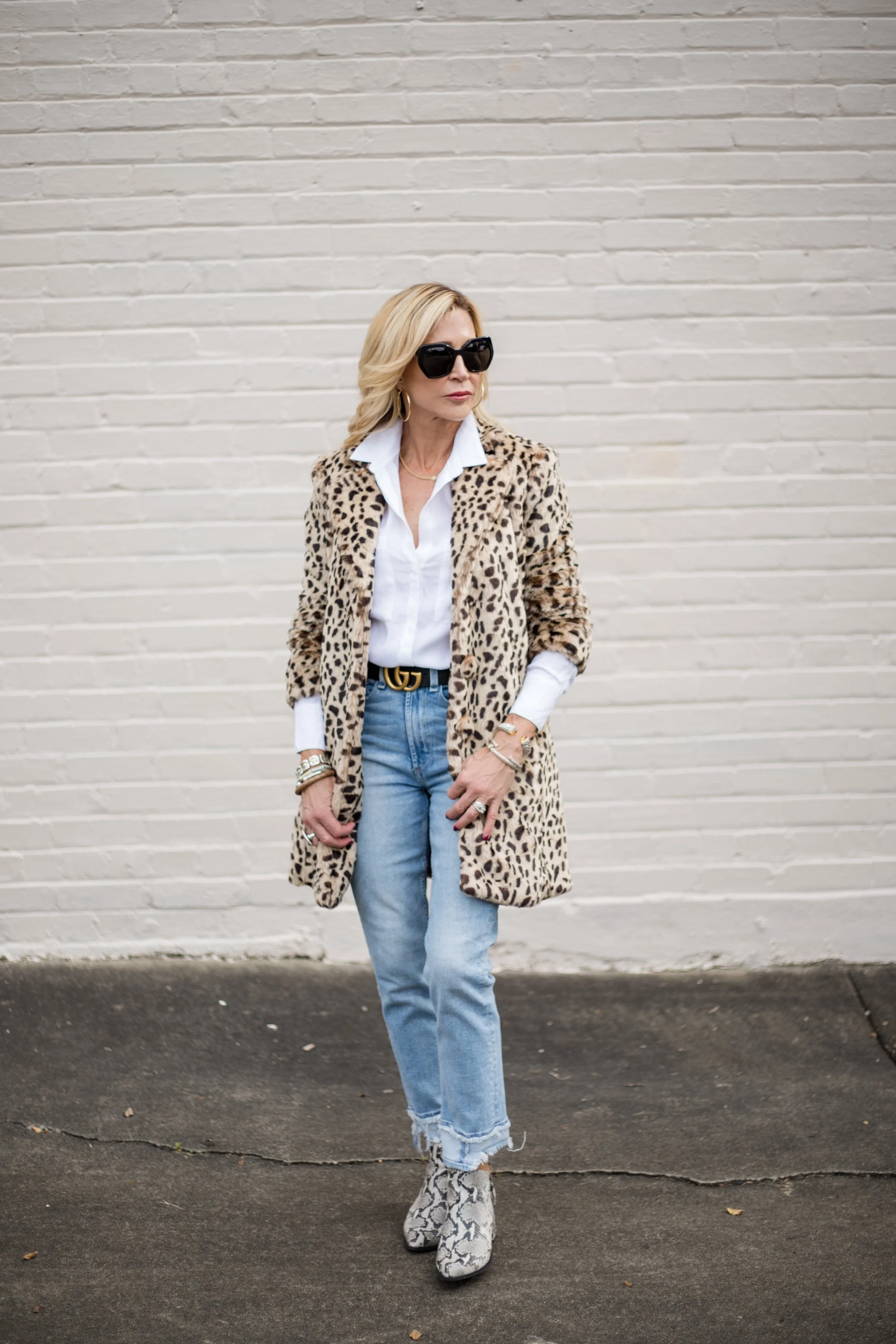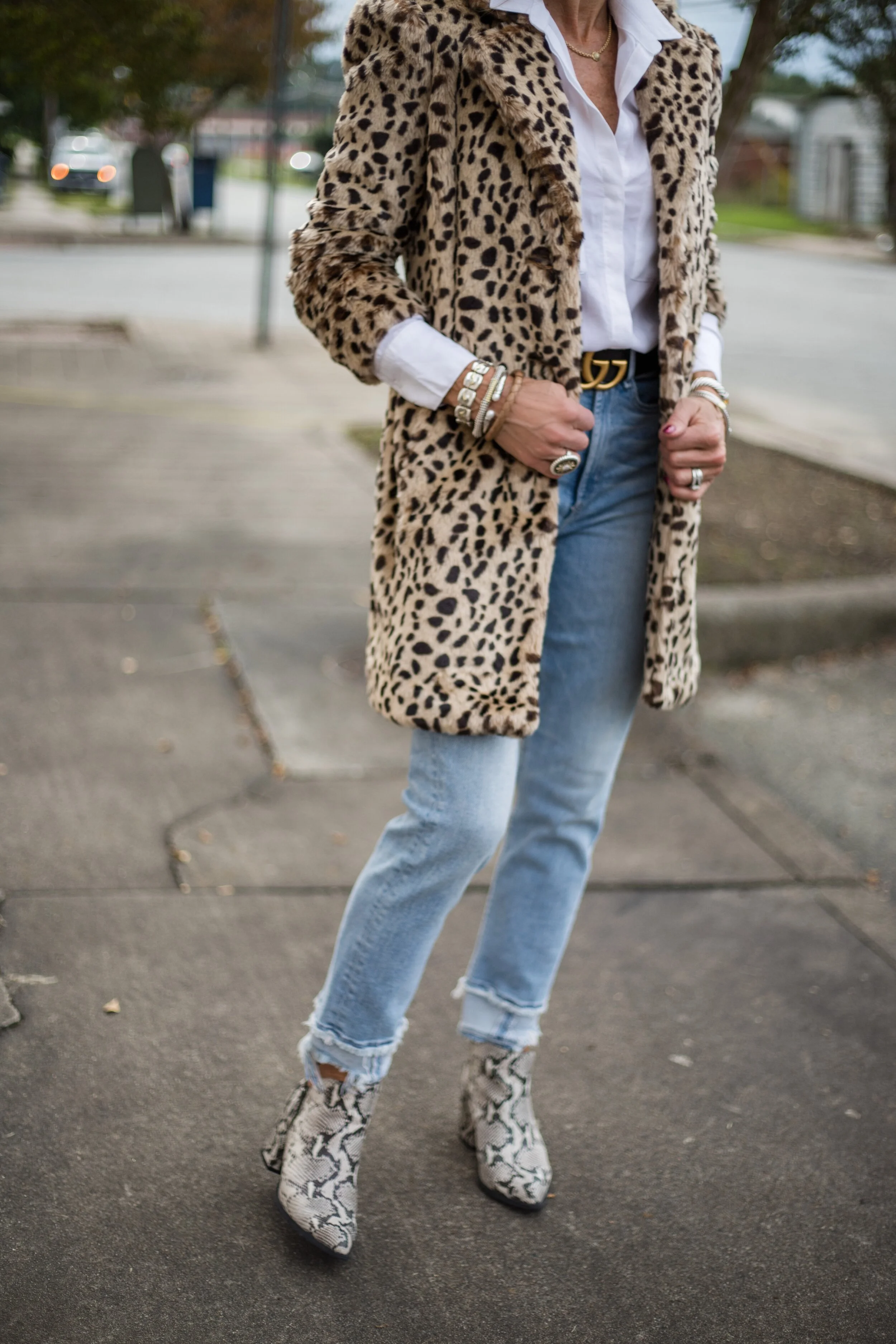 A faux fur leopard print coat adds a bit of luxuriousness to any outfit… plus it’s really warm! I’m not afraid to mix prints and even though this coat makes a statement, I decided to add the snakeskin booties…just for fun! The great thing about this look is that you can easily dress it up, by wearing a different bootie or pump.