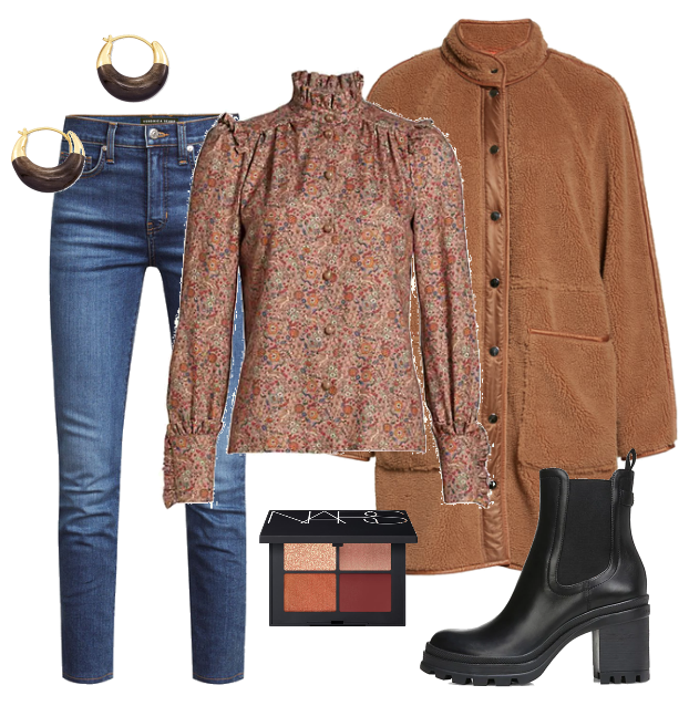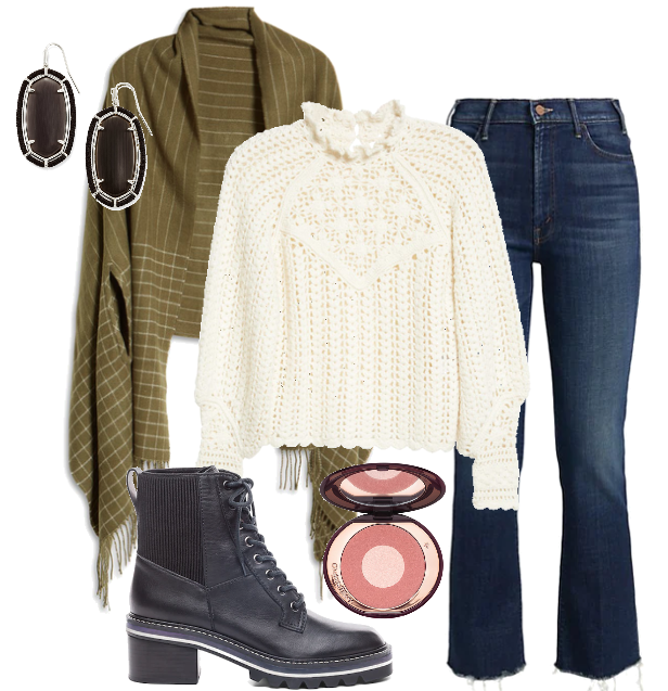 I’m loving the Victorian feel of the sweater above combined with the lace-up lug sole boots in this outfit. The jeans are cropped so you can really show off the shoe! Add a cute scarf and coordinating earrings and you’re good to go!