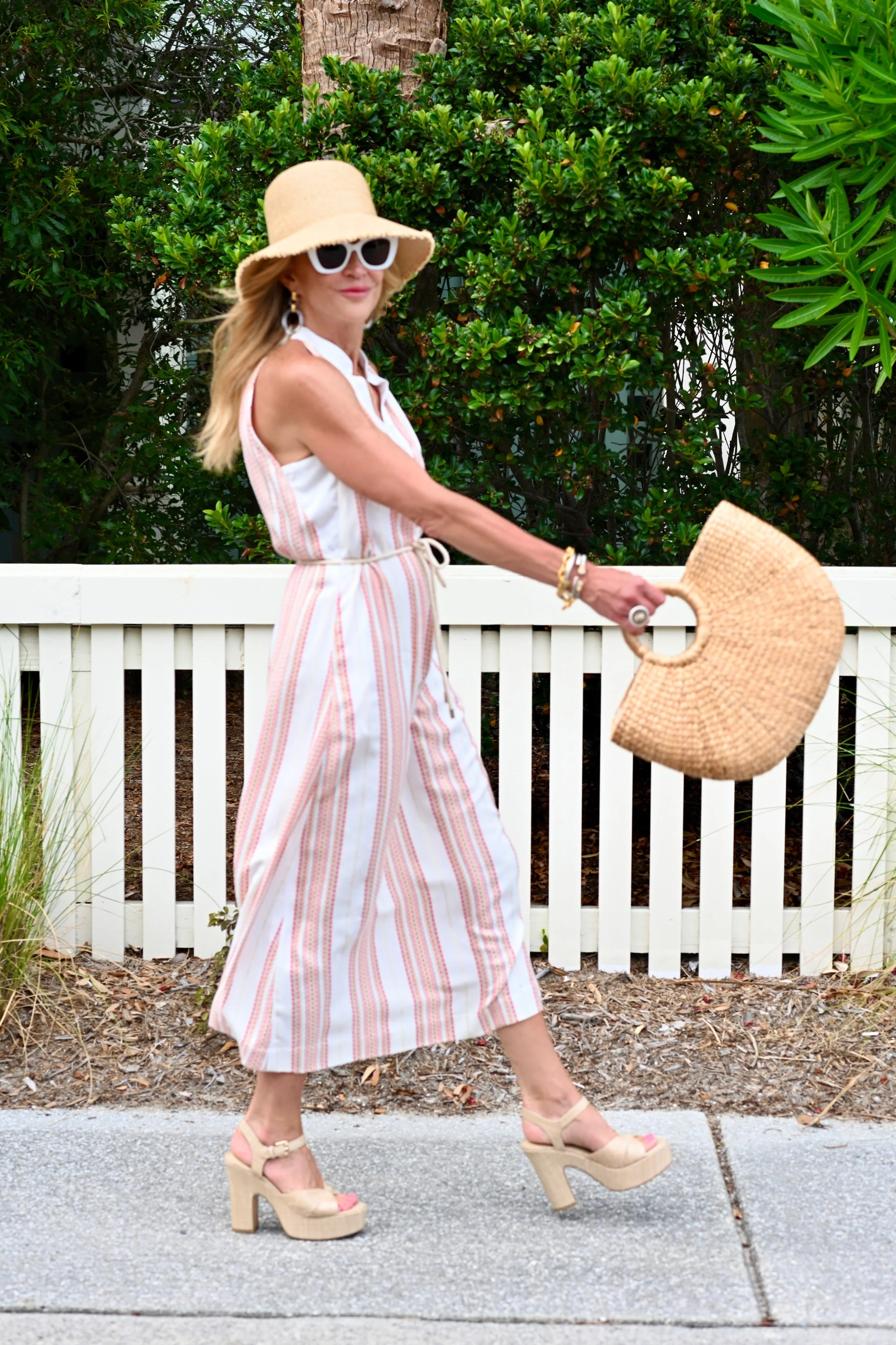 I can’t imagine a more perfect summer dress to beat the heat and humidity at Bald Head Island! It’s a lightweight cotton with pink and orange stripes and just a touch of metallic thread. It’s just loose fitting enough and the rope belt gives it definition! I paired it with my raffia sandals from Marc Fisher that I’ve worn non-stop this season, a bag from Target, my favorite bucket hat from Eric Javits and white sunglasses. Such an easy coastal chic look!