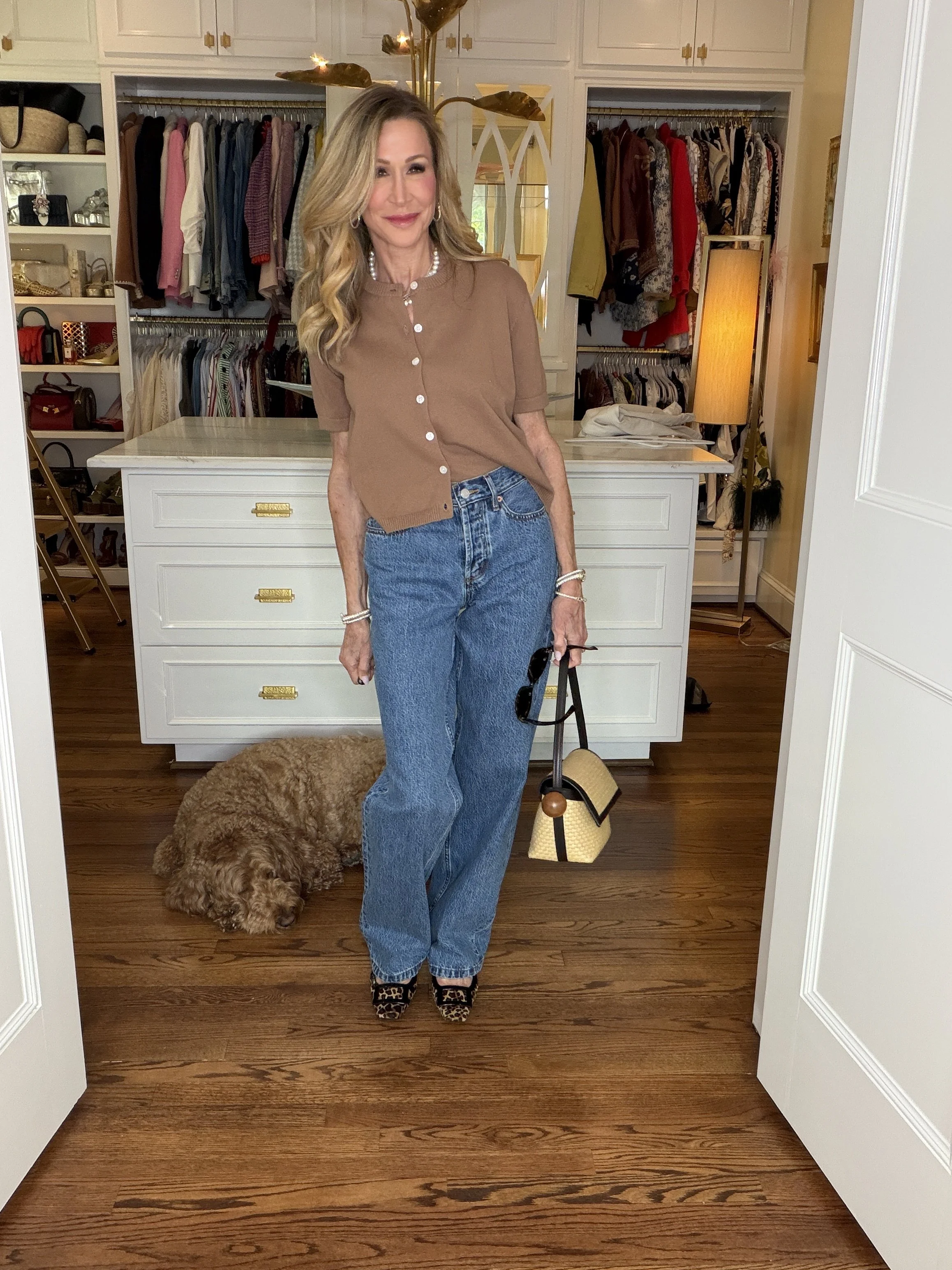 This look is so easy, but actually, well thought out! The tan short sleeve cardigan is from Perfect White Tee and is paired with looser fitting jeans from Still Here. The jeans are nipped at the waist and slightly fitted through the hips so they work well with the boxier cardigan. I added the Roger Vivier leopard sling backs and a more structured bag (similar here) to dress things up a bit. This is a perfect look for a day when you want to be casual but still look really put together!