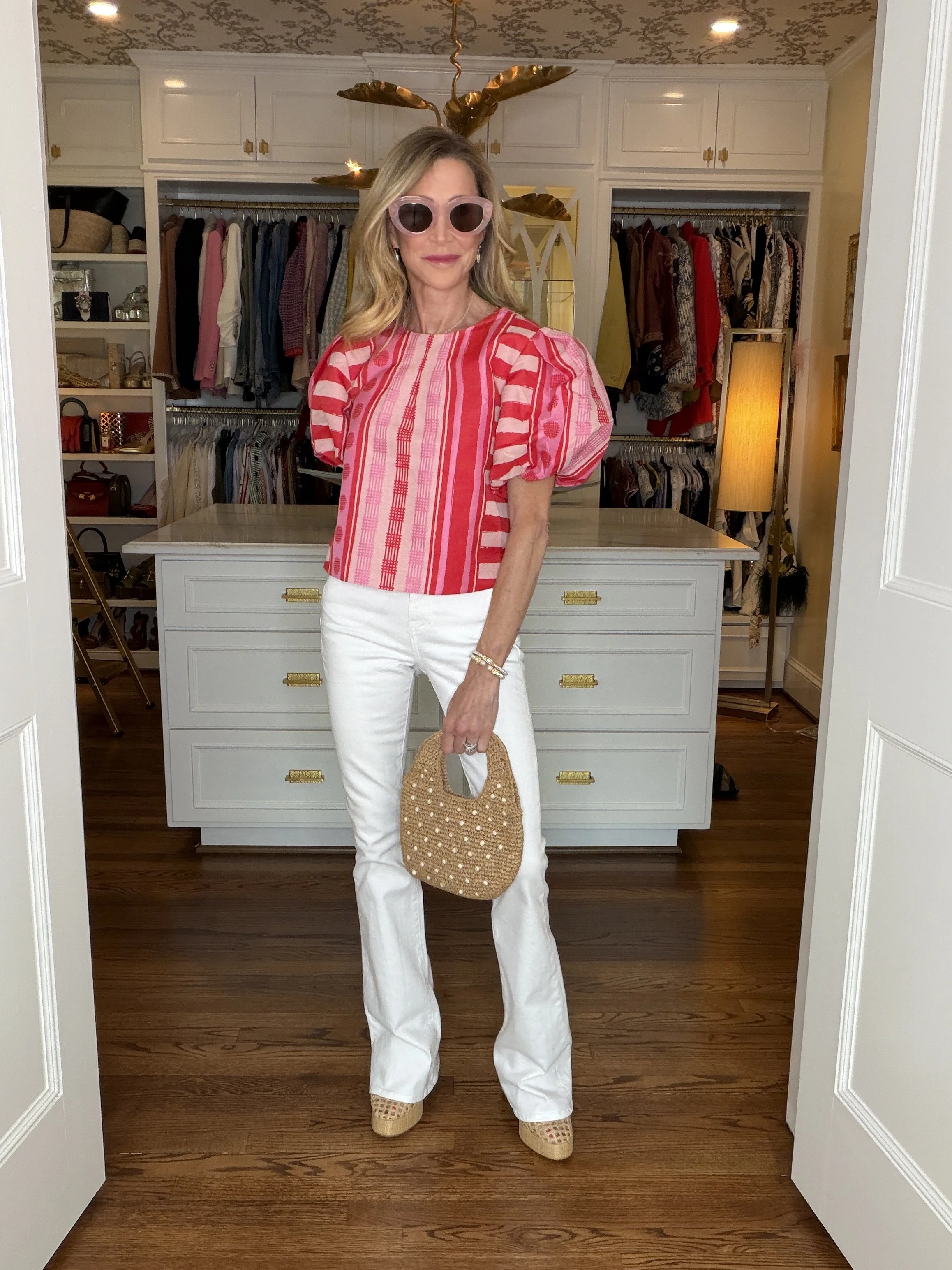 This top from Emily McCarthy made me do a double take! The puff sleeves, the pink and red color combo, the stripe... it's a lot in the best possible way. White skinny flare jeans from Veronica Beard, woven platform sandals from Steve Madden and a rattan bag (similar here) plus pink sunnies…done! Wear this when you want to stand out!