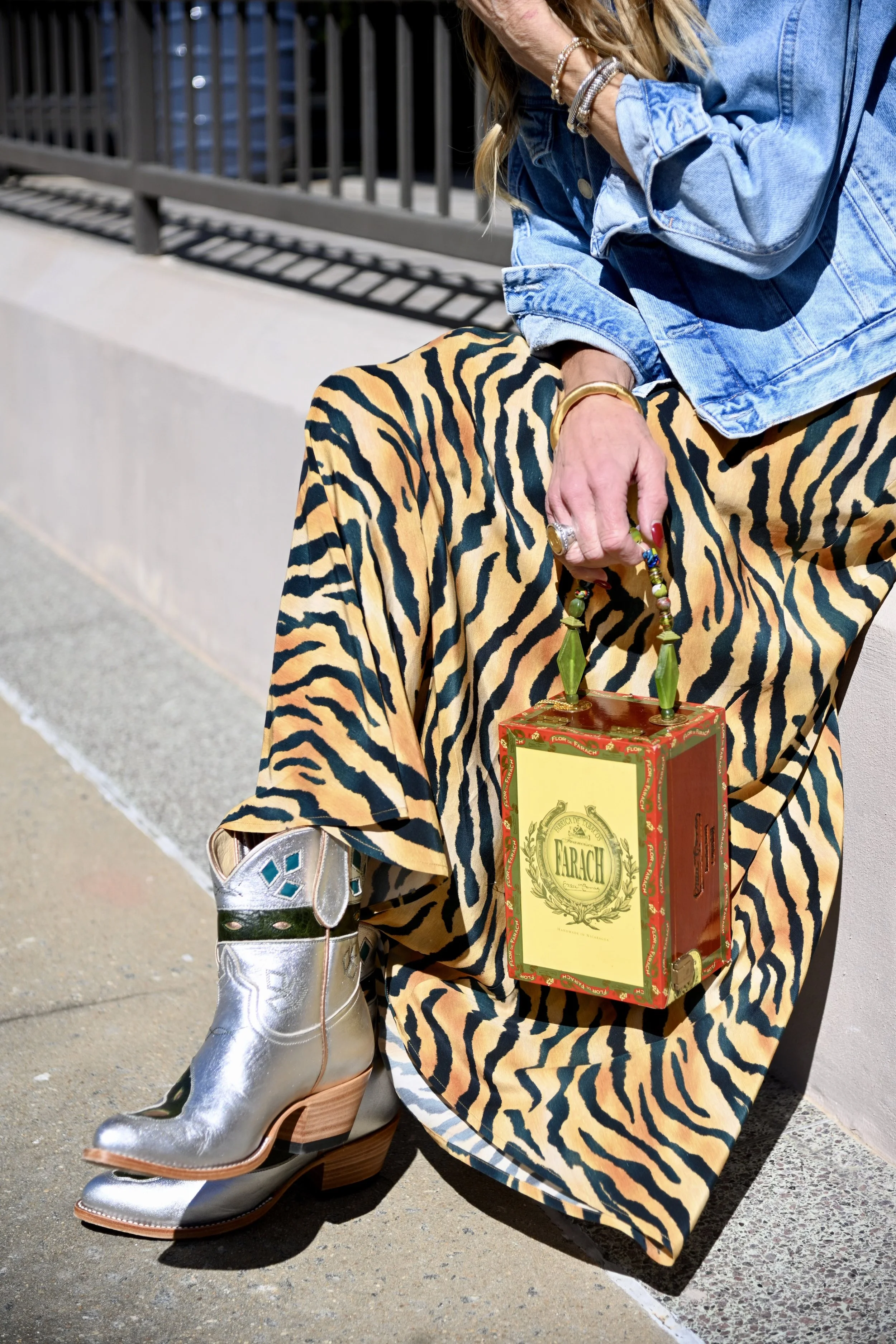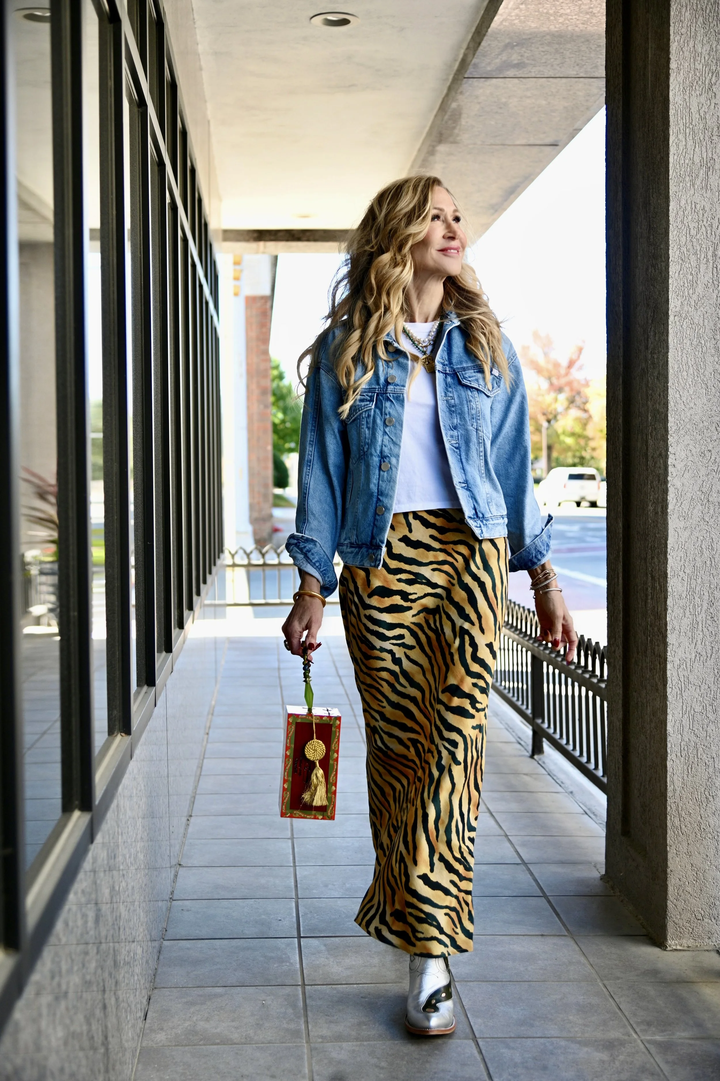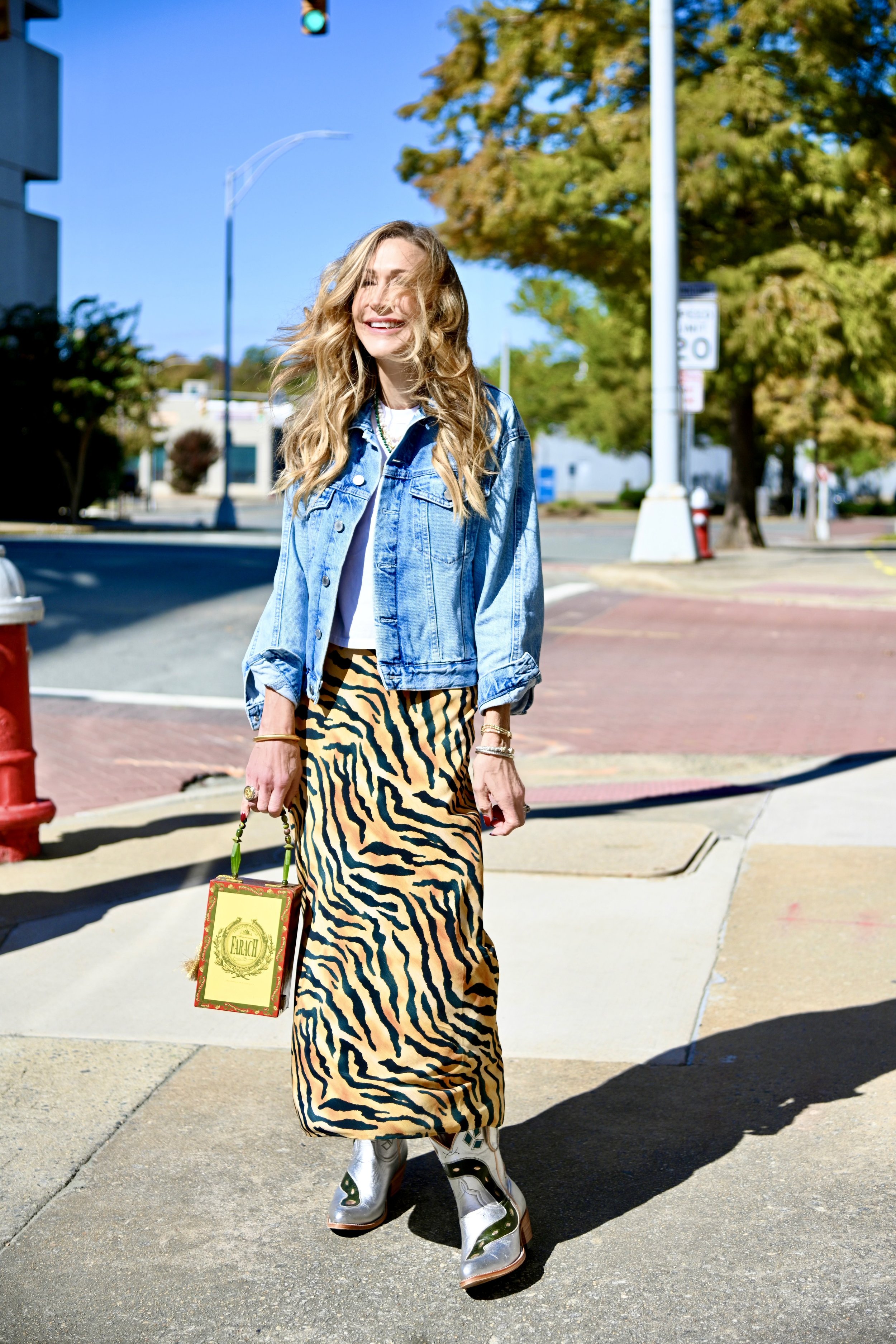 How much fun is this outfit? It feels easy yet definitely makes a statement…it’s a little unexpected and that’s just how I like it! The skirt is from Hunter Bell and I purchased it at a local boutique called Brown. I loved it the minute I saw it and when I tried it on, I knew it would be mine! The cowboy boots (also from Brown), and the unusual cigar box handbag that I purchased at a thrift store years ago make the outfit and I think they’re perfect accessories! I added a simple short sleeve white tee, an older denim jacket and a necklace from Hart for a casual kind and of funky but well thought out look! I actually wore this outfit to have wine with friends last week!