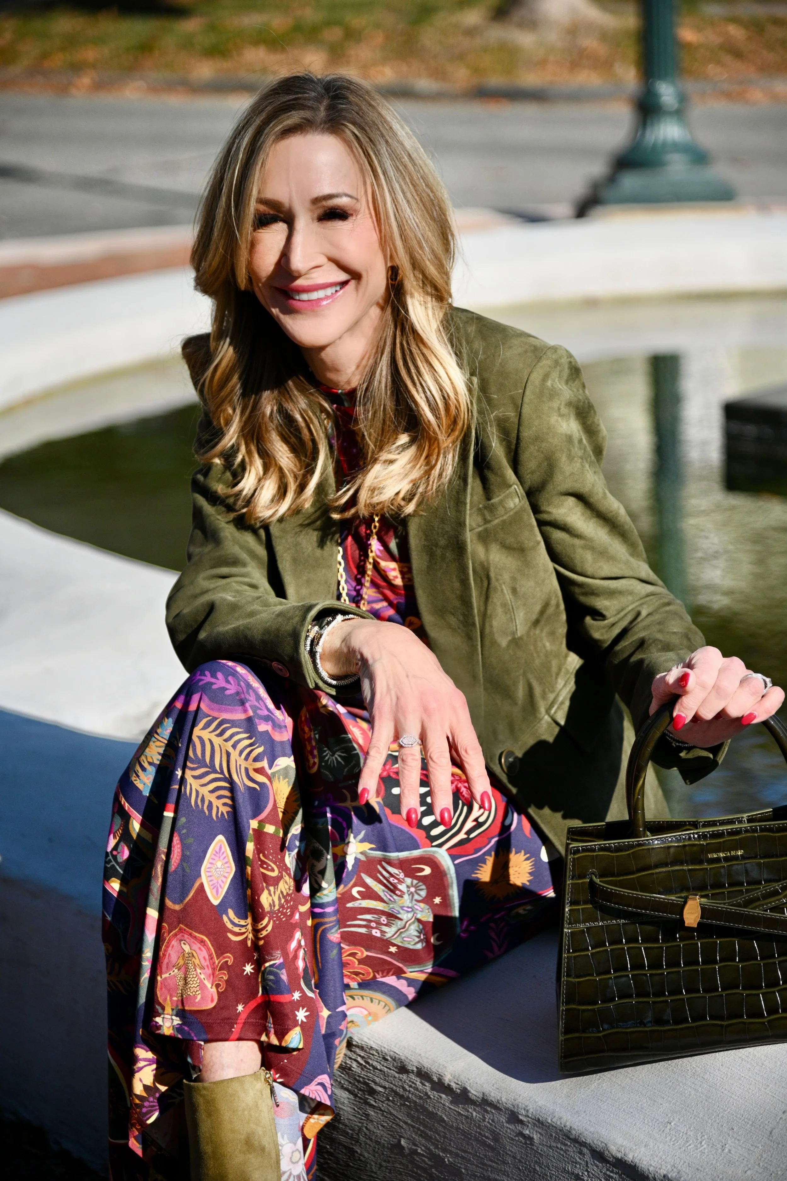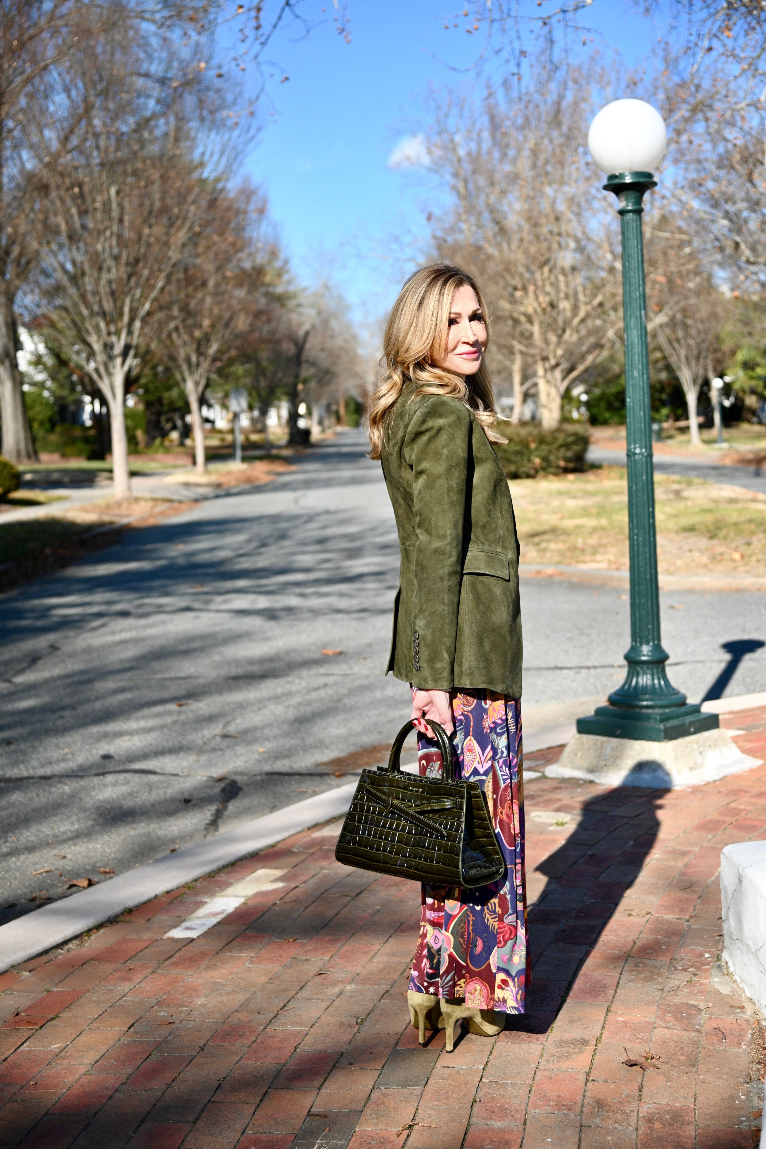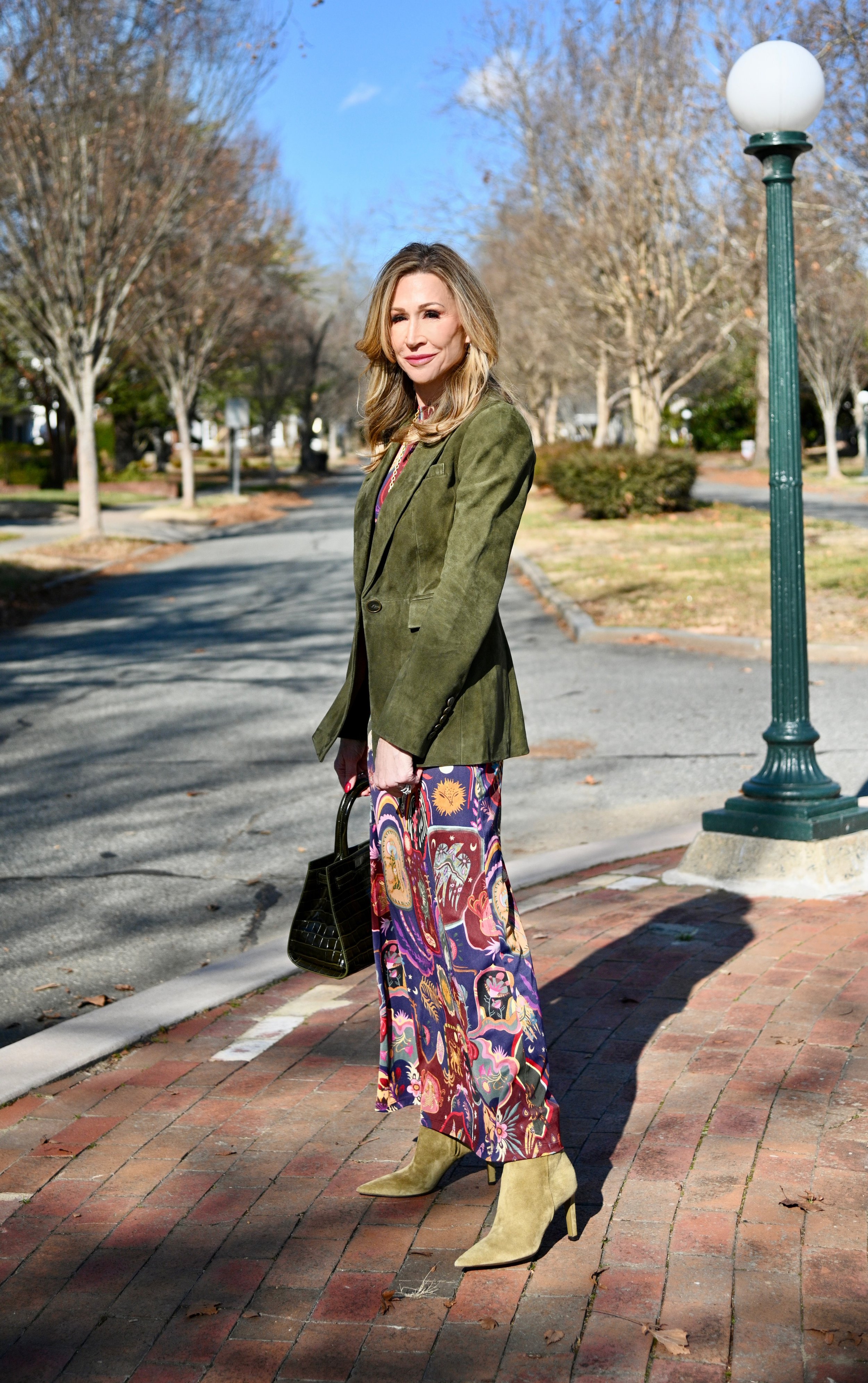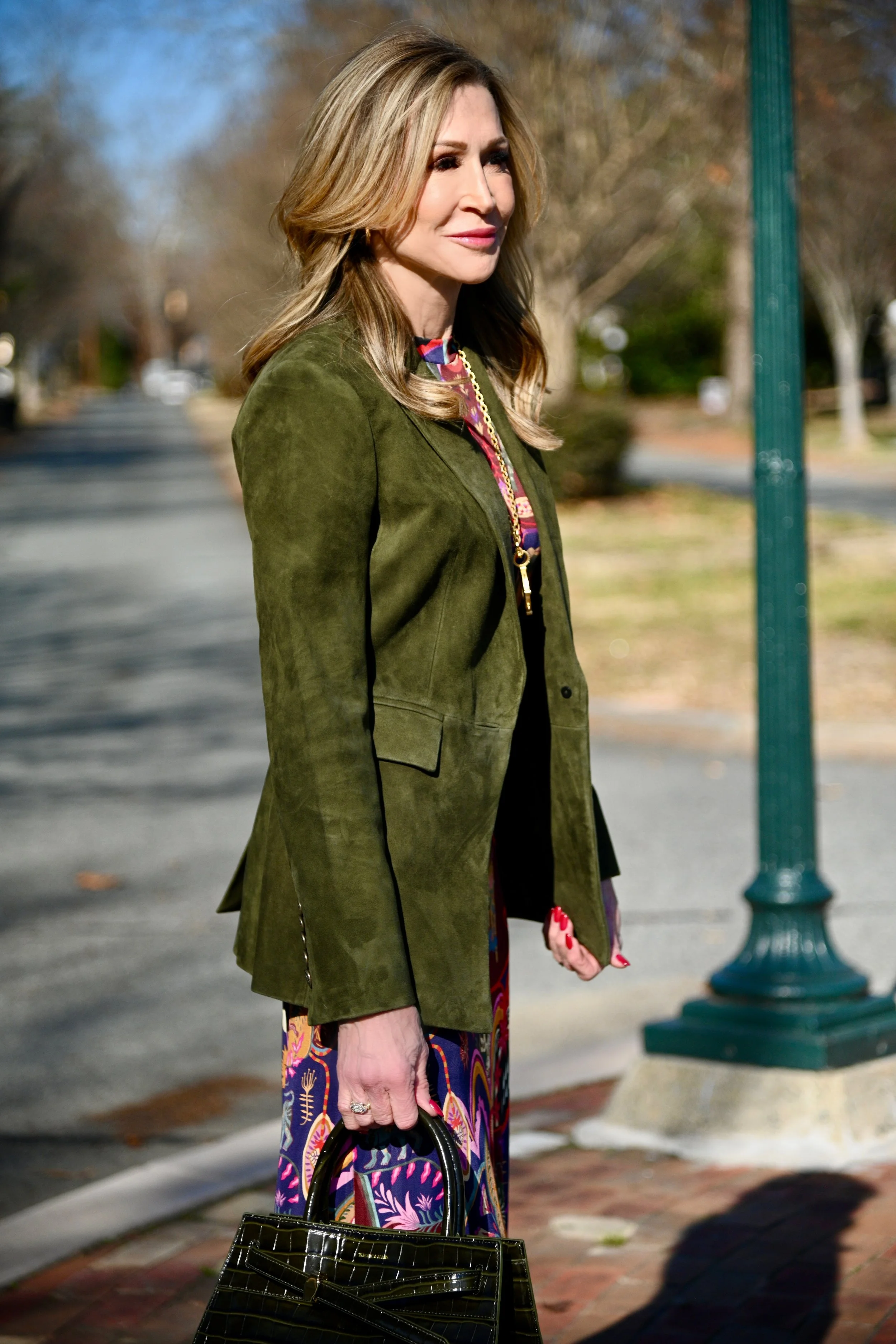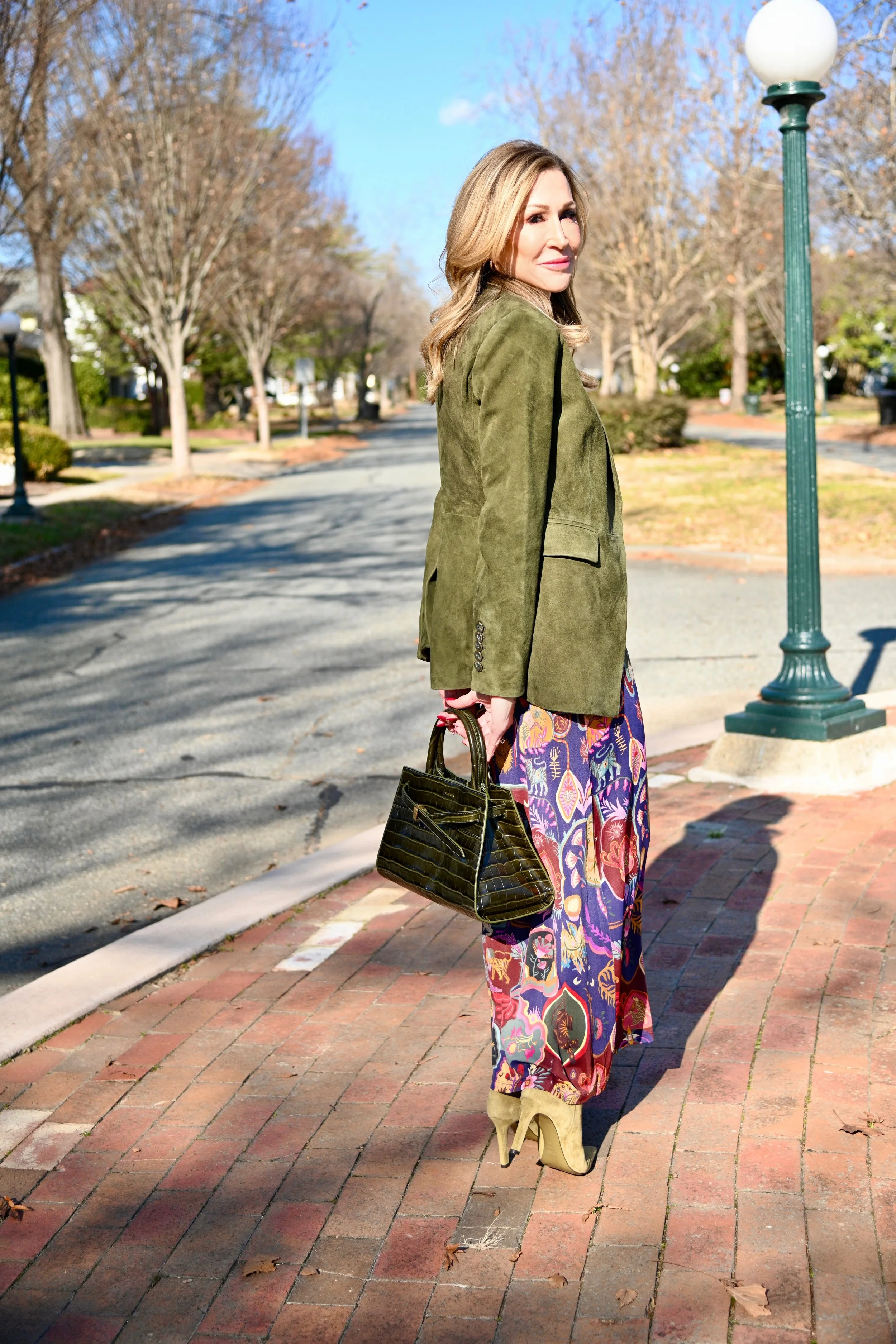For this shoot, I pulled out my Veronica Beard green suede blazerβ¦the one my husband bought me when we were in NYC back in December. I was immediately drawn to this blazer and when I tried it on, it fit perfectly! I walked over to the mirror to admire it and he looked at the sales girl and saidβ¦βweβll take itβ! I had no idea that was coming and it was such a nice surprise! There's just something about wearing a piece attached to great memories! If you're looking for suede blazer outfit inspiration, this blazer has already become one of the hardest-working pieces in my closet. Today, I layered it over this gorgeous patterned maxi from Farm Rio, and I love how it brings together polished and playful in just the right way. The green suede pulls out those earthy tones in the dress while adding a little structure to Farm Rio's signature bohemian vibe (itβs such a fun brand!). I also wore my pistachio green suede booties (another surprise from NYC) and they really were just perfect although a black bootie would be an amazing choice as well!