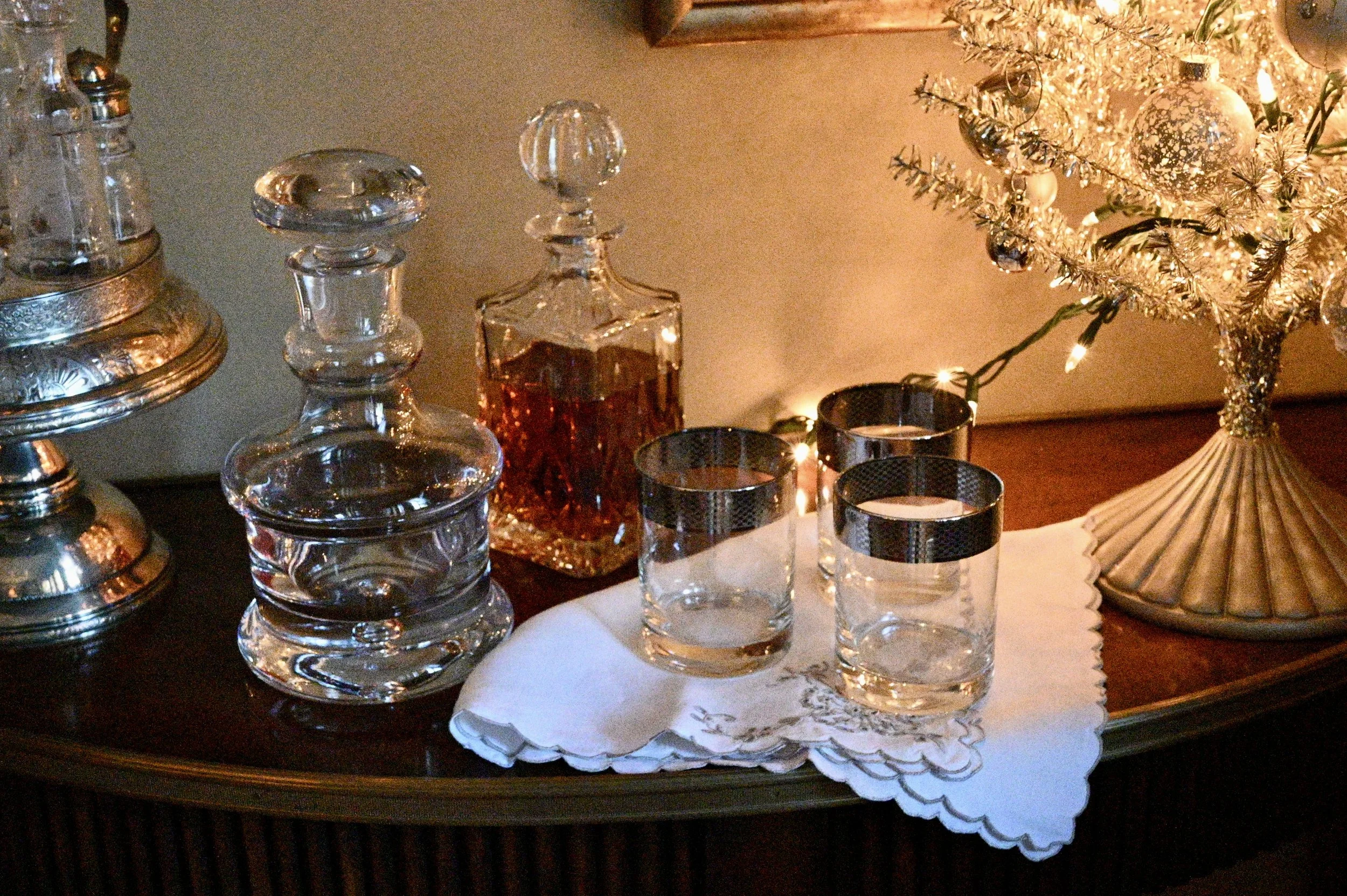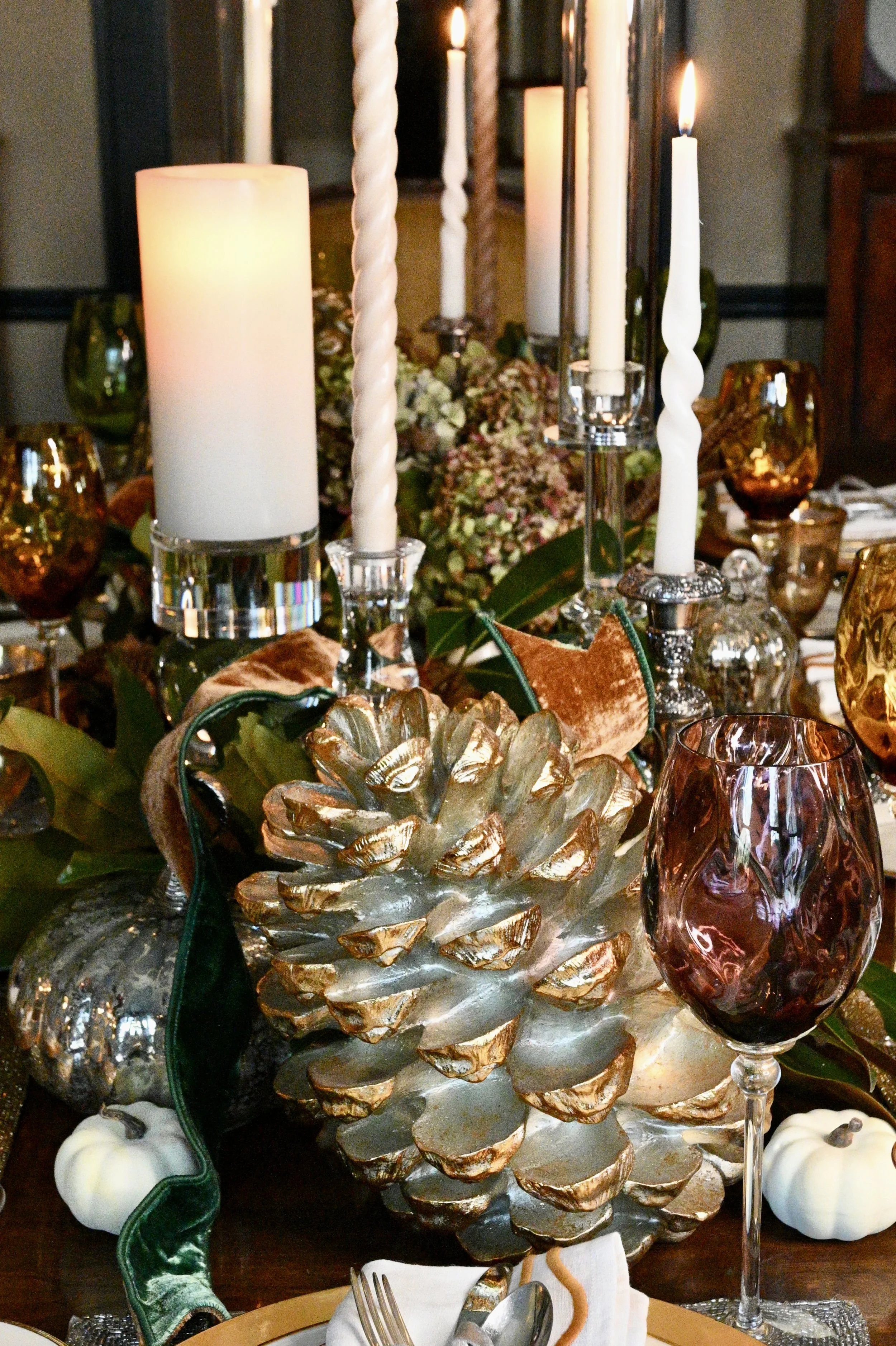 My friend Kim of Tables Pour Deux came by and helped me tweak my Thanksgiving table and I love how it turned out. For the place settings, I used a mix of gold and silver beaded placemats, gold chargers, Lennox china combined with vintage Spode India Tree dessert plates and napkins from Misette. Iβve had the colored wine glasses forever and have no idea who makes them. I got the fabulous gold pine cones at Creme de la Creme in Richmond, VA and love love them! The glass candleholders came from all over but Iβll link a few similar in a boutique at the end of the post!