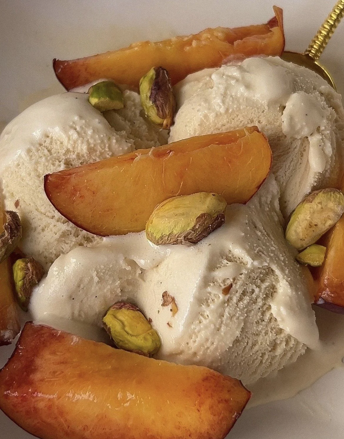 Peaches are still in season and would be so amazing with vanilla ice cream, roasted pistachios and a drizzle of honey…simple but delicious end of summer dessert…you could even grill or sauté the peaches and serve it all over a piece of toasted pound cake!