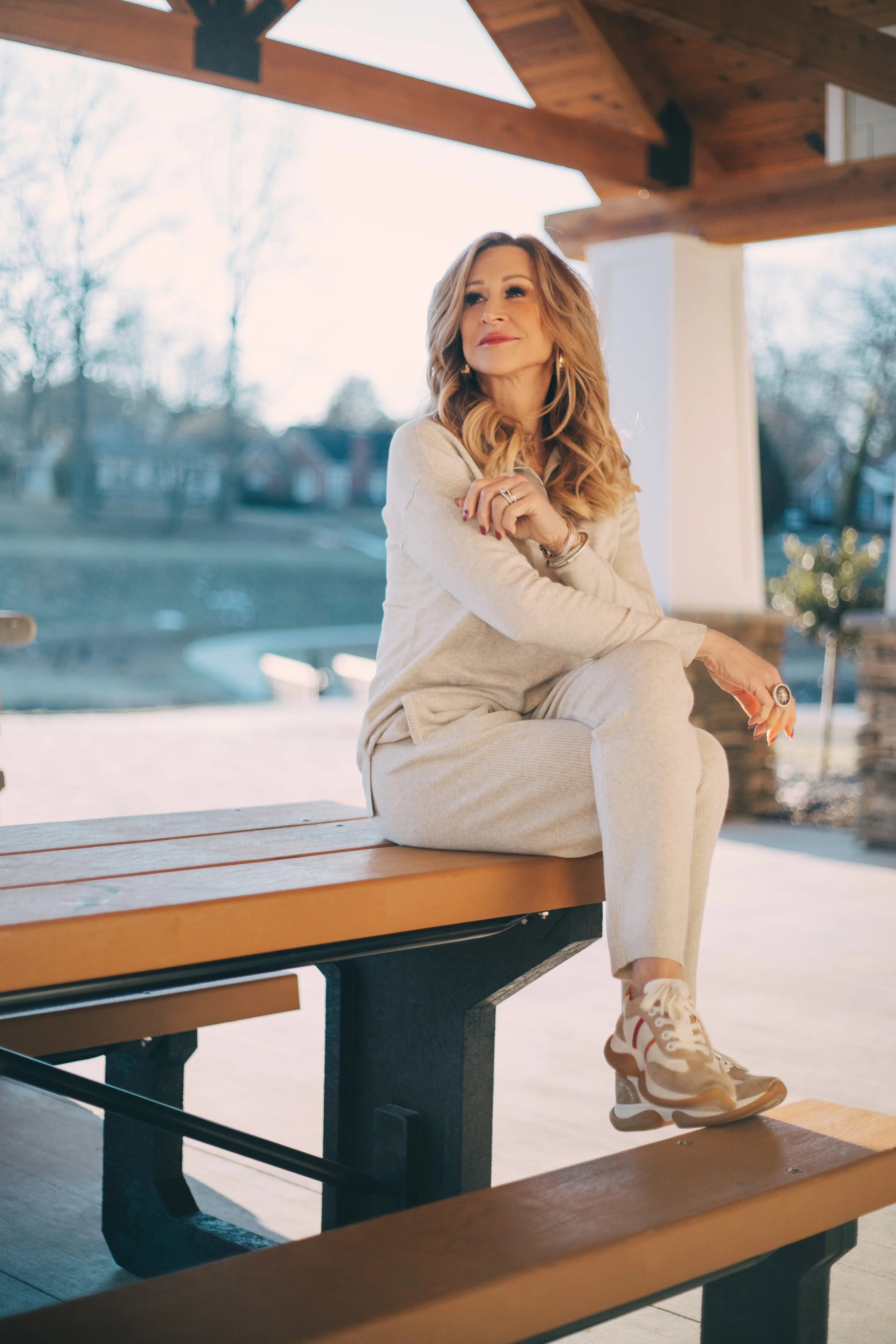I honestly love this cotton/cashmere set so much! The satin detail on the top gives this set added polish and it is indescribably soft! You’ll live in these pieces! My sneakers are from Tory Burch and I’ve linked similar!