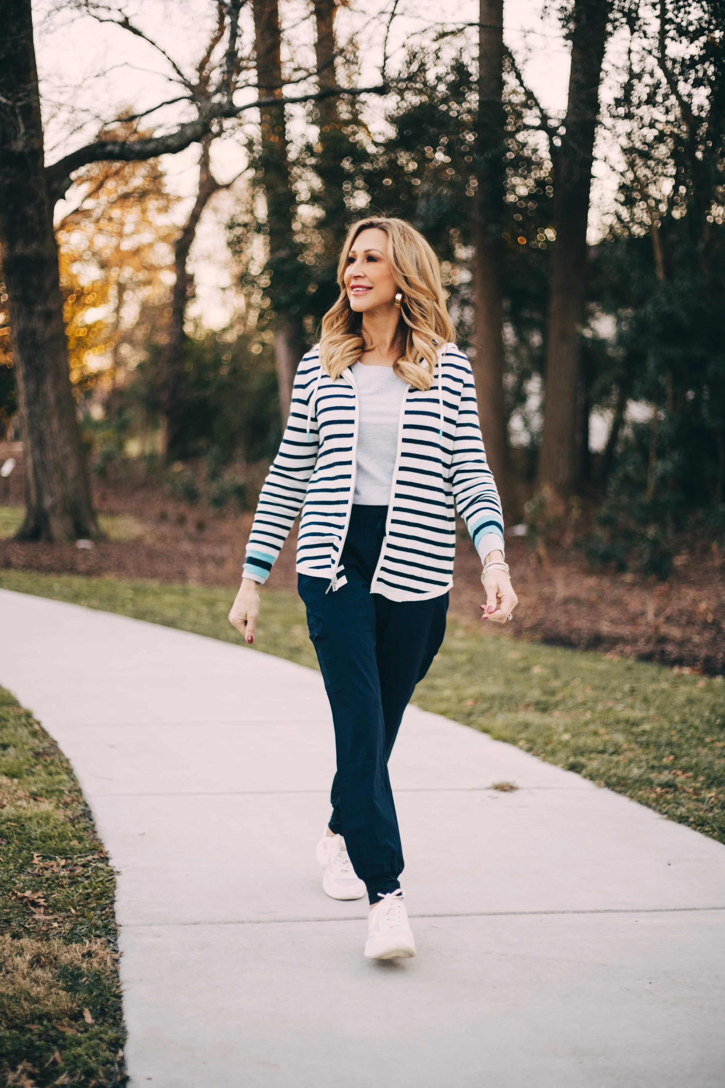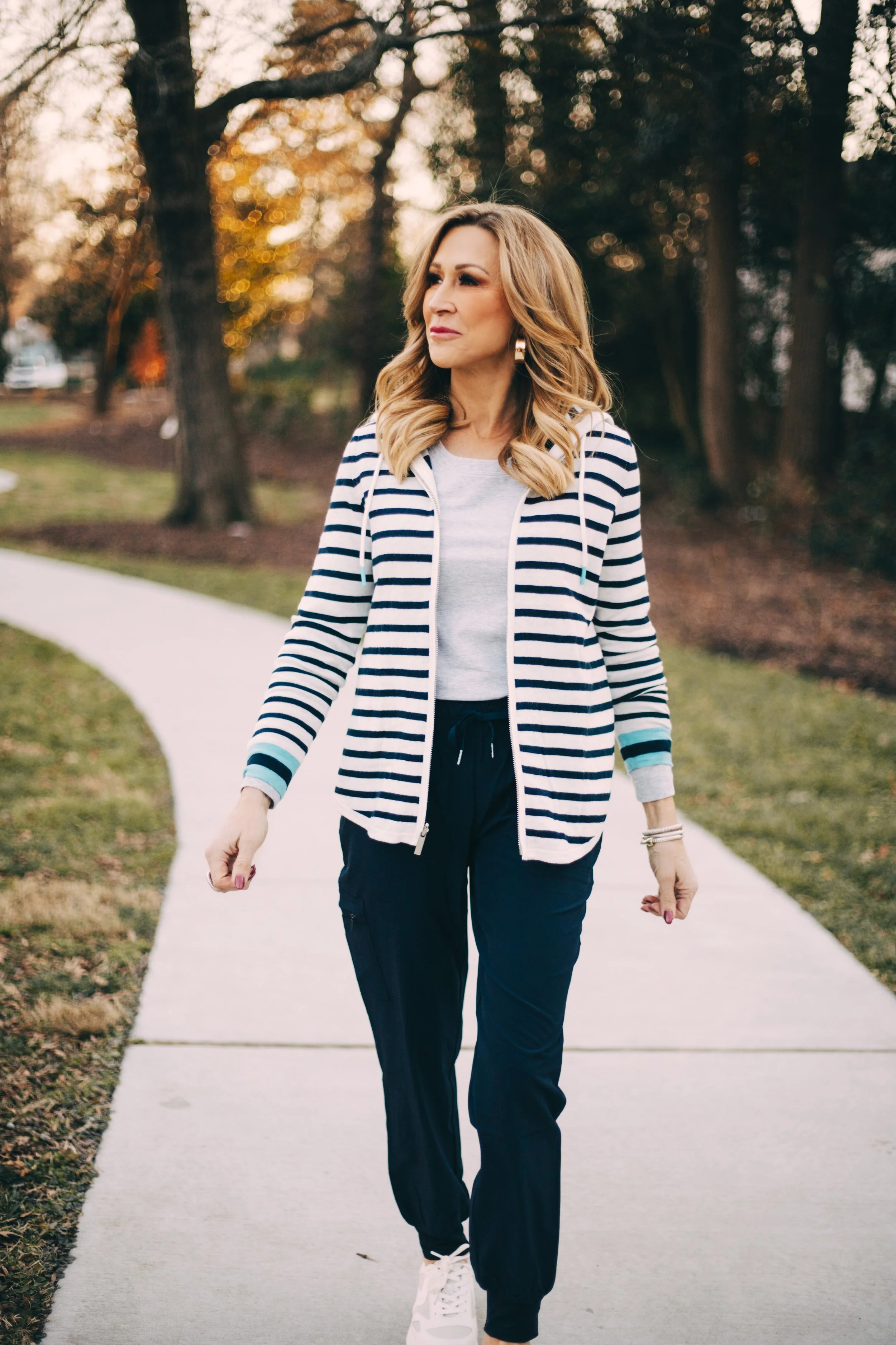 Stripes are always a classic and especially going into spring. This jacket is reversible so it’s two in one and will take you so many places! It will go with jeans and shorts as the weather gets warm. I’ve paired it with a grey long sleeve tee and the cutest navy joggers!