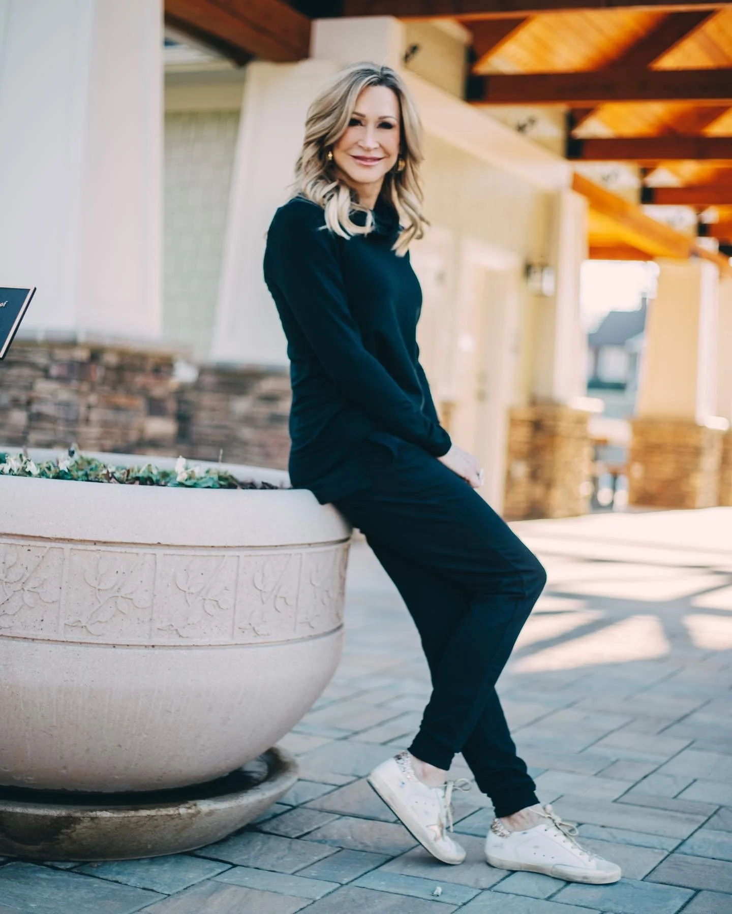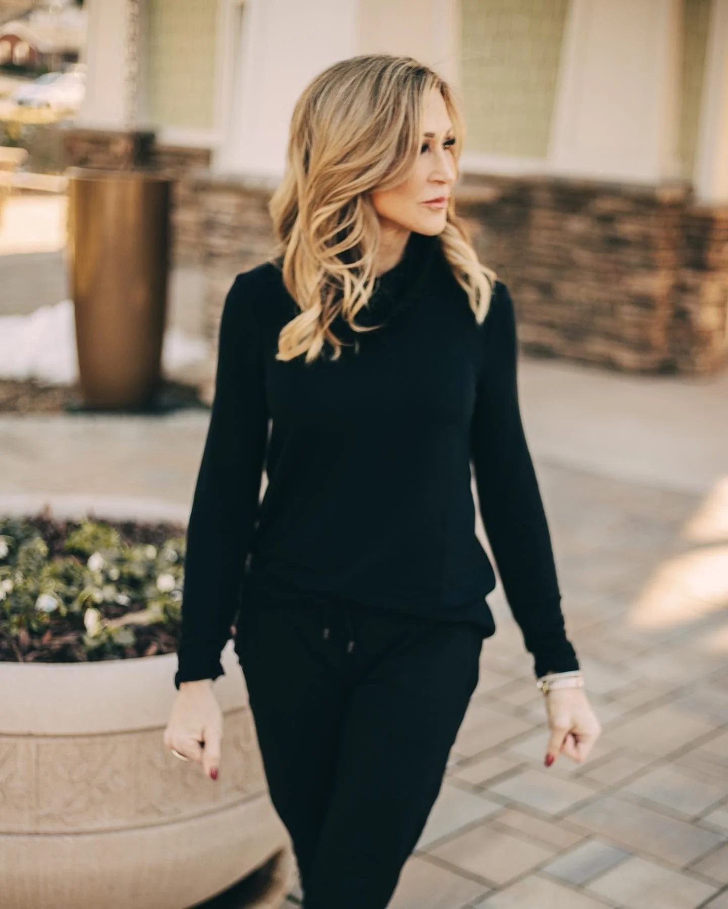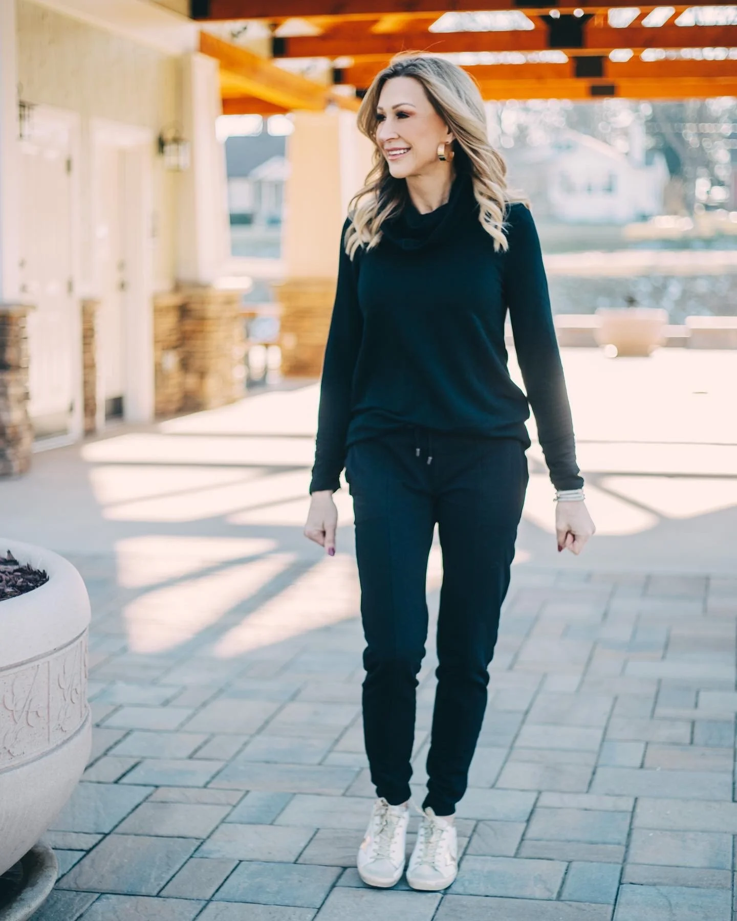 There is nothing more chic than all black, even when it comes to activewear! This cowl neck top is the most comfortable thing I’ve ever had on my body and the joggers are flattering and cozy. My Golden Goose sneakers add a little edginess to the look!