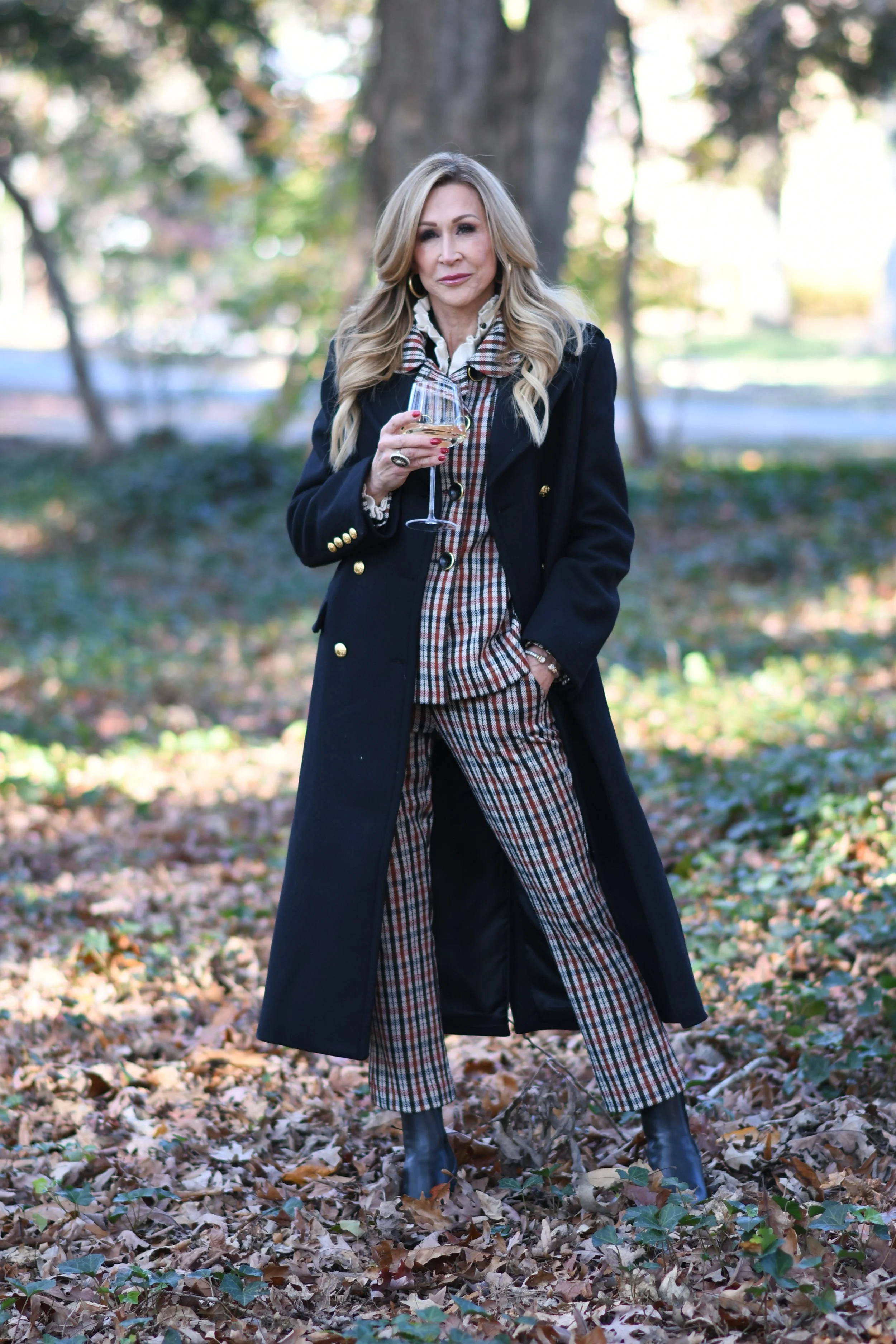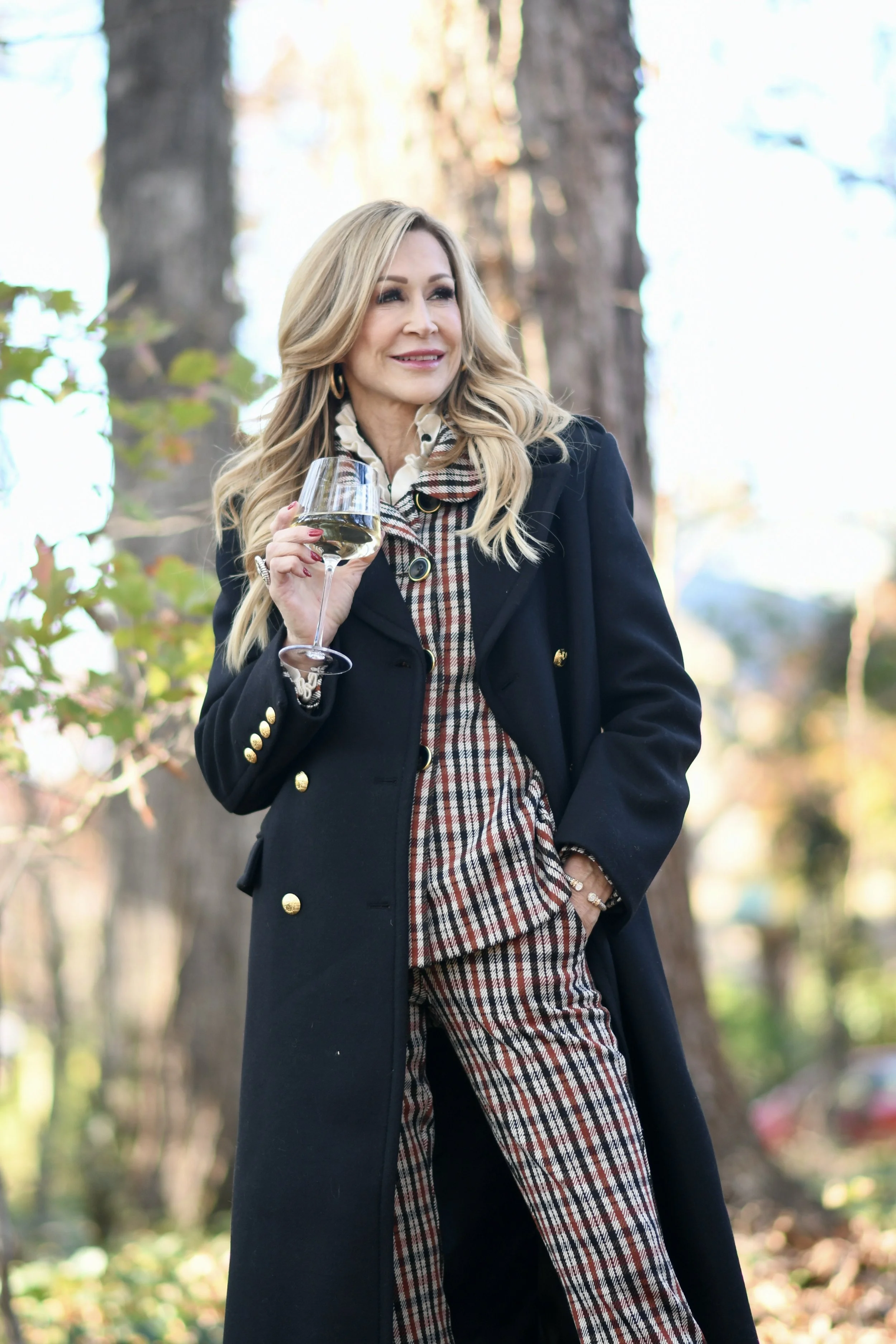 I’m wearing a suit and sweater from Cabi that I purchased last season and loved but haven’t worn often. I added my Prada Chelsea boots and a long black coat from Zara. I’m really in love with this outfit as it feels festive but also unexpected. As is often the case, it came to me suddenly as I was holding the coat thinking “what would be just a little out of the box to wear with this?”