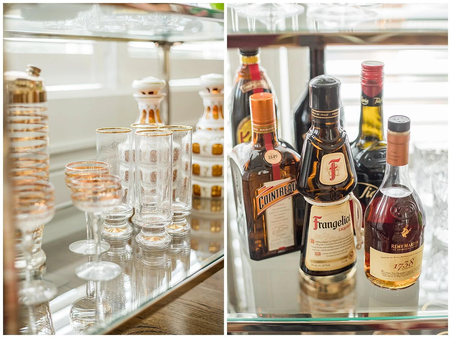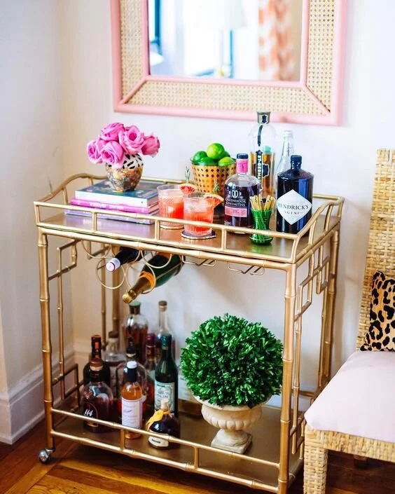 No bar cart…no problem. Use a chest or table that’s already in your home. Add a basket to organize bottles, flowers and/or a plant, glasses, and a candle and you’ll be party ready in no time!
