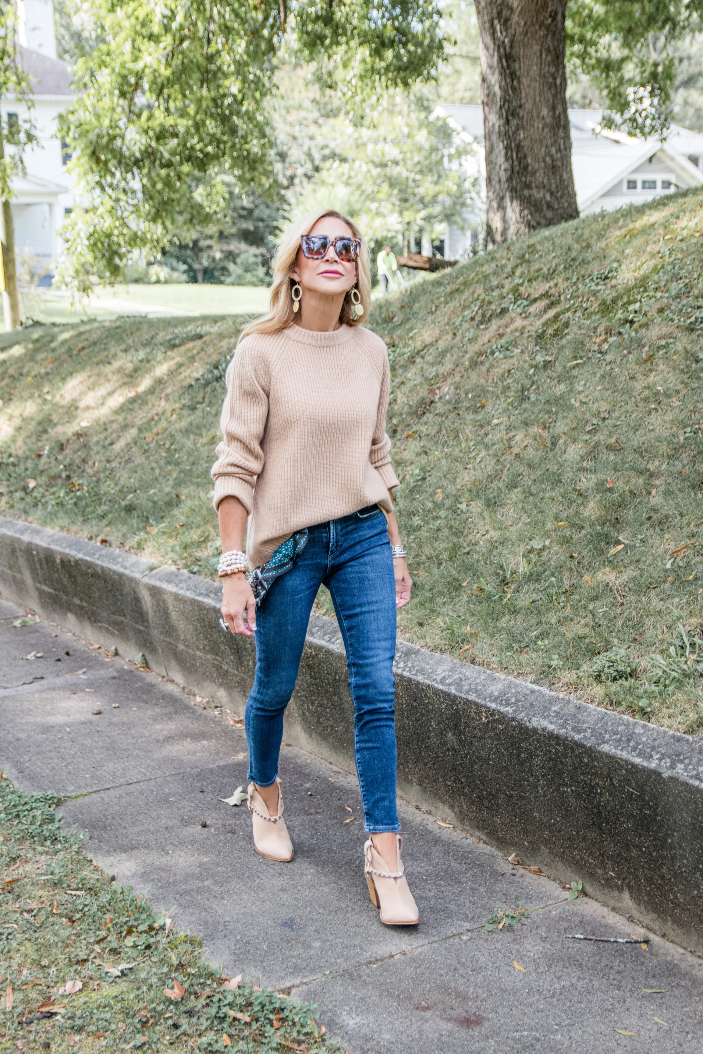 Iβm feeling all the fall vibes, but the weather just isnβt agreeing with me! I love a good basic sweater and the ones from Vince are probably my favorite. Theyβre beautiful and the quality is amazing! I jazzed up this sweater with fun booties from Chinese Laundry booties and a scarf belt from Cabi. I always wear a stack of bracelets on my arms and always include my pearls from Julie Miles. I think it makes my outfits just a little more interesting! Iβm completely obsessed with my Tezza sunglasses and theyβll go with everything this fall! This outfit went from basic and boring to fun and different with the addition of a couple of accessories! Iβm going to be using this scarf idea often!